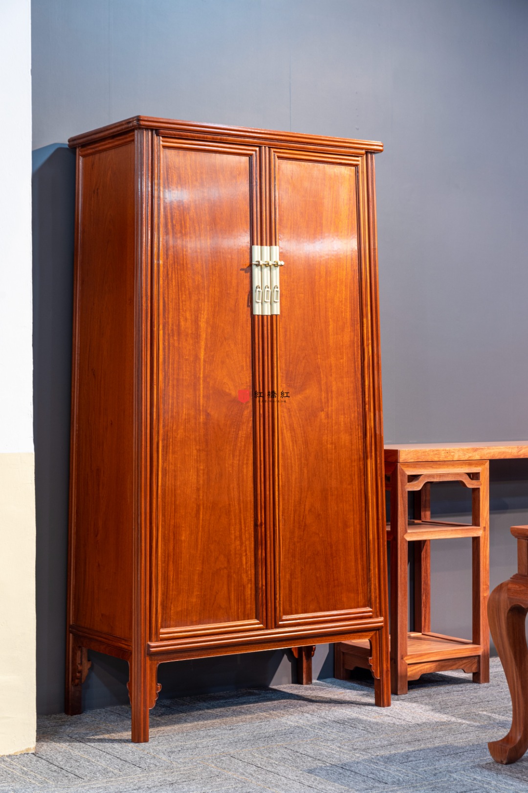 门下底枨之下安起线牙条格角接合叶形牙头,两端嵌入柜脚,上方齐头碰底枨,两侧亦安类似牙子,柜门门框、柜帮边枨、闩杆和门下底枨皆起双混面。