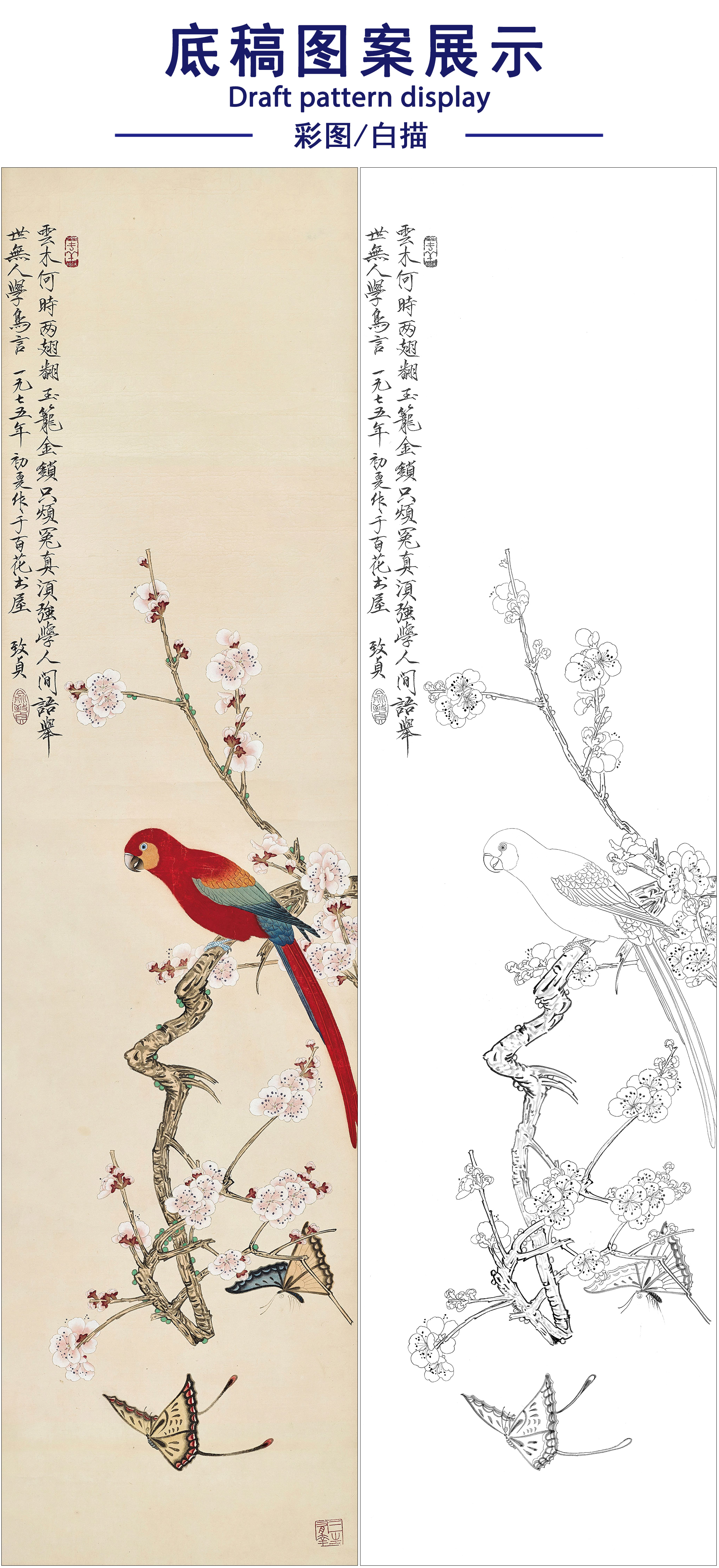 俞致贞花鸟工笔画白描底稿《梅香蝶舞鹦鹉红》临摹勾线高清打印稿ZZ75