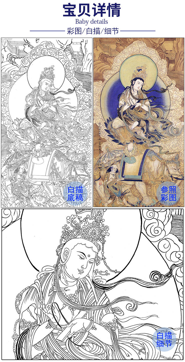 竖幅工笔人物白描底稿清 佚名-《普贤菩萨图》观音佛像-多种白描尺寸可选-SF06