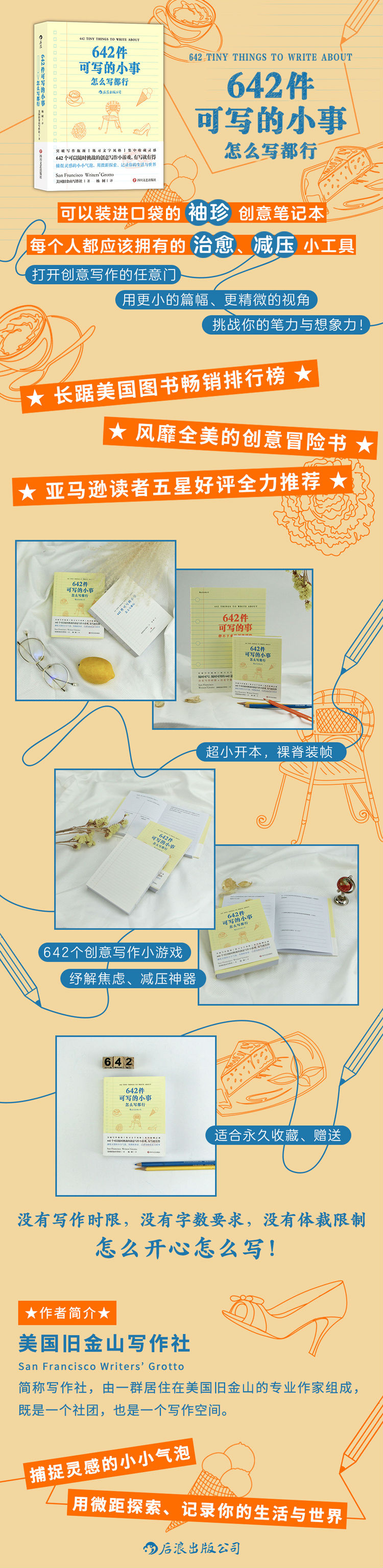 本书由美国旧金山写作社(San Francisco Writers’ Grotto)的作家成员共同完成,全书有642个天马行空的写作题目,每一个题目都互不重复,古怪、好玩又实用。这是一次关于写作的创意冒险,你需要独自探索、亲自完成。在这场奇妙的智力和文字游戏中,一个个看似互不相关的题目组成了整个蕴含巨大能量场的写作迷宫,它既能为有意进行文字创作的读者提供写作方向和灵感,又能为热爱探索和幻想的你提供放松和天马行空的场域。打开这扇创意写作的“任意门”,你也可以创造属于自己的温暖文字避难所。与《642件可写的事》相比,本书关注点更小、更为细致,袖珍版的开本也可以轻松装进口袋。