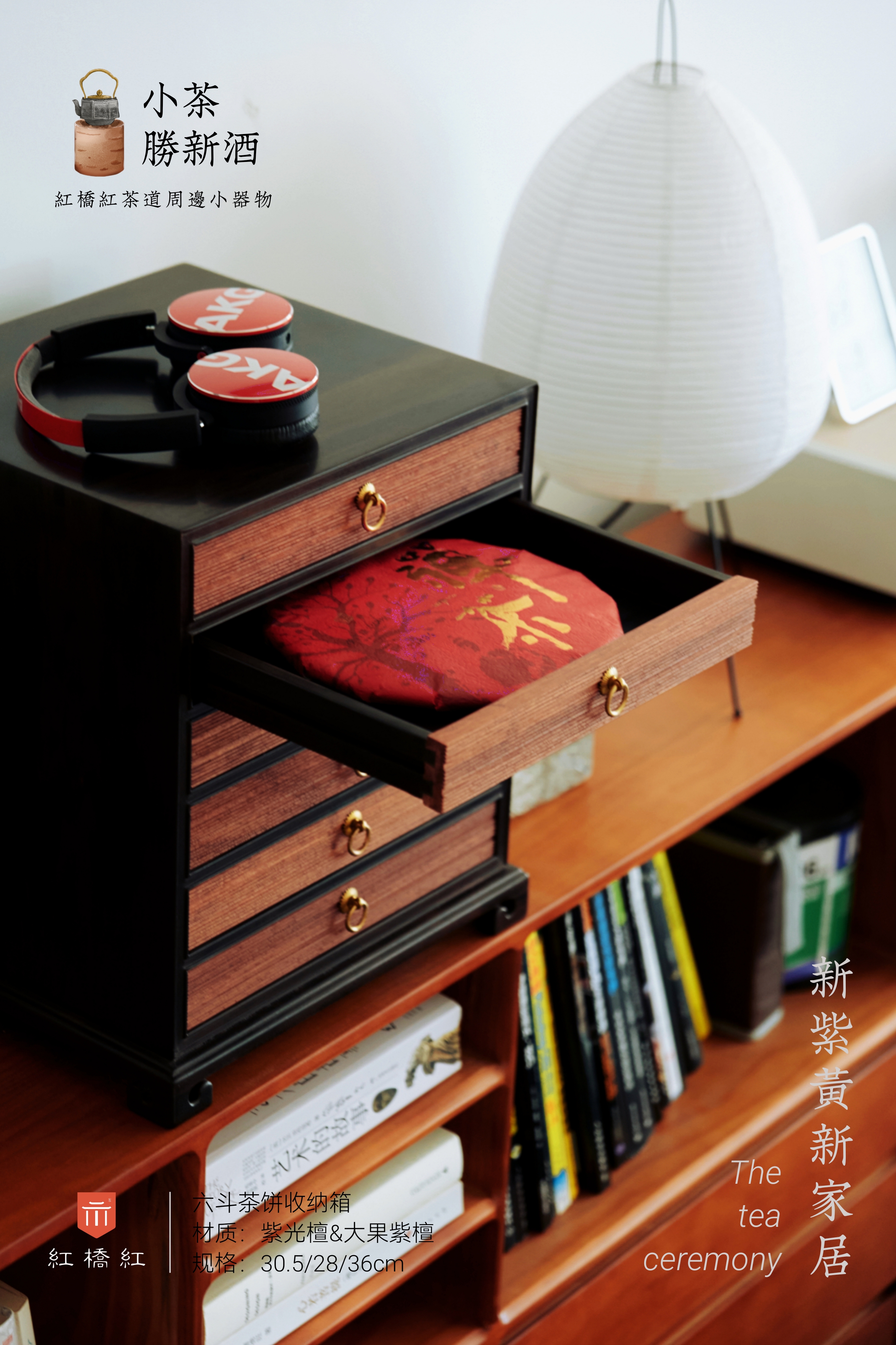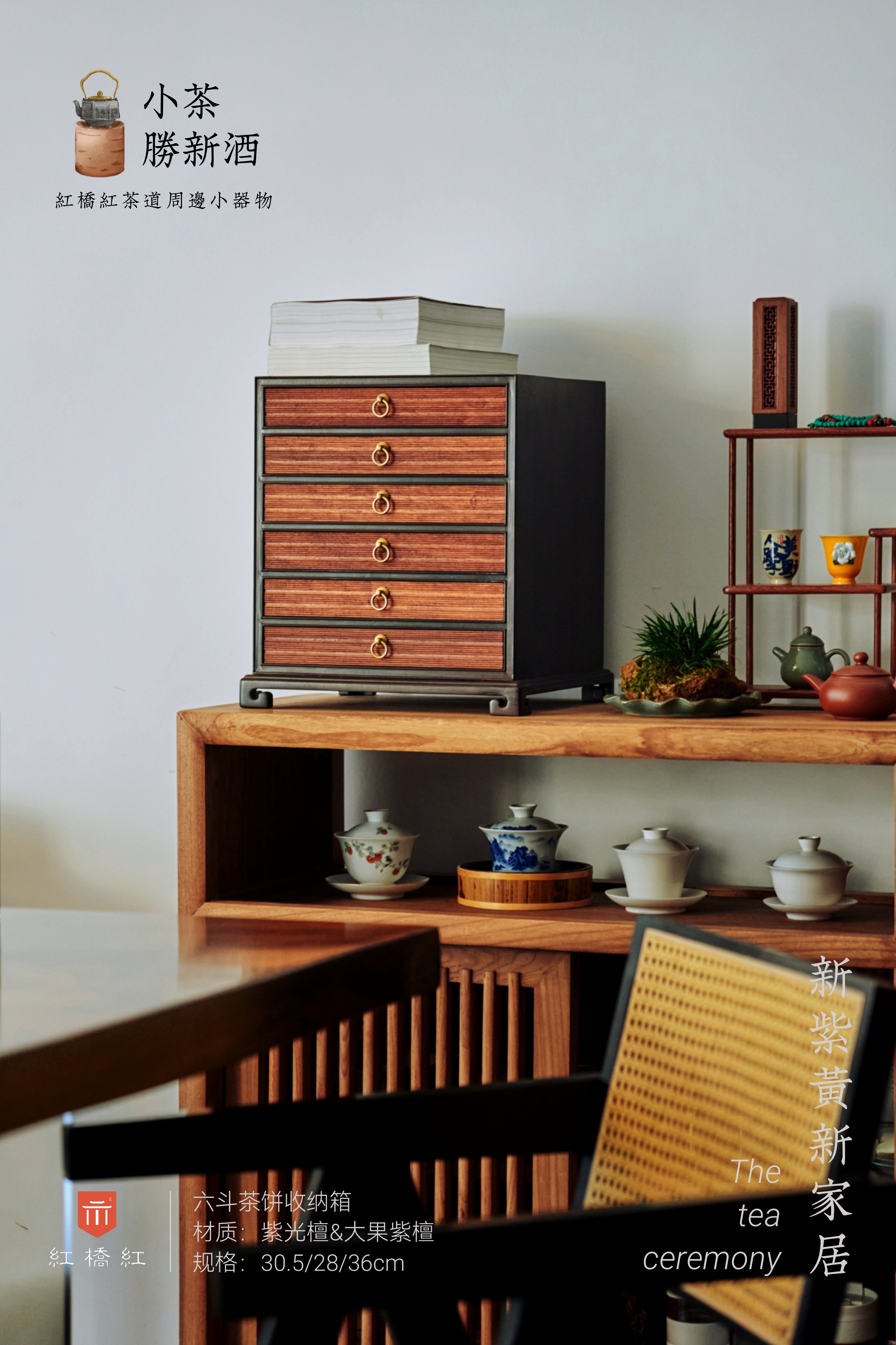 整器做撞色效果,凡围合之材皆取紫光檀(东非黑黄檀),质坚材硬,暗纹迷人,抽屉采用鲜丽缅甸花梨(正宗大果紫檀)所制,赏之如姚黄魏紫。上部长方框架内打造抽屉架,其间平列六具缅花抽屉,实用性强;抽屉脸饰有线条,增加层次立体感;正中安铜件,抽拉便利;抽屉框沿边的横竖框均起阳线,细节讲究。底承拐子式卷书几座,四面平,简约雅致。此柜可置于案上古雅清逸,可做茶饼盒、储物盒使用。
