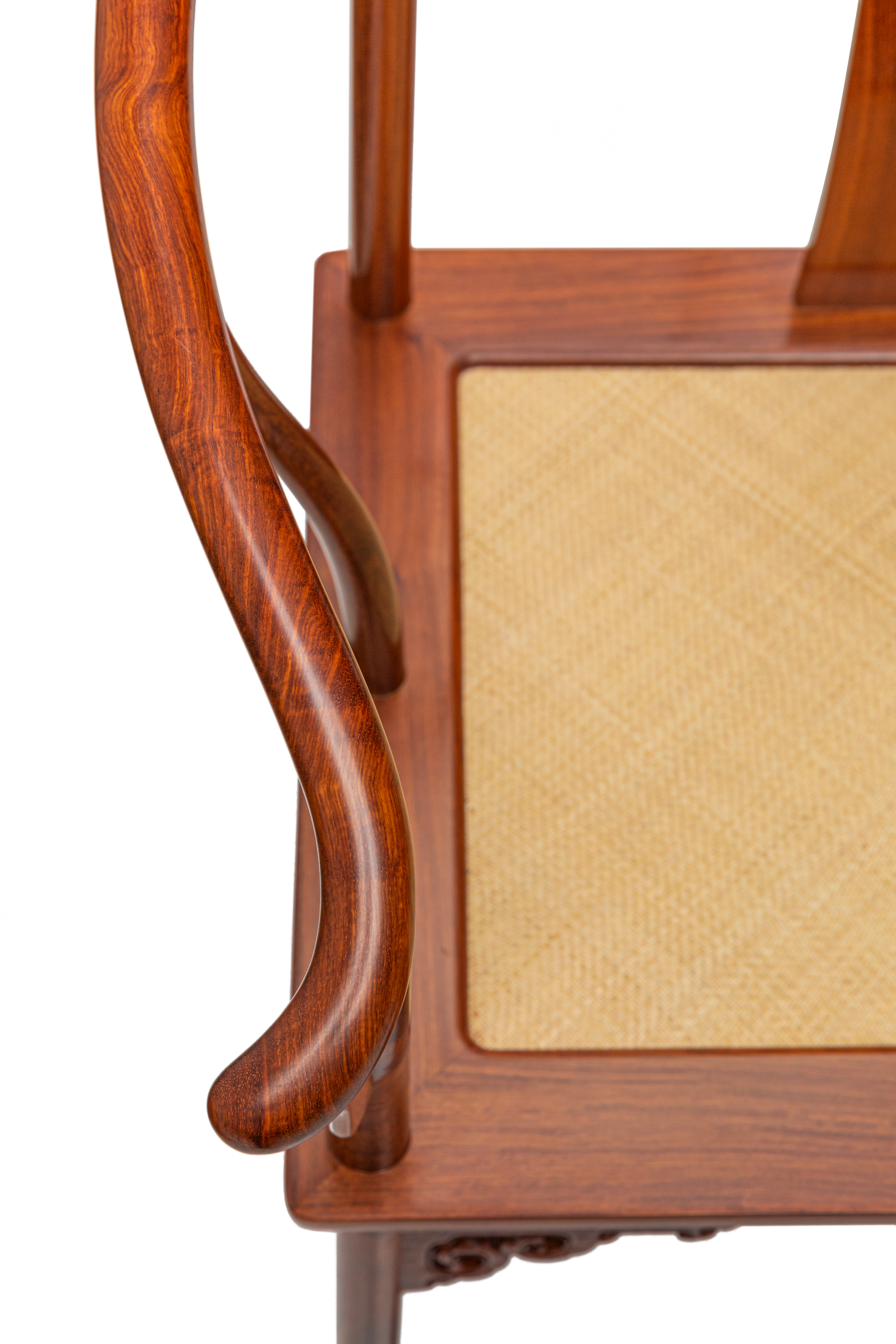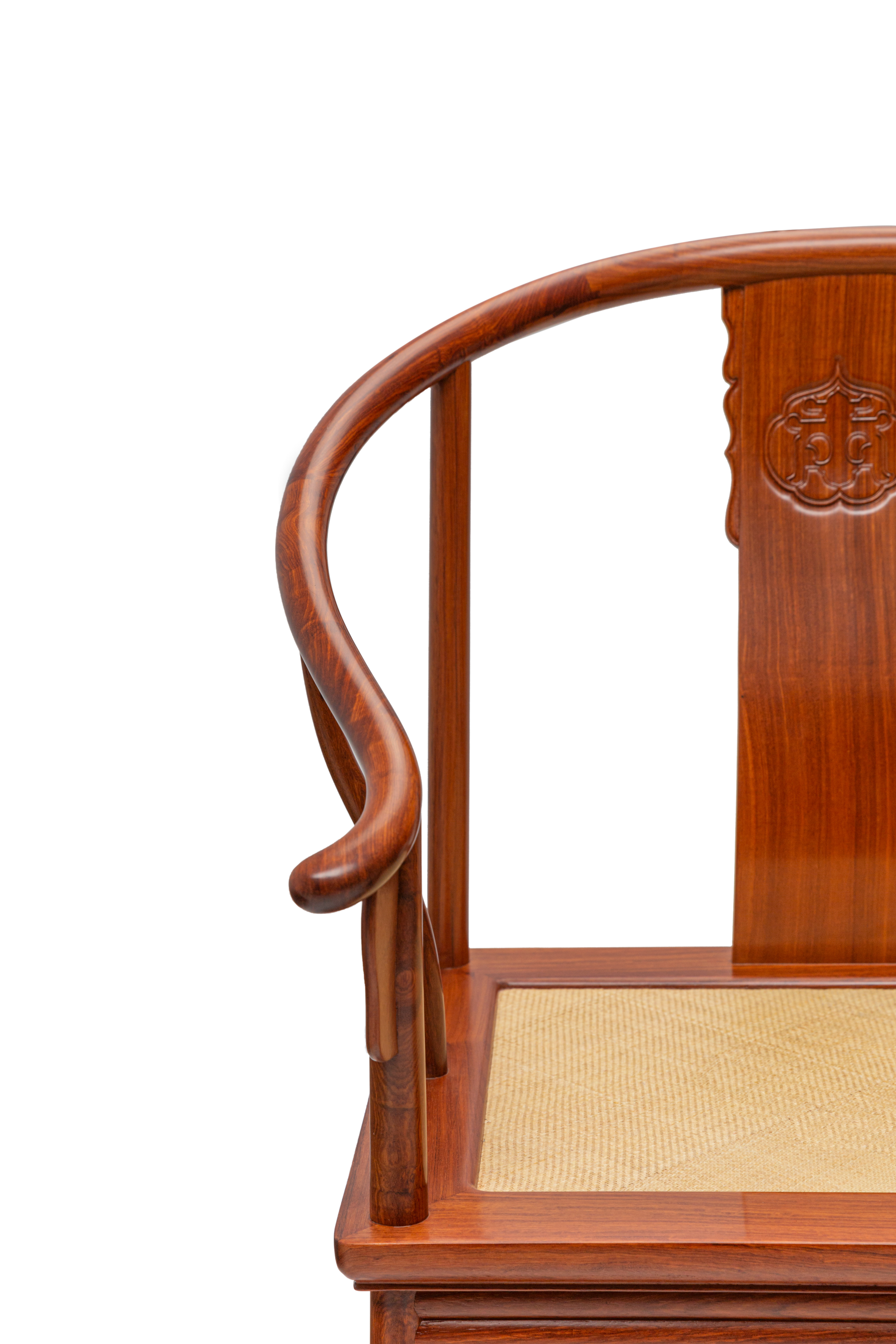 椅子的四根圆直腿向中心倾斜,穿过座面直抵圈椅四角,成为圈椅稳定的支柱,且通过自身的圆形截面与圈椅的造型因素发生内在的联系,靠背板和镰把棍都设计成曲线,构成圈椅在垂直方向上的衬托着力点,座面编藤面,面下劈料制作的下牙条,但座面下的牙条并非常见的壸门造型,而是双混面直枨加角牙的形式,椅子的四腿八挓一木连做,四腿间步步高赶枨,前、左、右三方连以双枨,上为直枨,下为罗锅枨,这与座面的劈料作法既有呼应,又有变化。