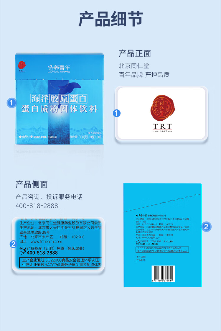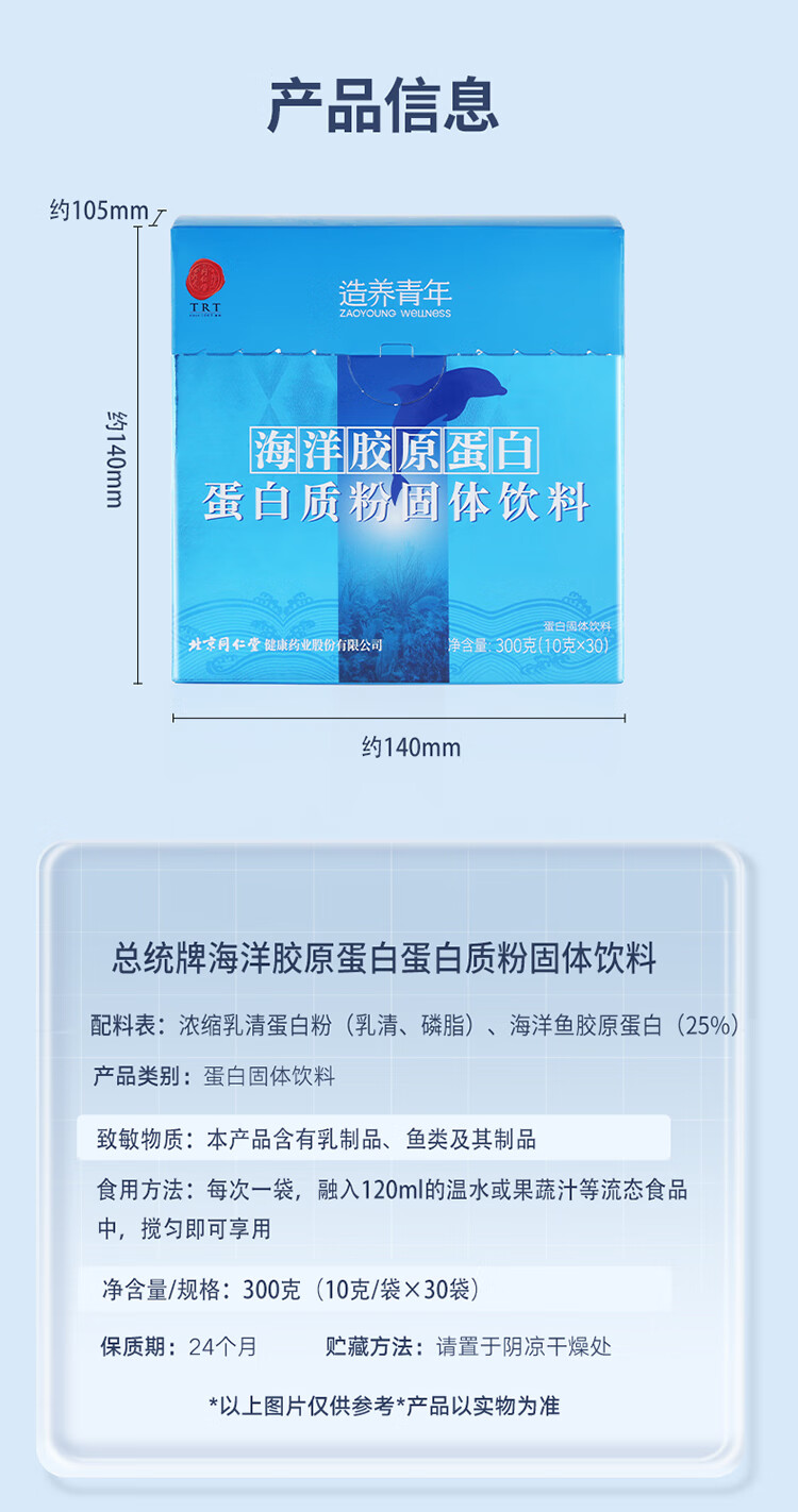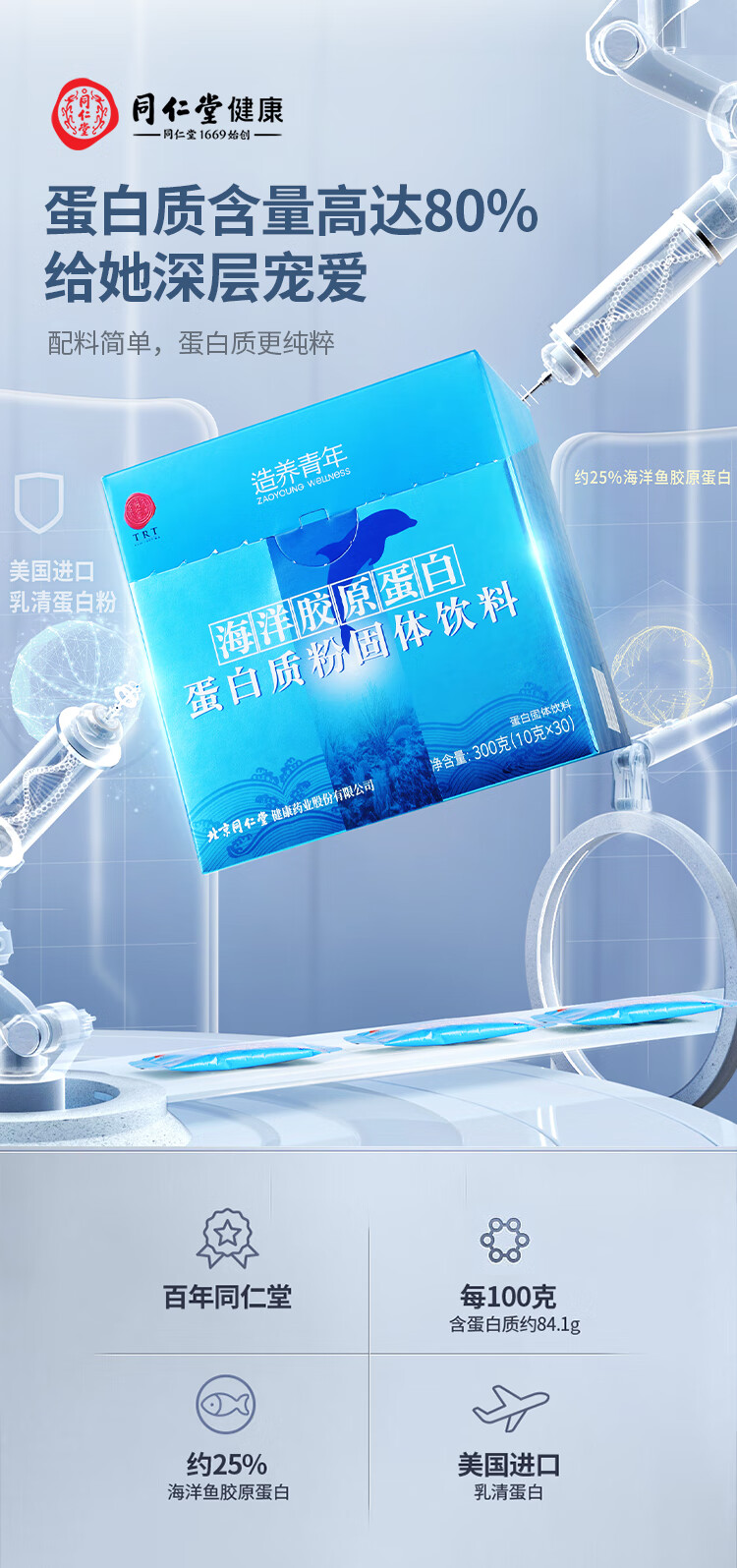 【正宗同仁堂品牌】北京同仁堂 海洋胶原蛋白蛋白质粉固体饮料300克(10克/袋*30袋) 海洋鱼胶原蛋白 双补蛋白饮品SY