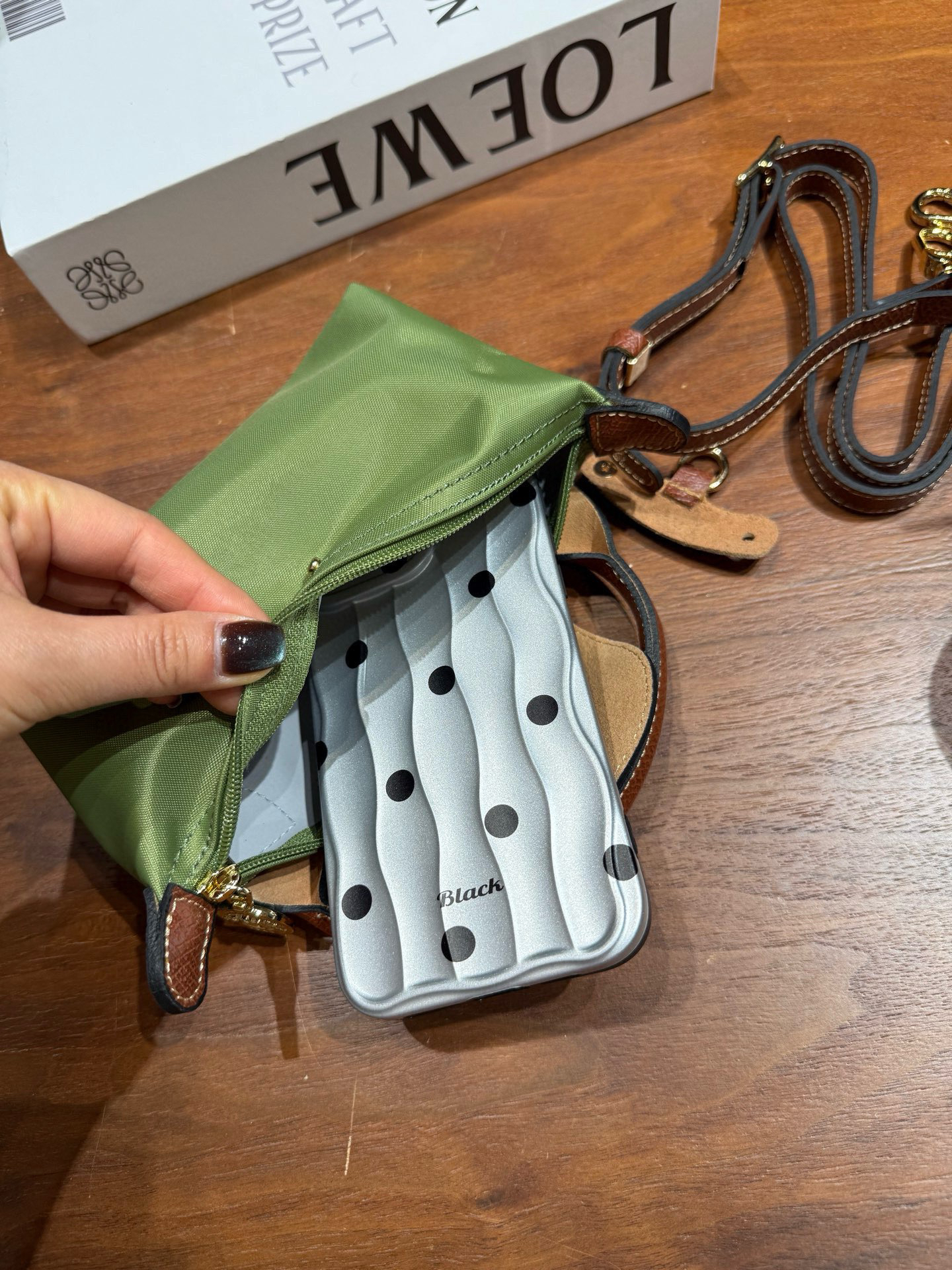 日常容量也够用的,粉饼、口红、纸巾、还有 promax型号的手机都可以放得下,相比于小废包的那种,迷你饺子真的很实用了
