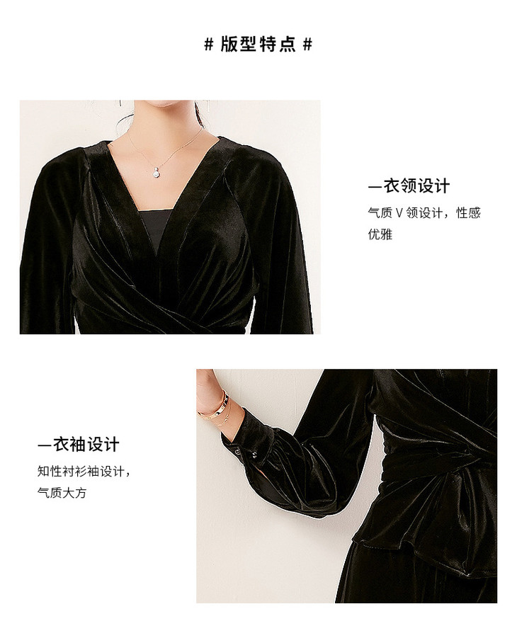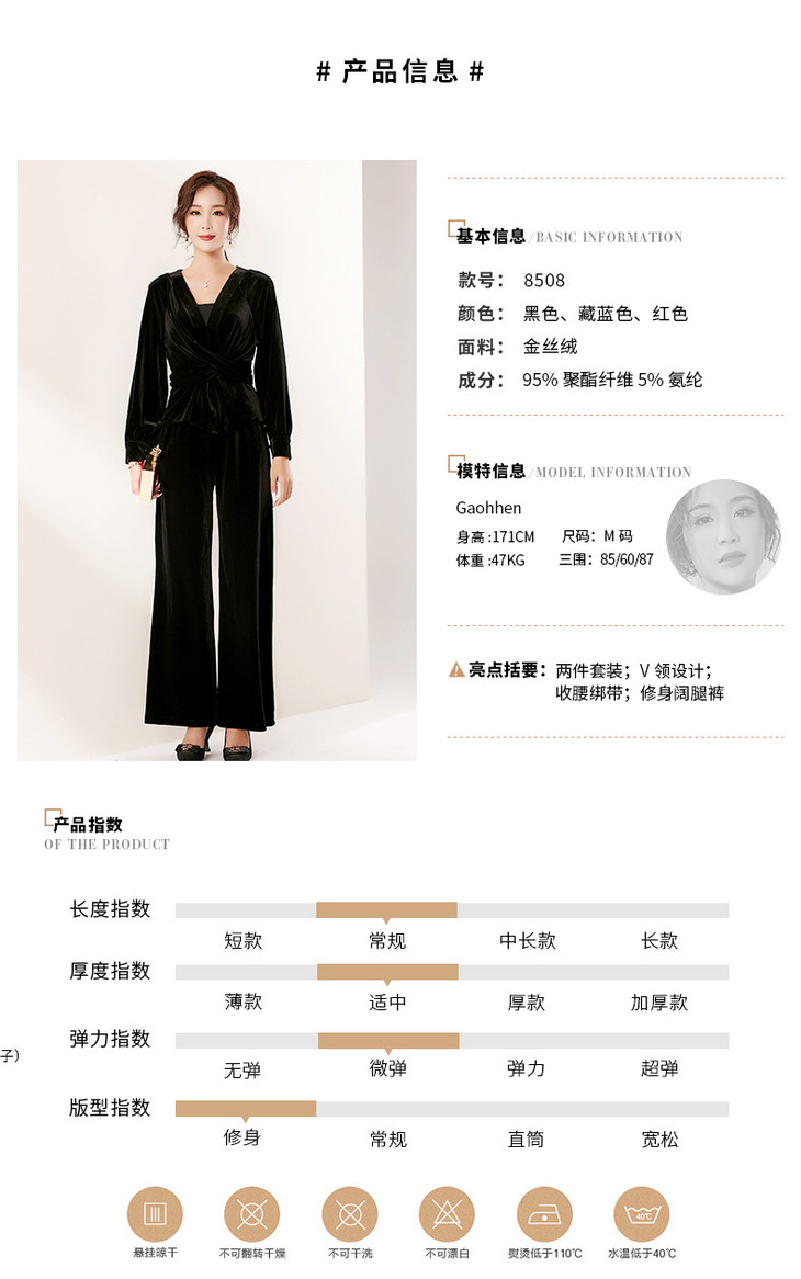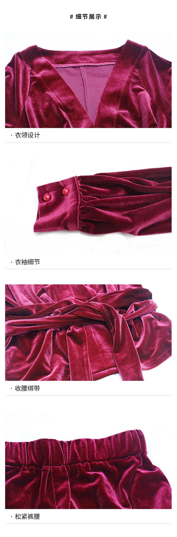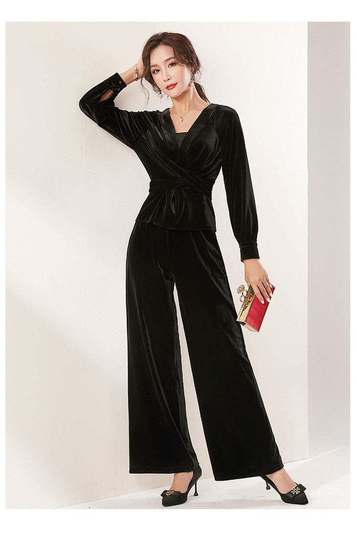 SFYFS-8508新款优雅气质收腰系带V领长袖金丝绒上衣阔腿裤两件套