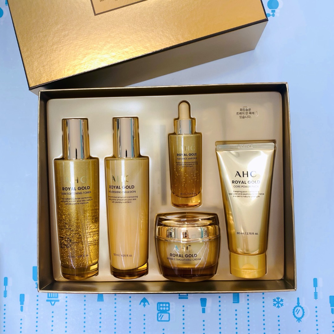 👑AHC皇家黄金护肤套装 👍新款k老套盒 🌈系列主打:改善暗黄,提拉紧致,补水紧致 🌿补水能力极强,帮助肌肤焕白、镇定 ✅用后肌肤饱满有弹性,适合k老人群使用 【套盒包括】:120ml水+120ml乳+50ml面霜+30ml安瓶精华+80ml睡眠面膜