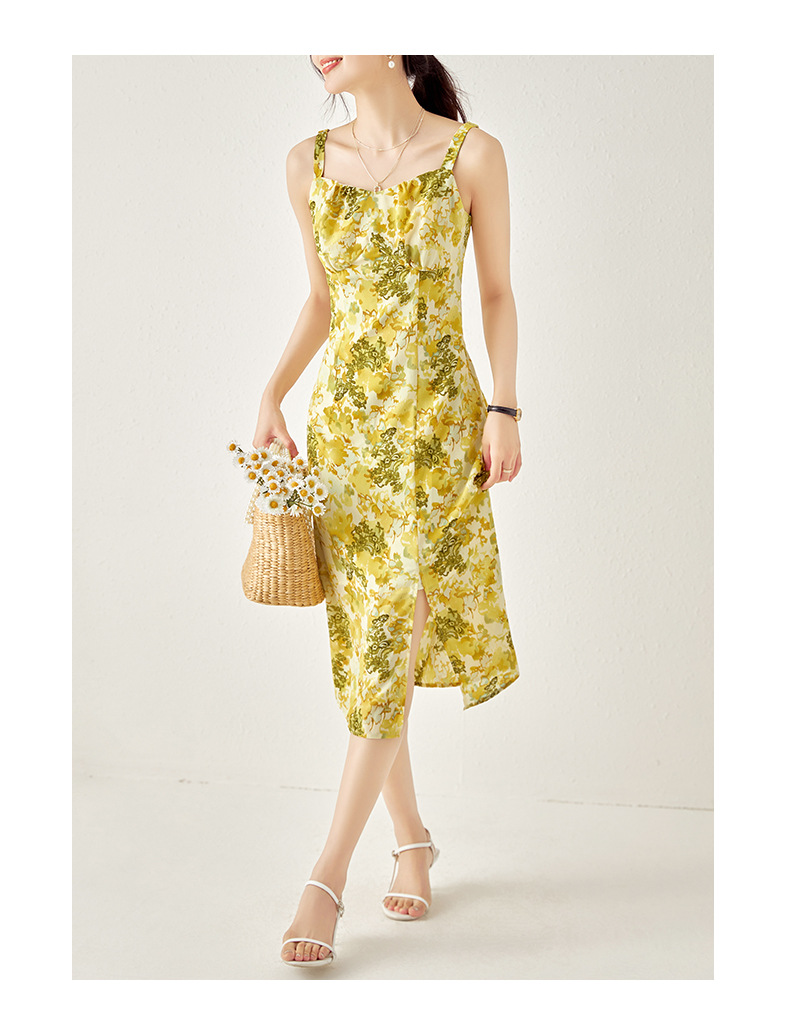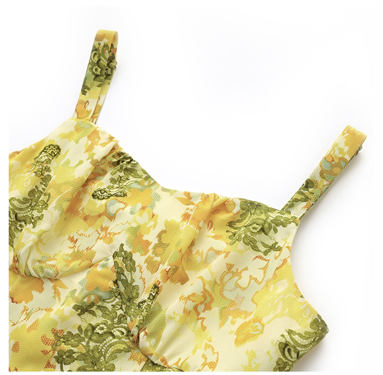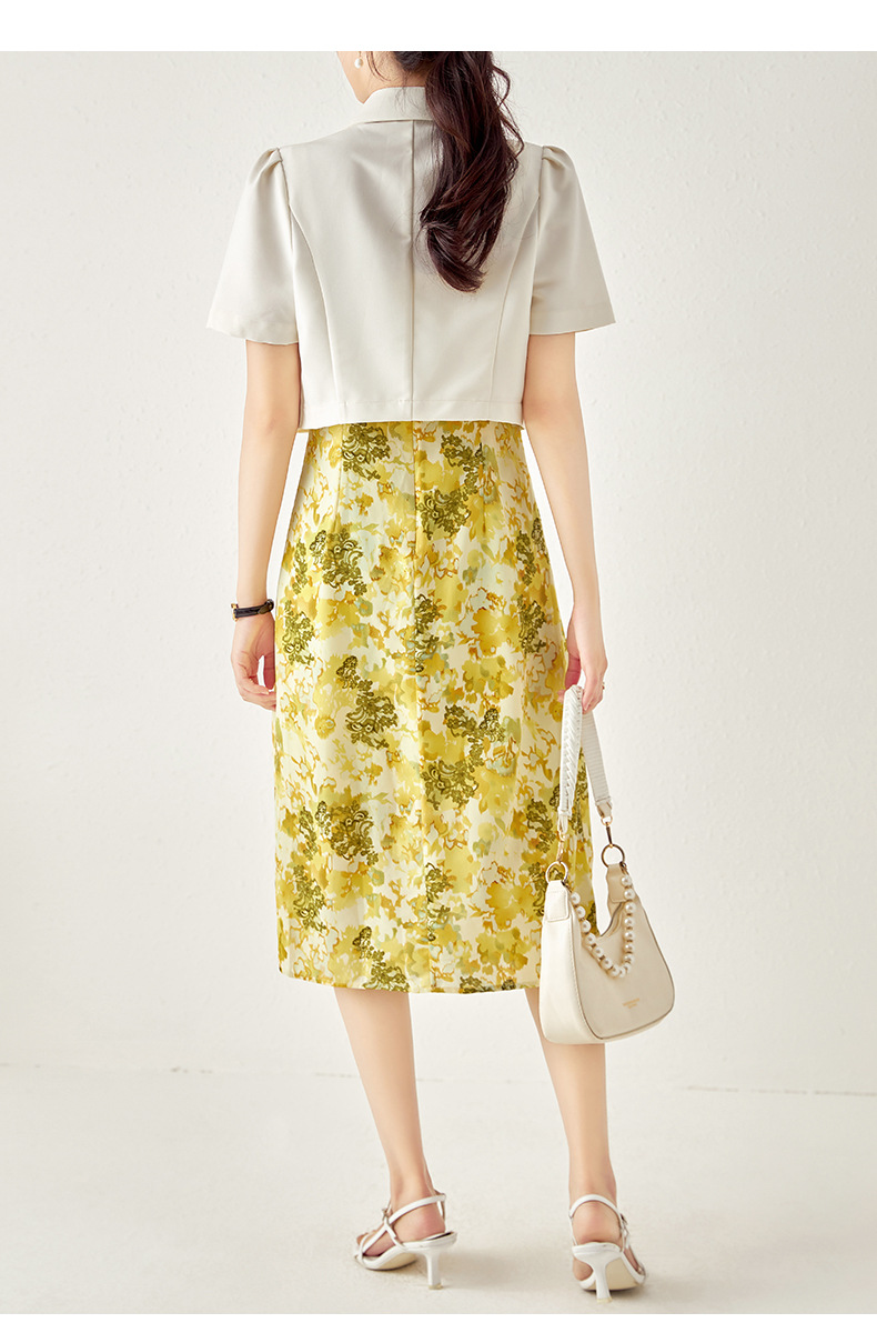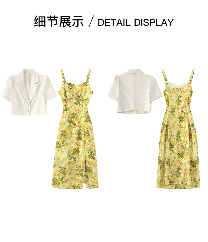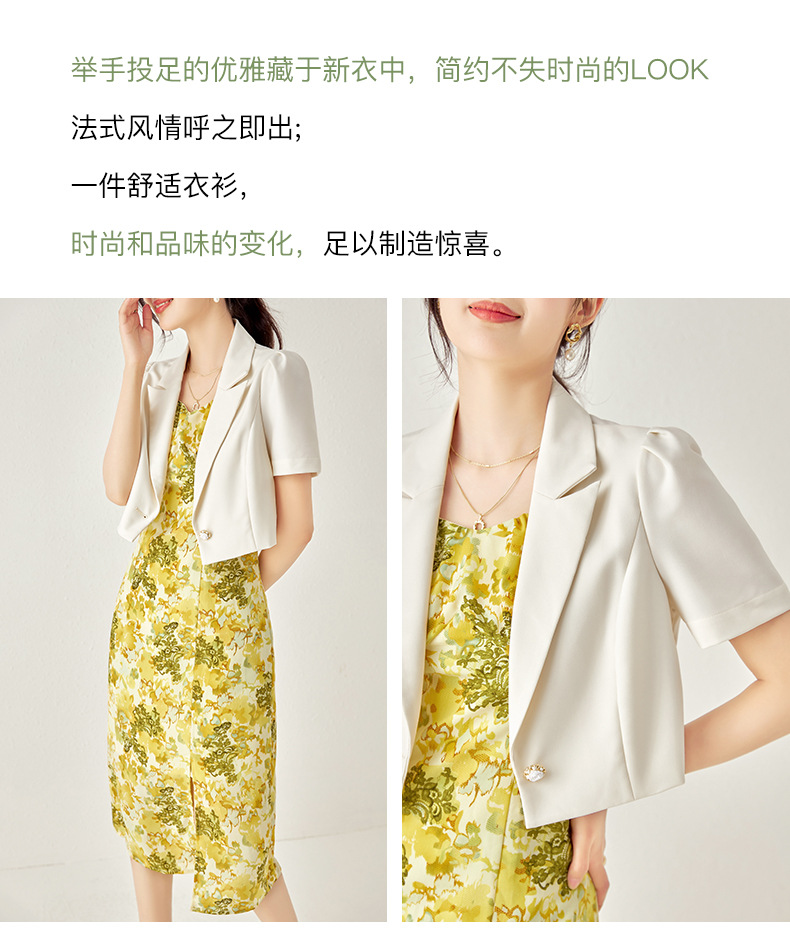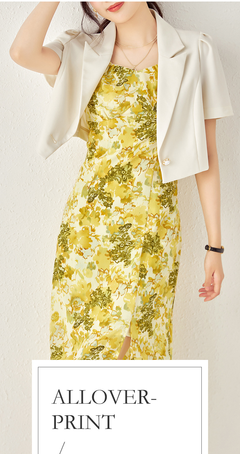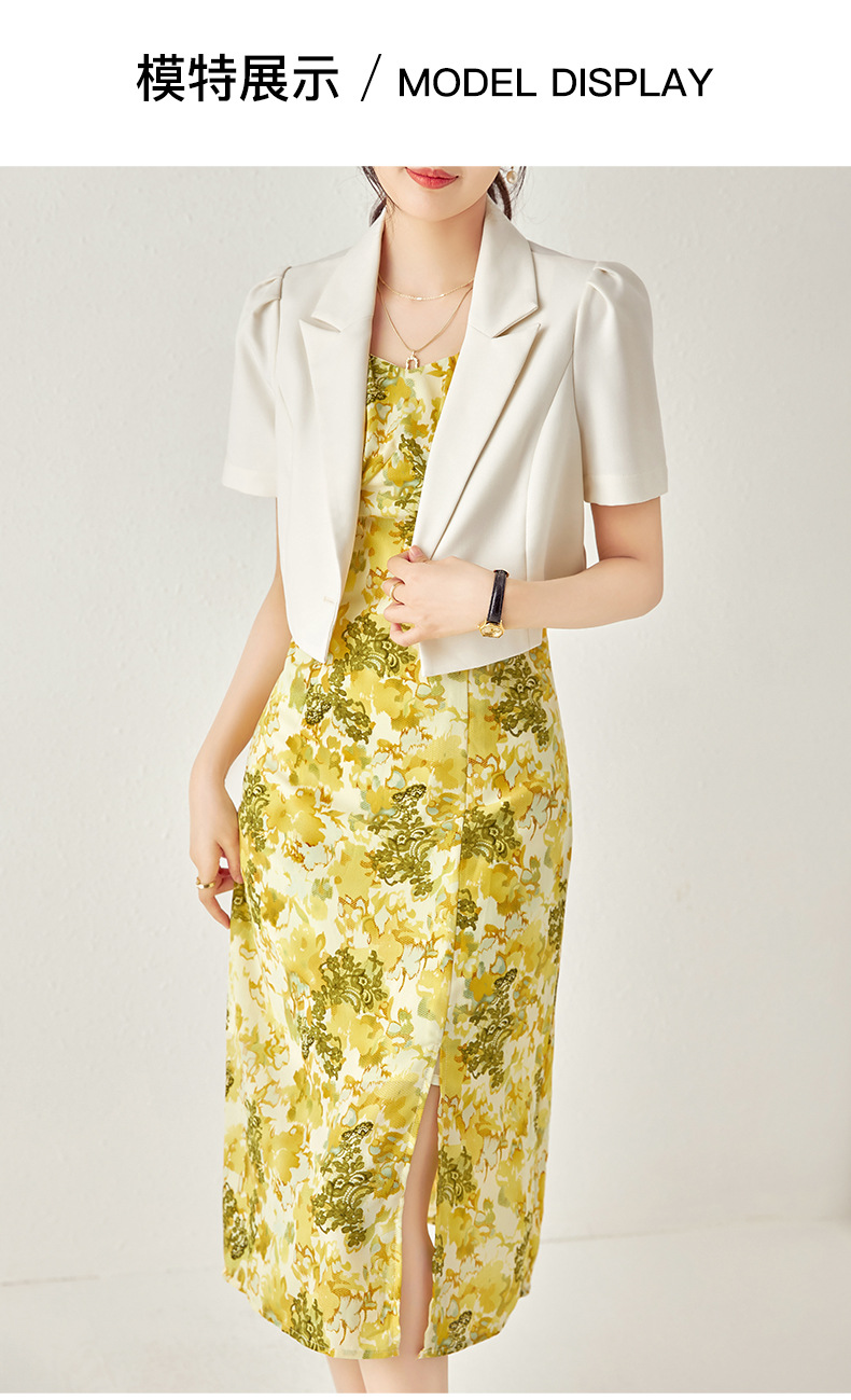 修身百搭,净色翻领短袖小西装外套+雪纺碎花吊带开叉连衣裙两件套WLZD-23051002