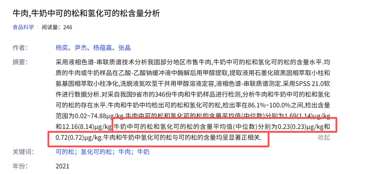 2021年的论文《牛肉、牛奶中可的松和氢化可的松含量分析》中表明:牛奶中可的松和氢化可的松的含量平均值(中位数)分别为0.23(0.23)μg/kg和0.72(0.72)μg/kg.牛肉和牛奶中氢化可的松与可的松的含量均呈显著正相关。咱们的报告检出值为0.63,在0.72之下。