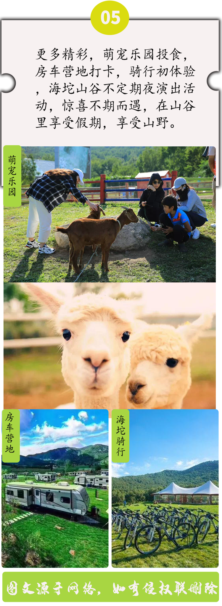 适时前往海坨山谷,动手扎营构筑自己的小巢,之后草地野营餐,下午可请根据您的喜爱自由游览拍照。