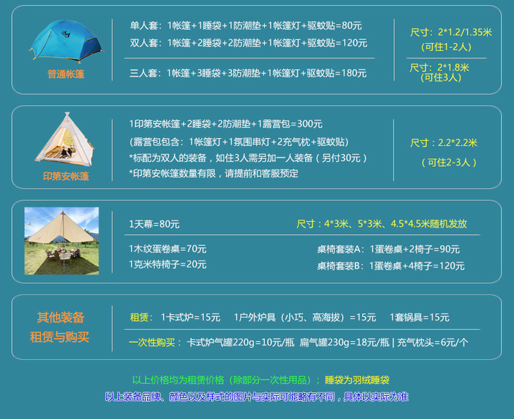 【营地】:露营营地费用,免费淋浴(如单人一个帐篷需补50元营地费)