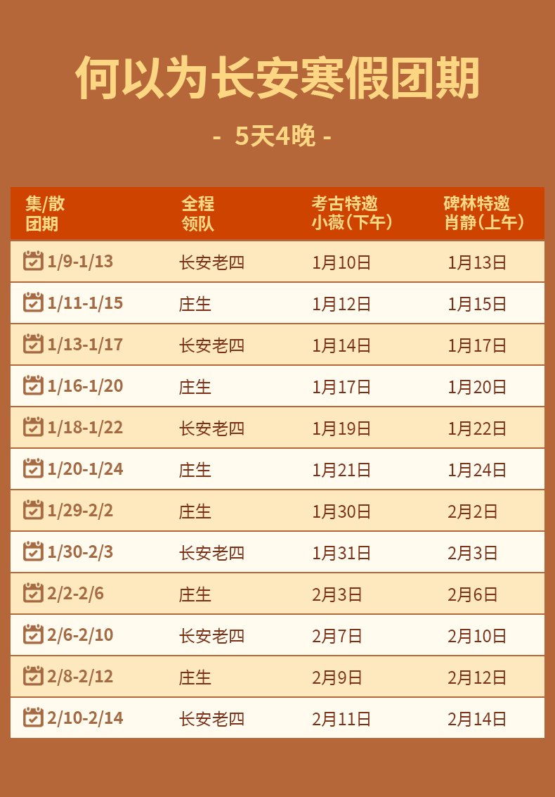 3.【游玩建议】行程站立和步行的时间较长,建议选择一双舒适的鞋。行程中有部分室外的行程,西安冬季干燥寒冷,推荐备好各类防风防冻防寒衣物、能够遮住耳朵和头部的保暖帽子、厚围巾、户外袜、雪地靴、保温杯、防风寒药物等,避免冻伤感冒。