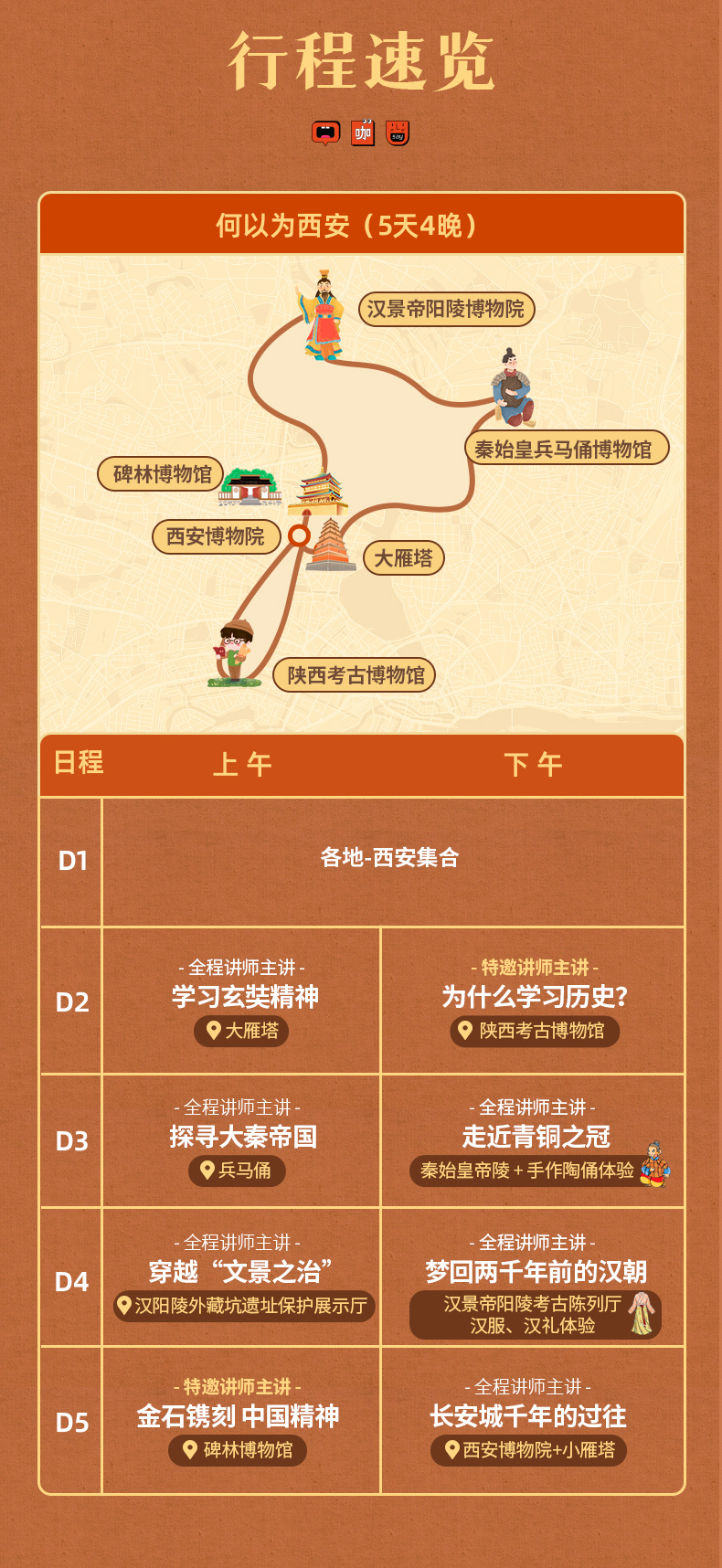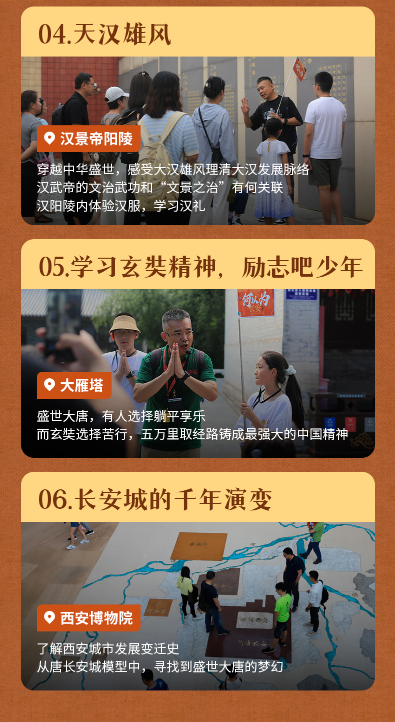 4. 全程景点首道大门票:秦始皇帝陵博物院、陕西考古博物馆、西安碑林博物院、汉景帝阳陵博物院、西安博物院、大雁塔。行程中会为儿童设计游学手册、部分体验儿童更贵,故儿童门票不退差,成人若有优惠证件,按实际情况退差。