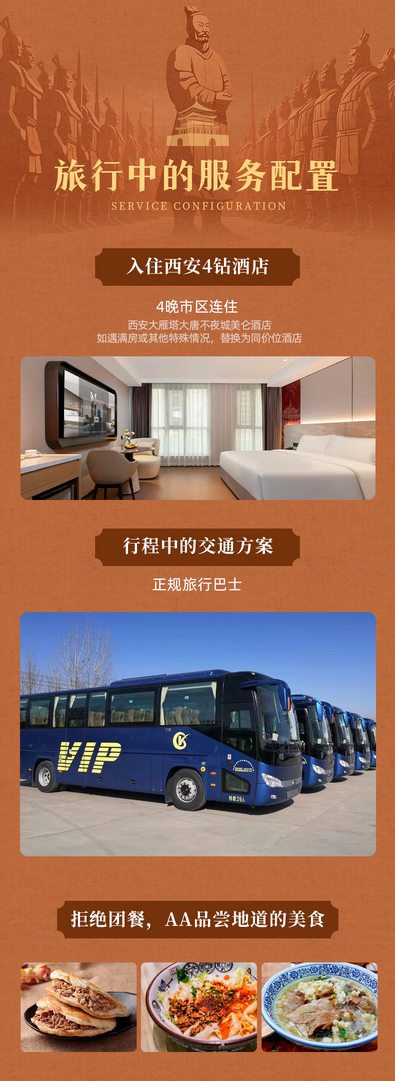 1. 住宿:西安4晚携程4钻酒店,默认标间,1人1床位,如需大床房请提前联系客服备注。
