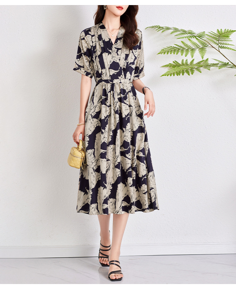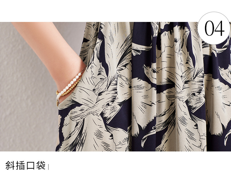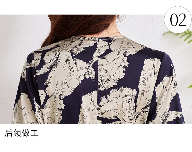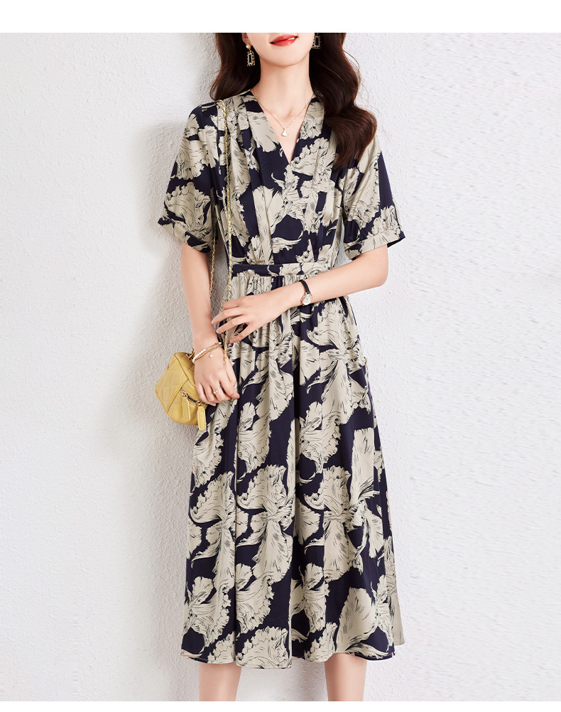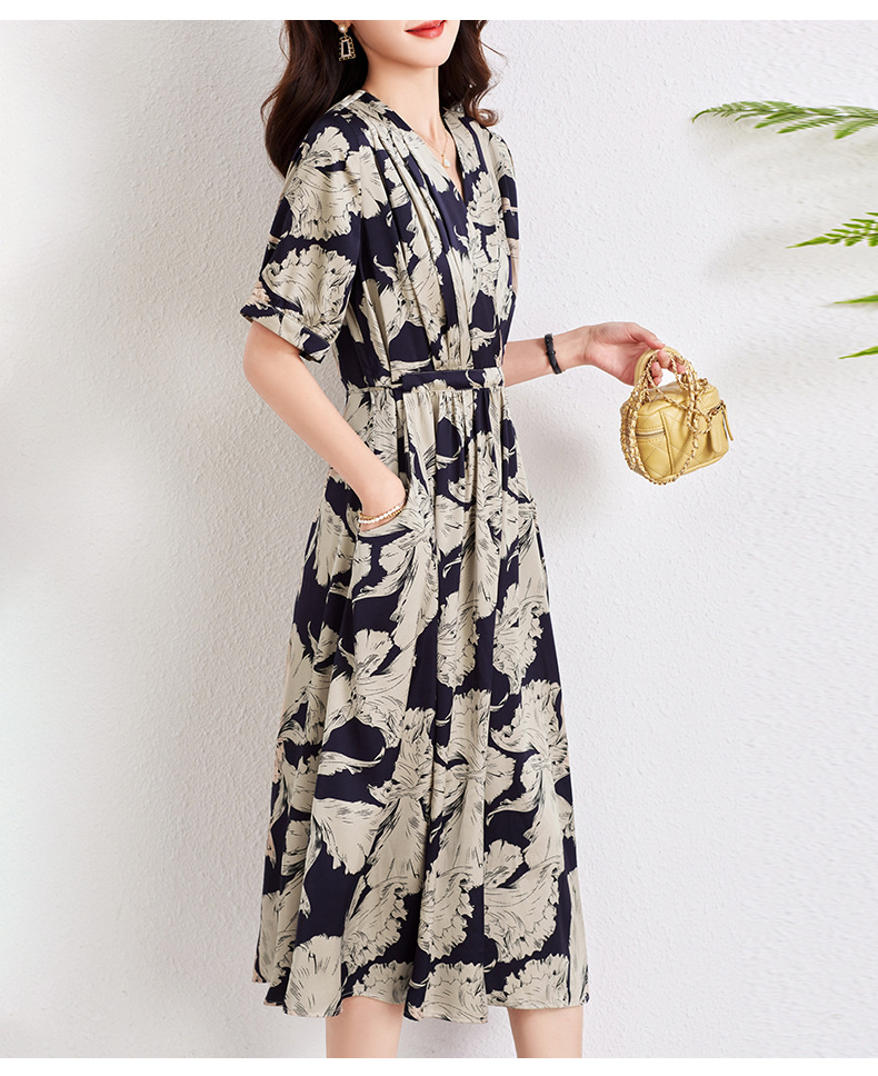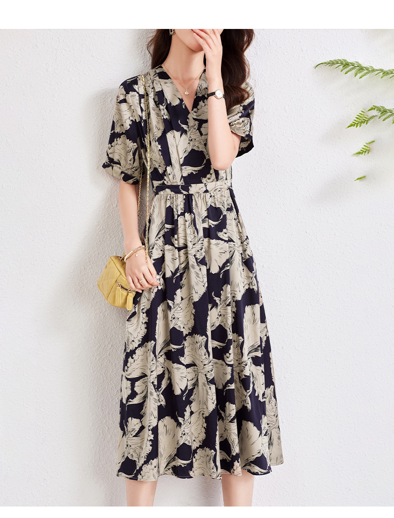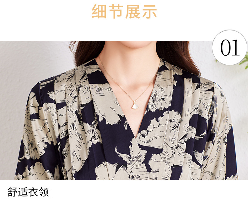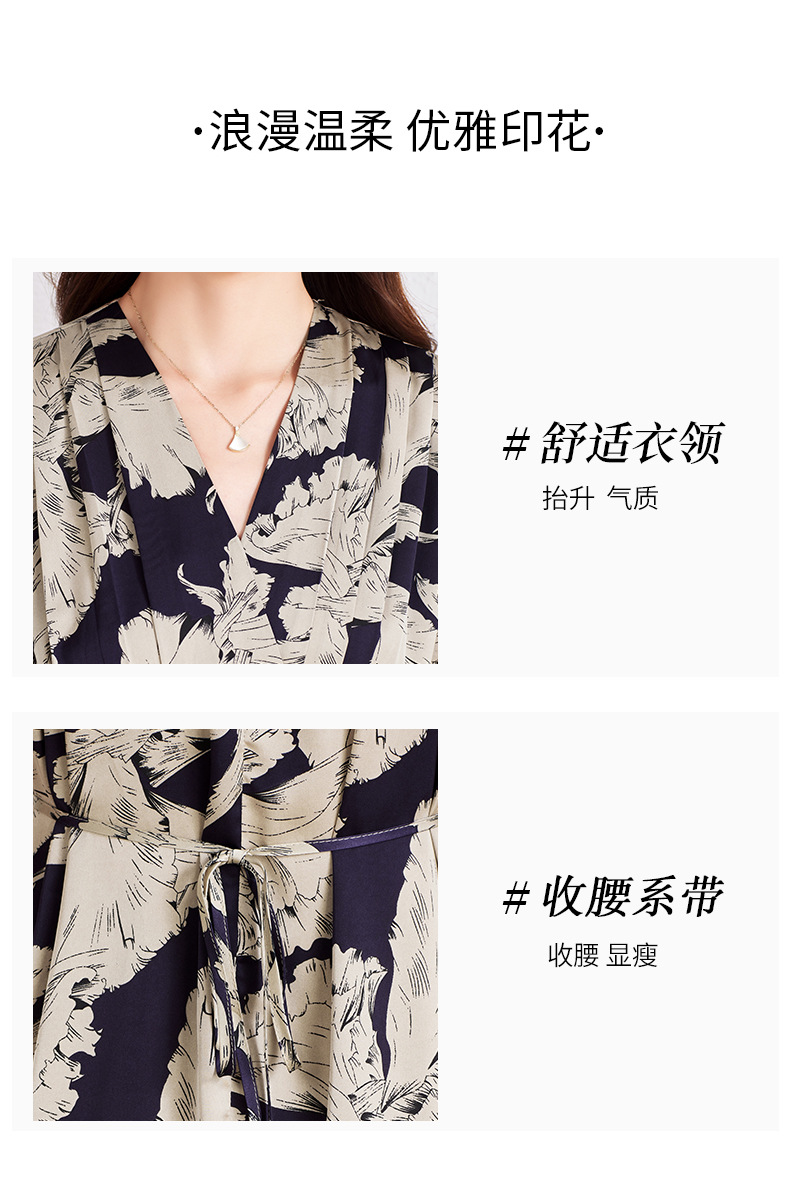 TC 29608真丝连衣裙v领碎花宽松系带大码桑蚕丝裙