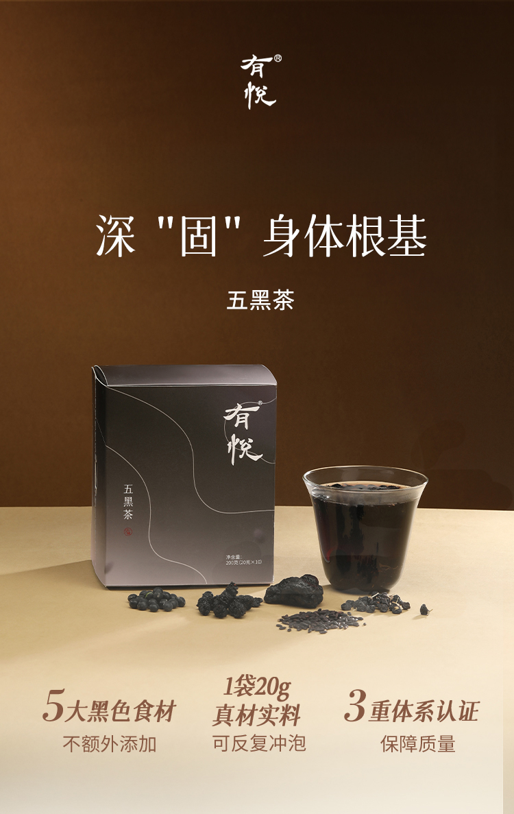 五黑茶|20g*10袋/盒 九蒸九晒黄精 桑椹黑豆黑米黑枸杞 以黑养黑 少点盐