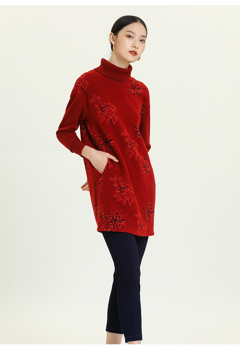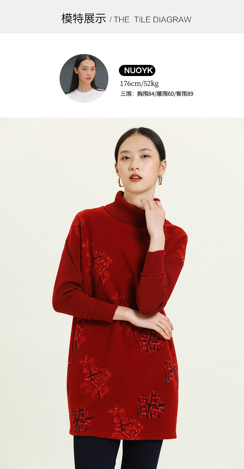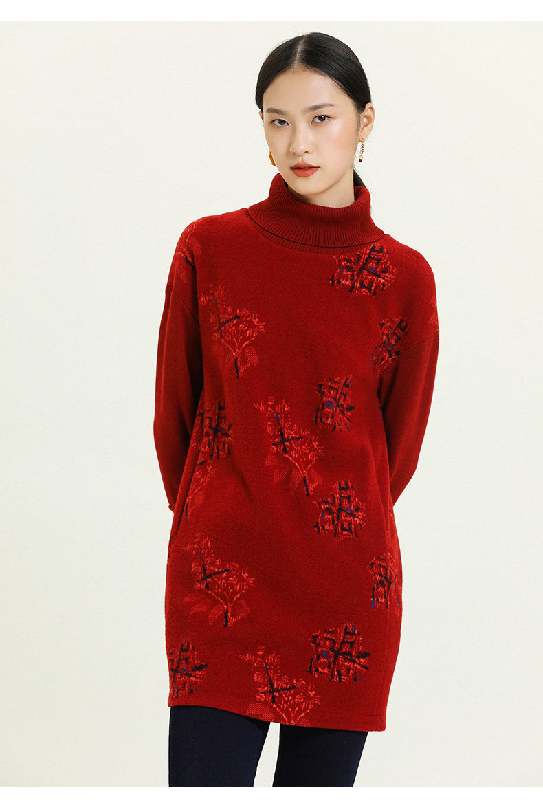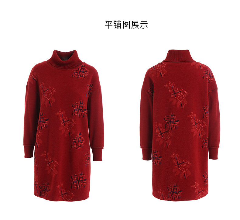 乔万尼秋冬复古红高领印花羊毛显瘦舒适休闲宽松减龄连衣裙ES4E323