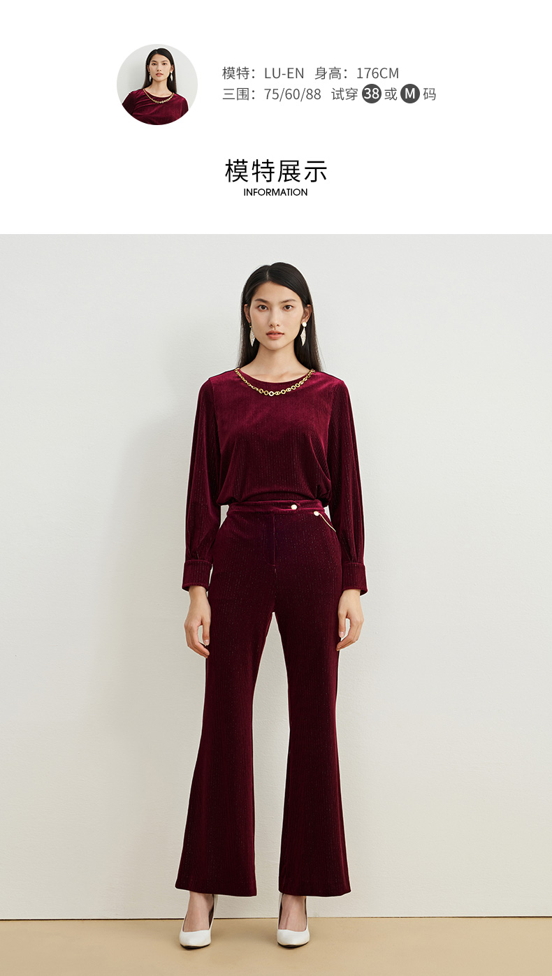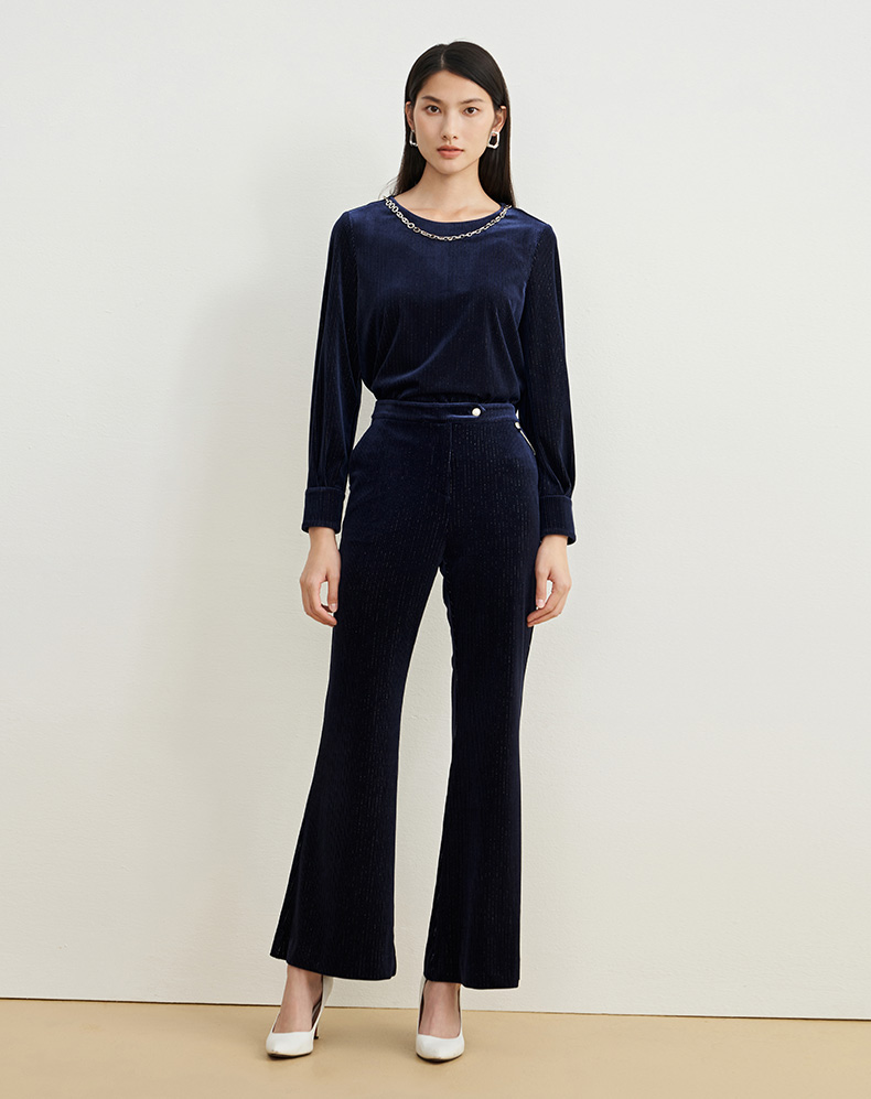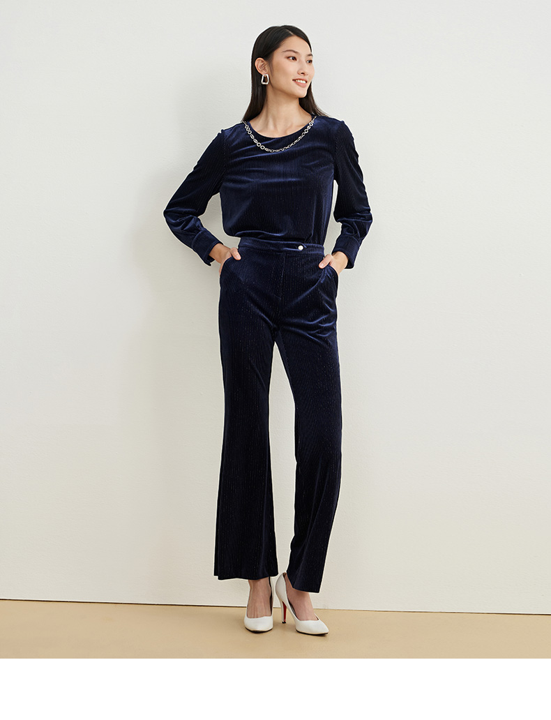 EITIE爱特爱春季新款高腰显瘦黑色微喇休闲裤女气质通勤时尚裤子A2205907