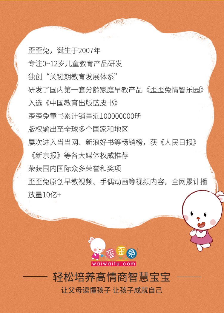 - 歪歪兔,诞生于2007年,专注0-12岁儿童教育产品研发。原创童书销量逾1亿册,音视频播放总量10亿+。
