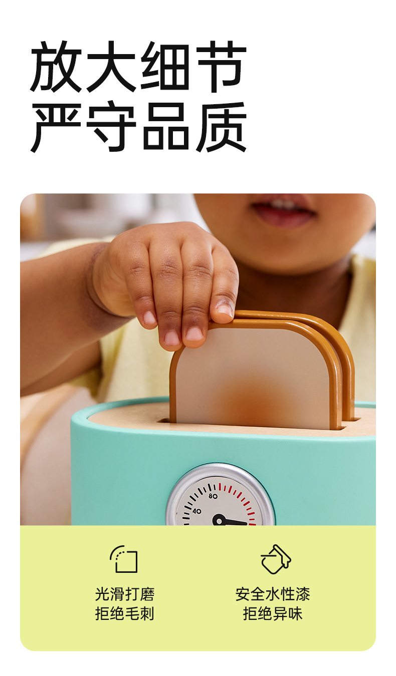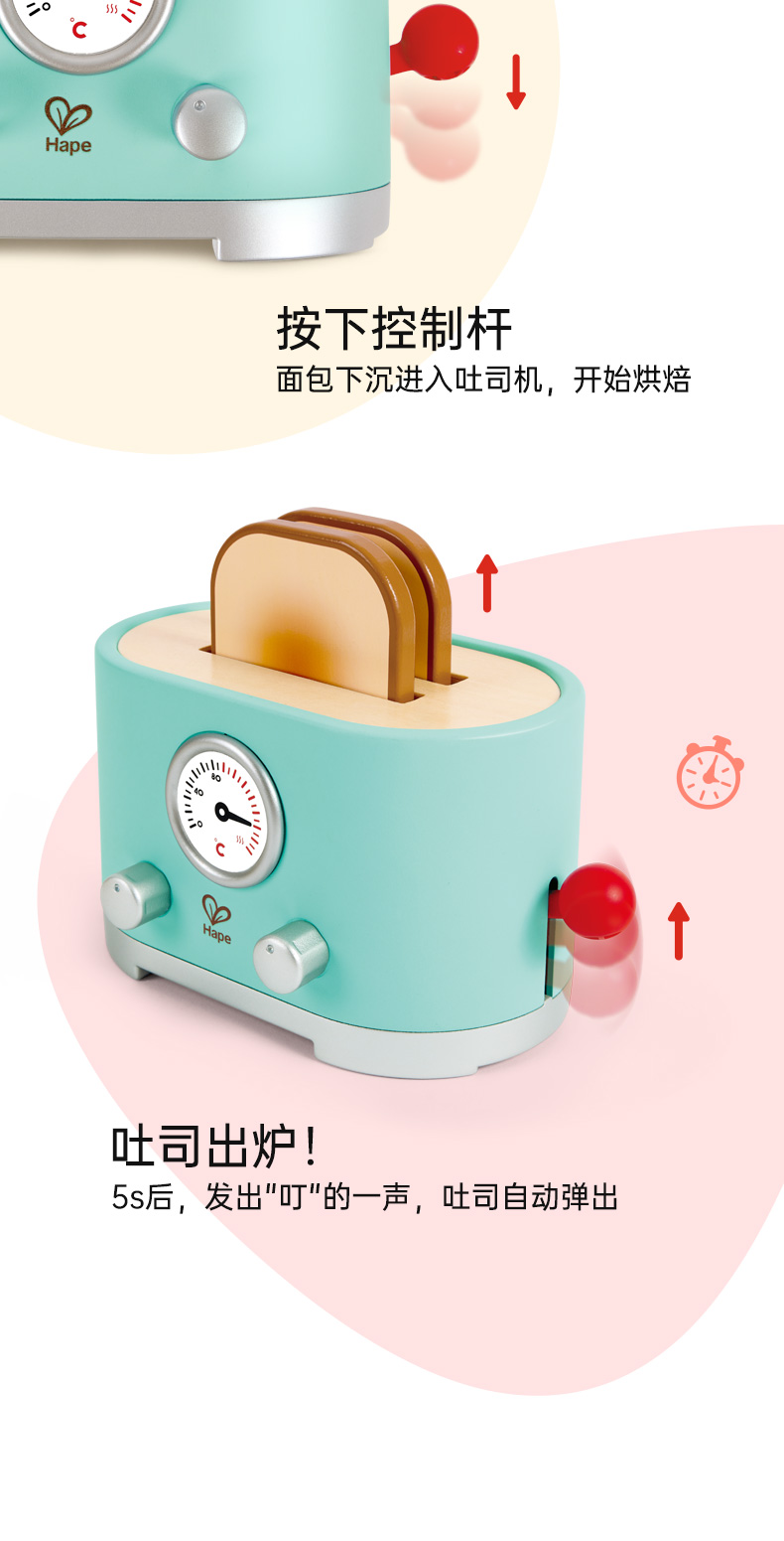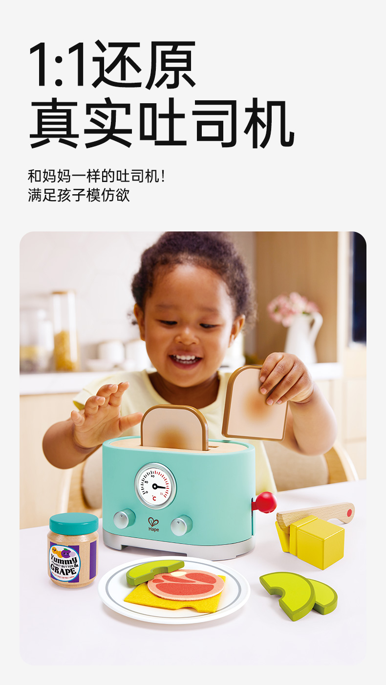 Hape过家家玩具 儿童厨房做饭玩具丰富配件仿真面包机 女孩男孩玩具 现代风早餐吐司机 E3215