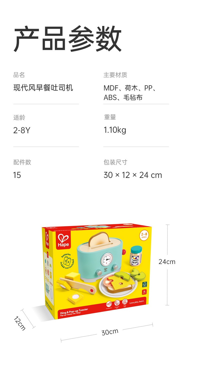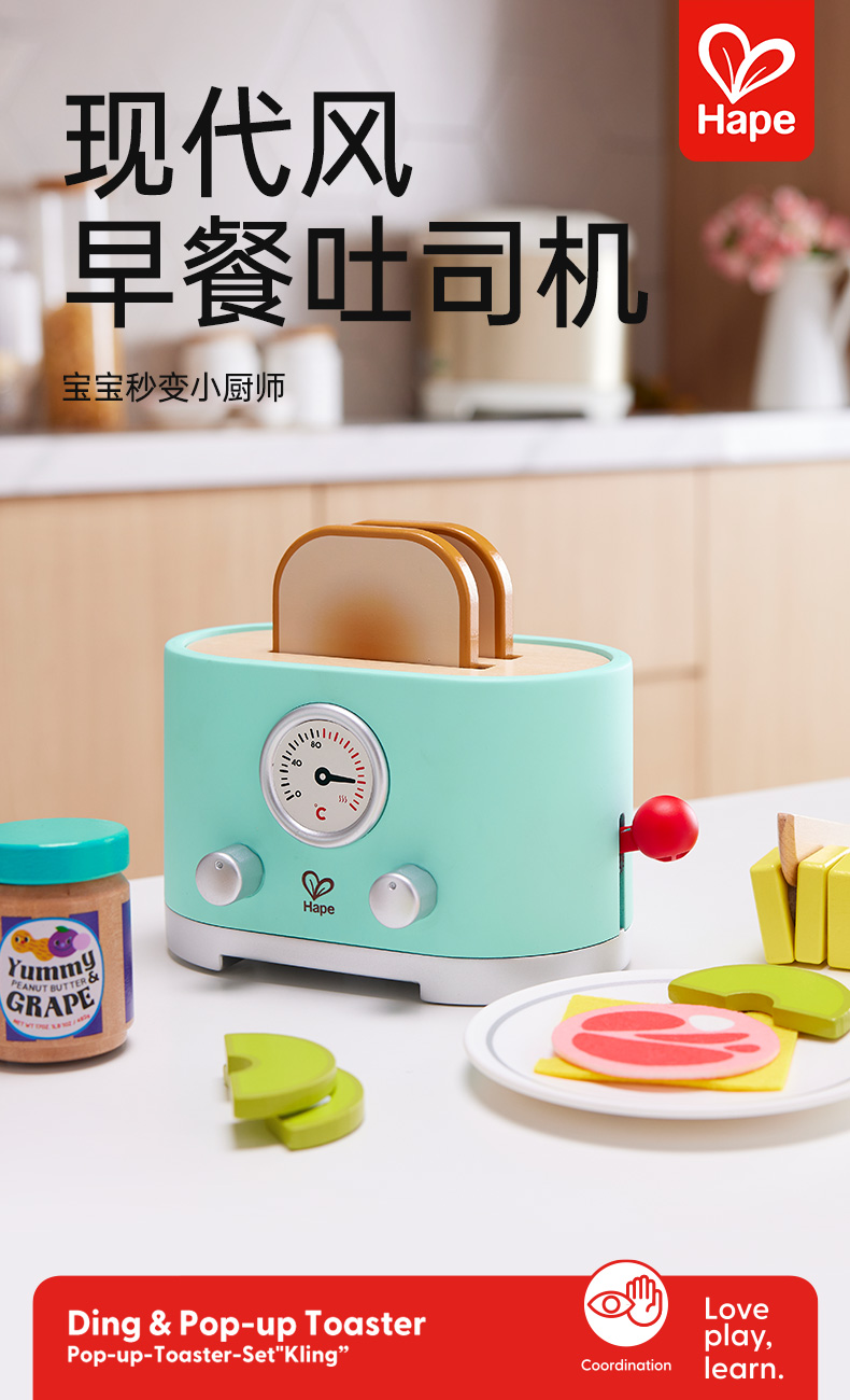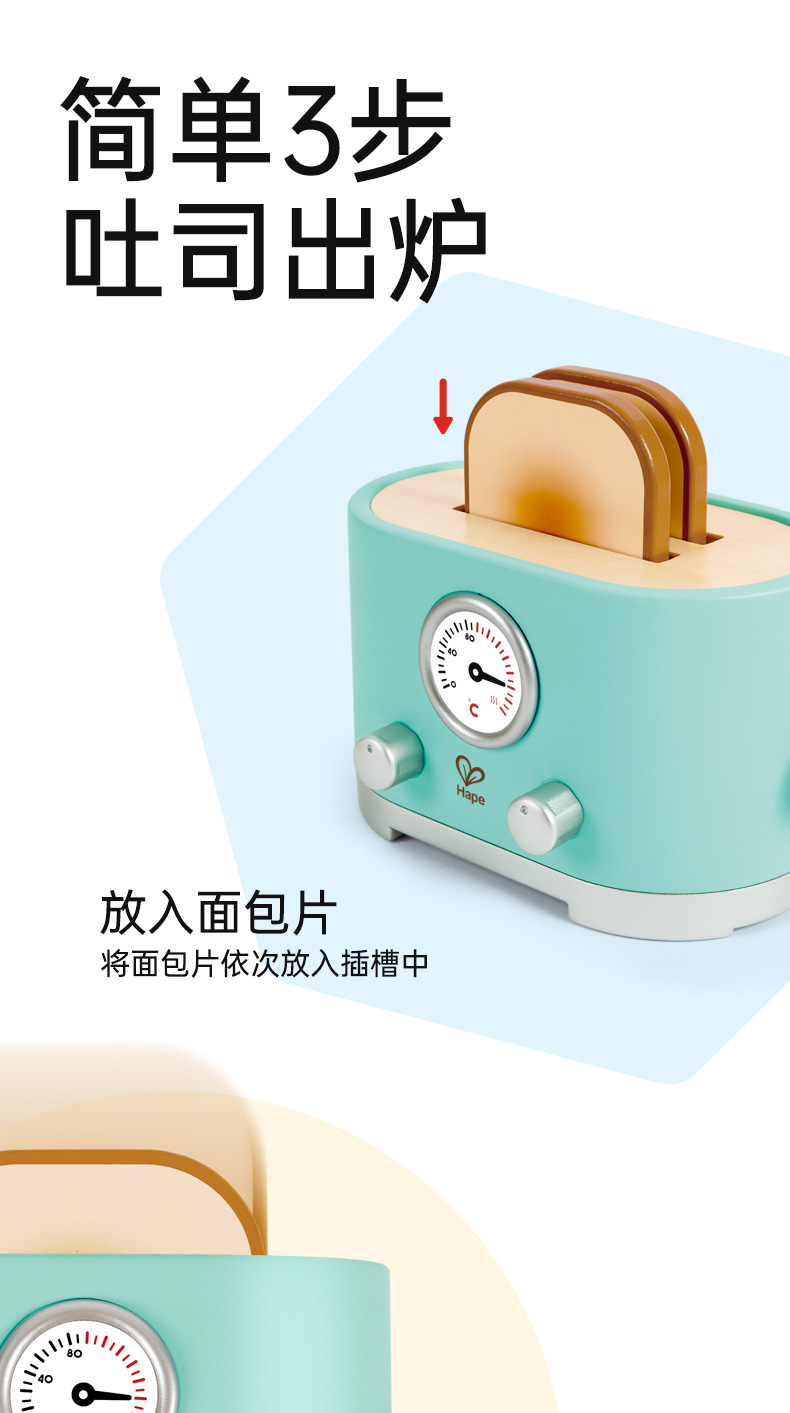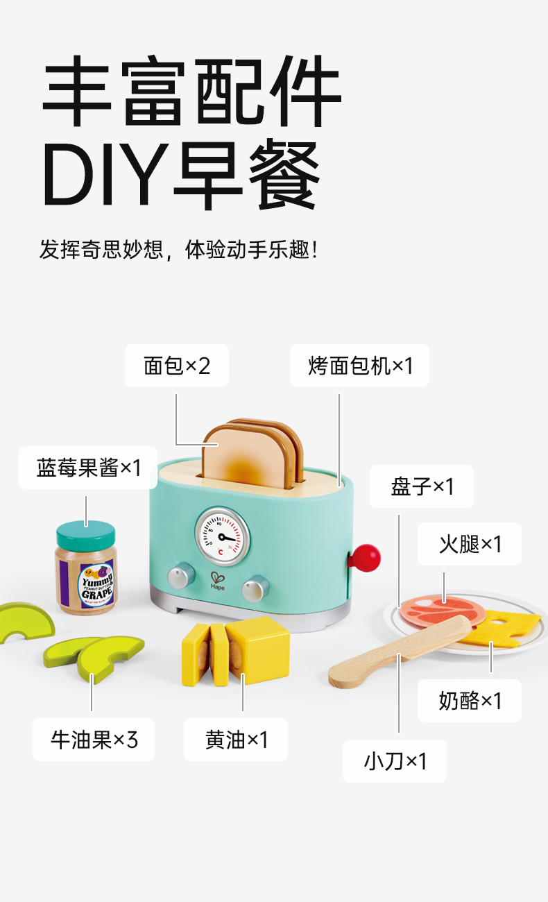 Hape过家家玩具 儿童厨房做饭玩具丰富配件仿真面包机 女孩男孩玩具 现代风早餐吐司机 E3215