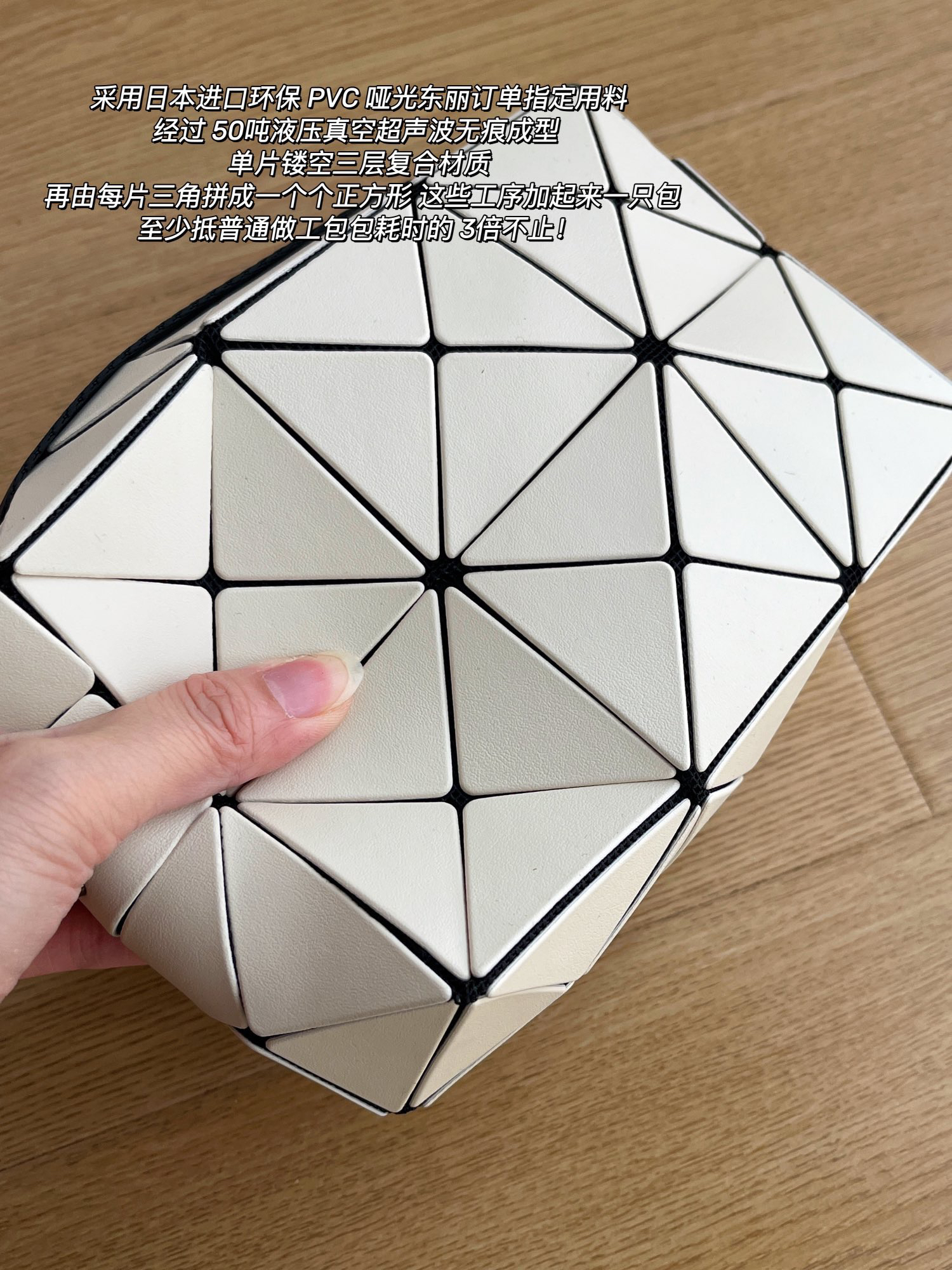 表面材料是日本进口环保 PVC 是哑光东丽订单指定用料、经过 50吨液压真空超声波无痕成型 单片镂空三层复合材质 再由每片三角拼成一个个正方形 这些工序加起来一只包至少抵普通做工包包耗时的 3倍不止!包面的正方形触感平整光滑 细节到侧面肩带与包身的拼接处也处处丝滑 没有半点粗糙感 柔韧的材质和极佳的触感 赋予整只包身软糯质感 通身三角片可以随意折叠 轻盈柔软的包身 不仅充满艺术之美 更是用起来轻快优雅舒适 自重很轻 背起来毫无压力!