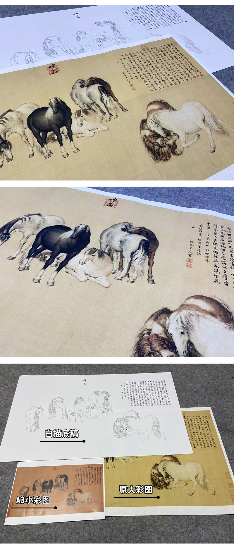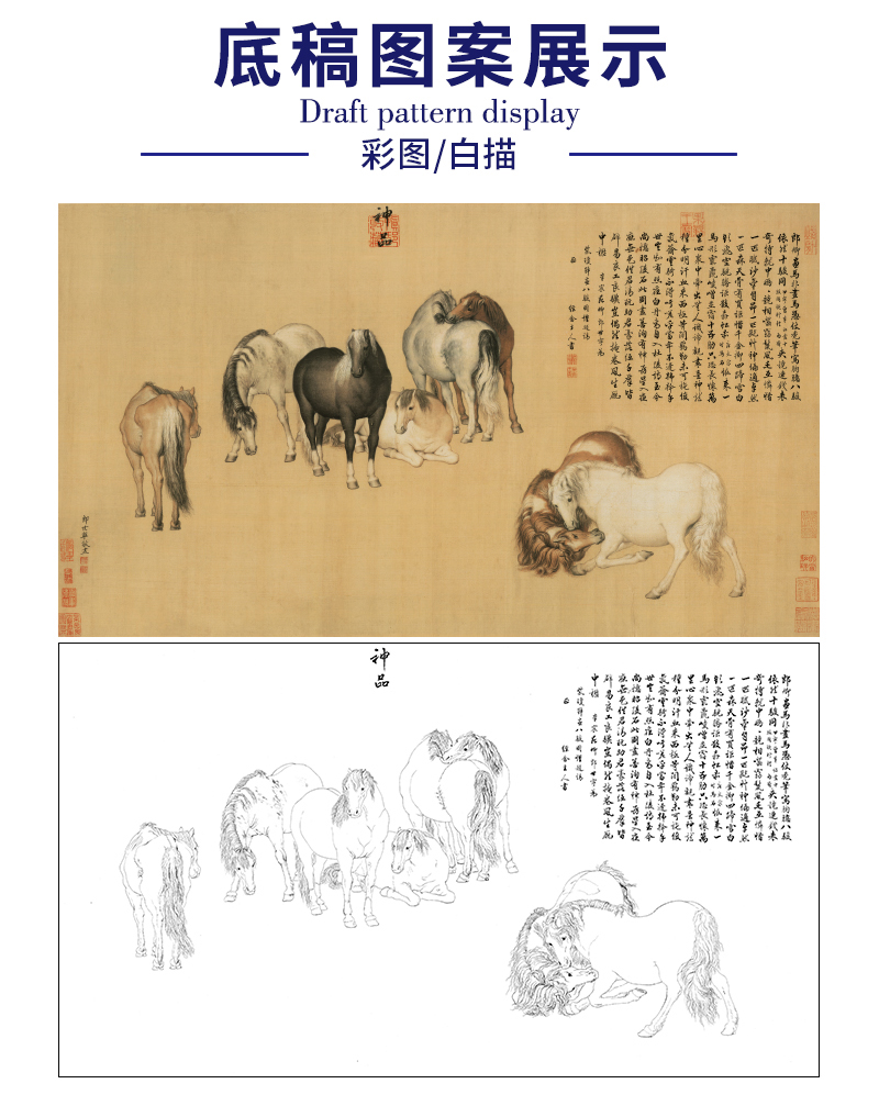 【大彩图】郎世宁横幅工笔画白描底稿《八骏图神品》骏马临摹勾线高清打印稿LS12