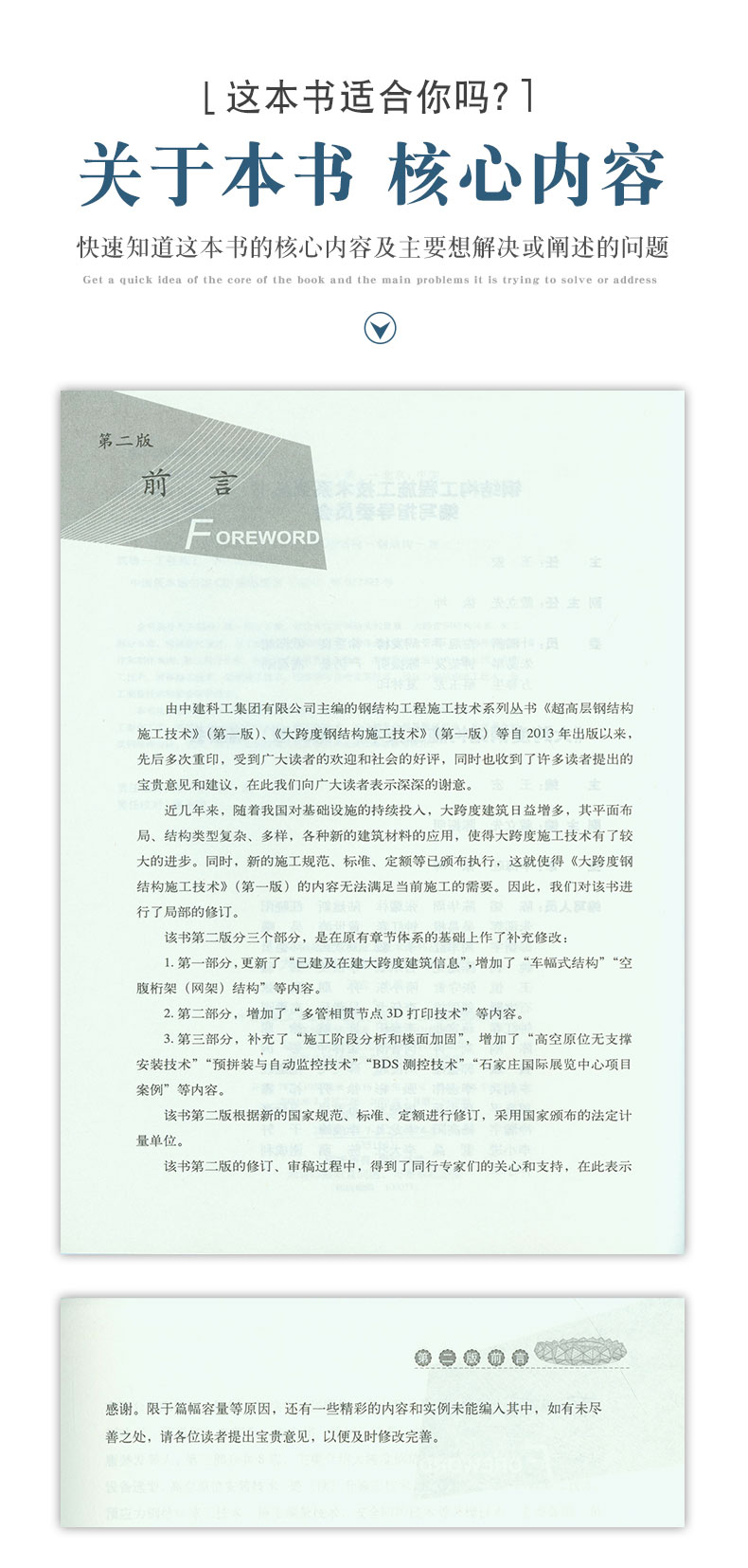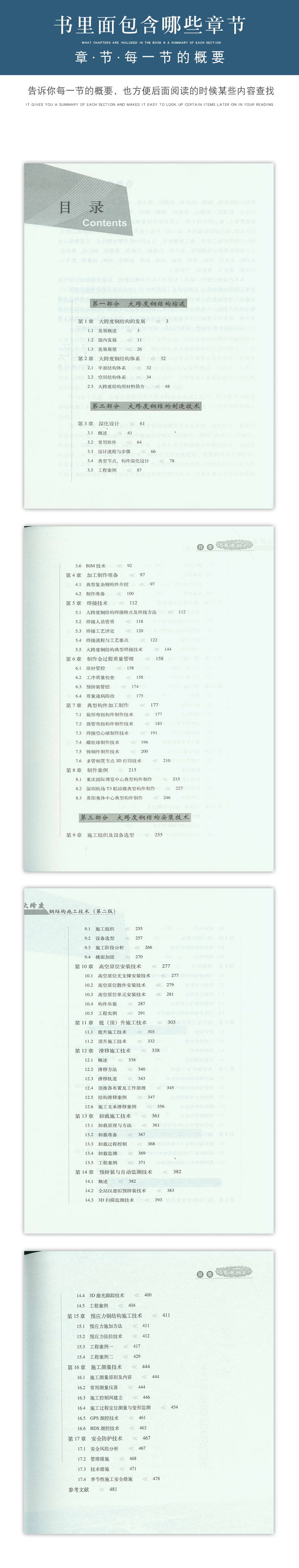 全书共分为三部分:第一部分2章,包括大跨度钢结构的发展、大跨度钢结构体系;第二部分6章,包括深化设计、制作准备、焊接技术、制作全过程质量管理、典型构件加工质量和制作案例;第三部分9章,包括施工部署及设备选型、高空原位安装技术、整体提(顶)升施工技术、滑移施工技术、卸载施工技术、预拼装与自动监控技术、预应力钢结构施工技术、施工测量技术和安全防护要点。
