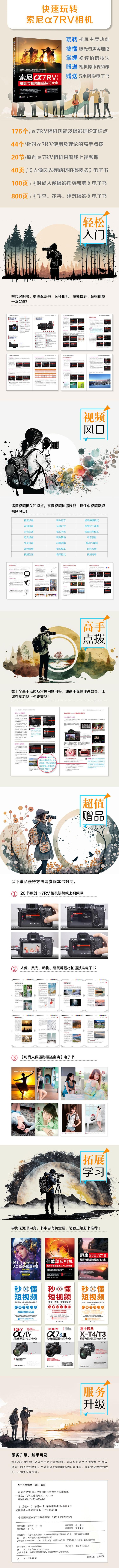本书讲解了索尼α7RV相机的各项实用功能、曝光技巧及在各类题材中的实拍技巧等,通过先学习相机结构、菜单功能,再接着学习曝光功能、器材等方面的知识,最后学习生活中常见的题材拍摄技巧,让读者迅速上手索尼α7RV。随着短视频和直播平台的发展,越来越多的朋友开始使用相机录视频、做直播,因此,本书专门通过数章内容来讲解拍摄短视频需要的器材、参数功能、镜头运用方式以及索尼α7RV相机拍摄视频的基本操作与菜单设置,让读者紧跟潮流玩转新媒体。相信通过本书的学习,读者可以全面掌握索尼α7RV相机拍摄功能,既能拍美图成为朋友圈靓丽的风景线,又能拍好短视频,一举抓住视频创业风口。本书附赠一本人像摆姿摄影电子书(PDF),一本花卉摄影欣赏电子书(PDF),一本鸟类摄影欣赏电子书(PDF),以及一本摄影常见题材拍摄技法及佳片赏析电子书(PDF)。