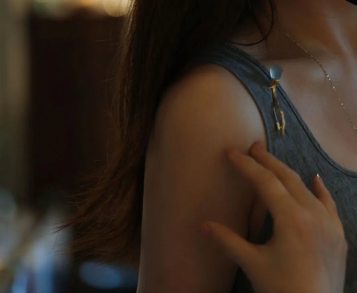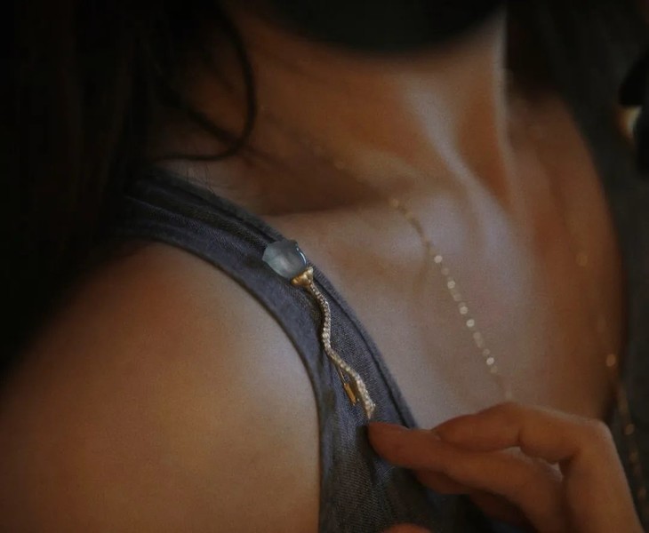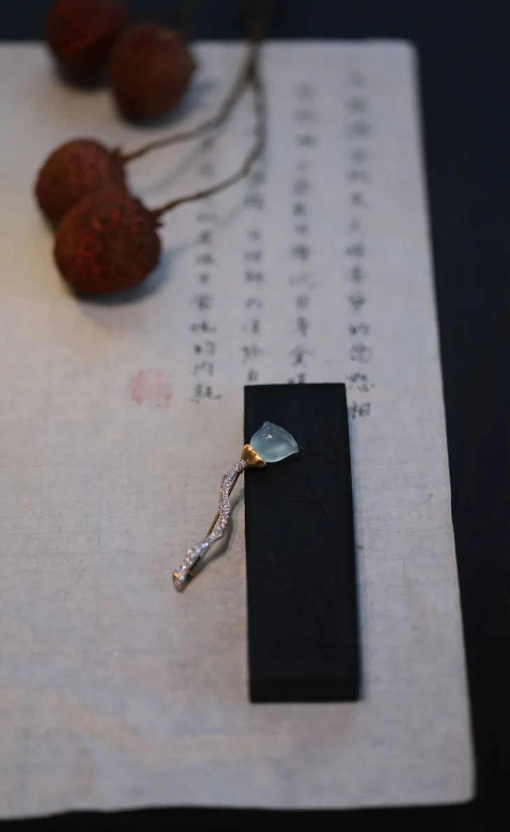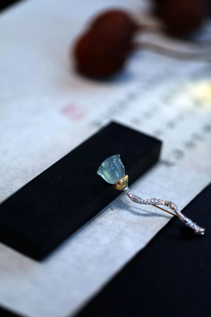 “把古典的灵魂,装入当代的形态里",是我一直思考并践行的设计态度。这个夏天,吃了好多莲蓬子哟,剥着清甜的莲蓬子的夏天,有闲情和逸致,仿佛才不曾辜负过。但喜爱莲蓬已经是多年的事,我在20年前,就画过一副莲蓬与荷叶的大尺寸油画,至今放在办公室里。这组莲蓬的设计,是让种水极美的翡翠与镶嵌保持一定的距离,更凸显主石之美,枝干与莲蓬的形状不尽相同,形成一组的组合感。它会是很有骨骼感的一件作品,可以举重若轻地作为胸针或者一个夏天衣衫的扣子使用。正因为有生存,有消失,有枯有荣,才包含了更多层次,肌理丰富的生命之美,也是这件作品和其主石的特别之处。