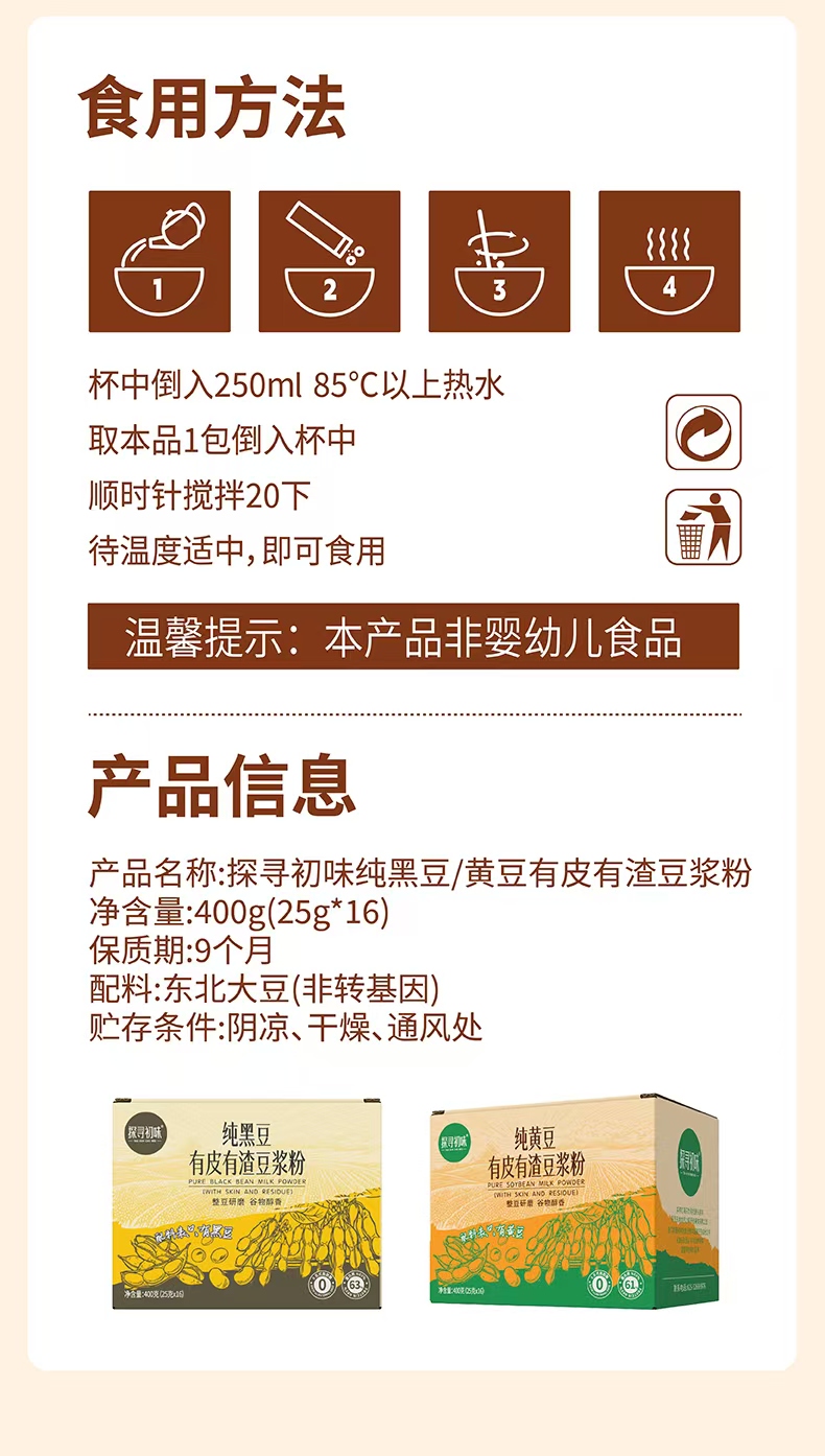 2. 价格:探寻初味—纯黄豆/黑豆有皮有渣豆浆粉 团购价 黄豆豆浆粉400g*1盒29.9元,黑豆豆浆粉400g*1盒29.9元(港澳台、新疆、西藏、不发货,云南、贵州、广西、青海、甘肃、宁夏、海南、内蒙古+3元快递费用)全国其他地区包邮。