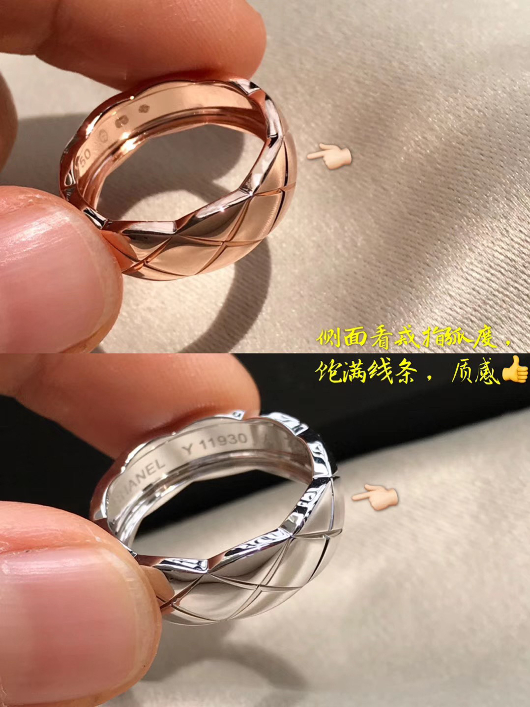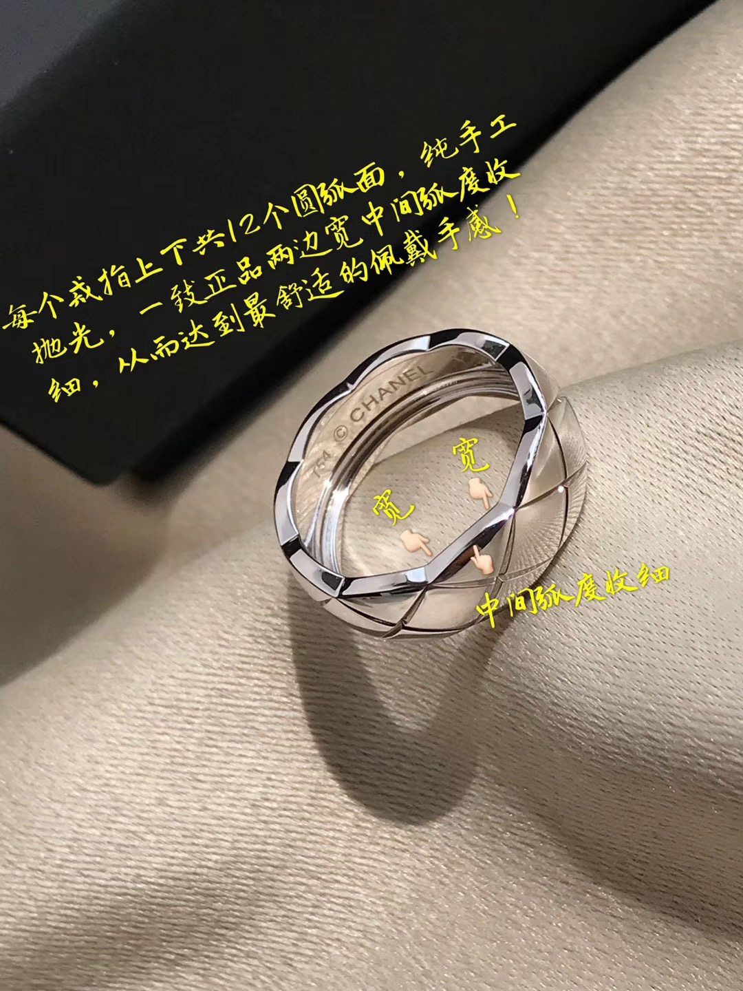 看似简单实则非常重工的一款戒指!工艺分析:4条交叉菱格纹为cnc雕刻刀一条一条切出来,而非低成本倒模件,过完机后还需要纯手工去修饰打磨每一条刀痕,使所有刀痕一致朝内,只有这样才能使菱格的线条感与棱角感达到正品一致完美立体空间切的视觉效果‼交叉中间宽逐渐变细过渡到尾部,粗细渐变,整个线条要均匀流畅!刀痕切割由深到浅,过深过浅都不可以,一定要控制的很好!从侧面看戒指切割线条,中间高两边低的立体效果‼再到内圈抛光,并且戒指内壁上下边的边缘都有凸出的一圈五金,都是抛光处理,细腻细节,真金工艺,银的价格!认准品质‼‼‼