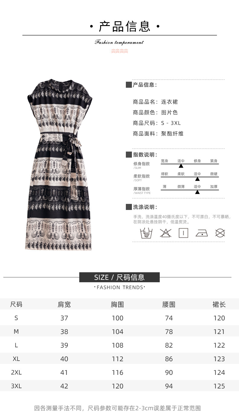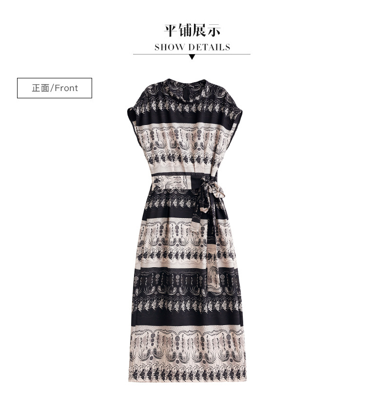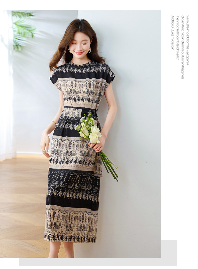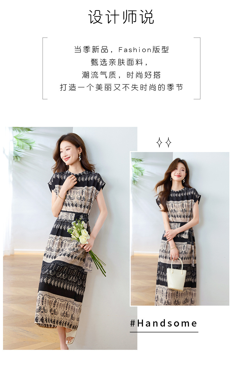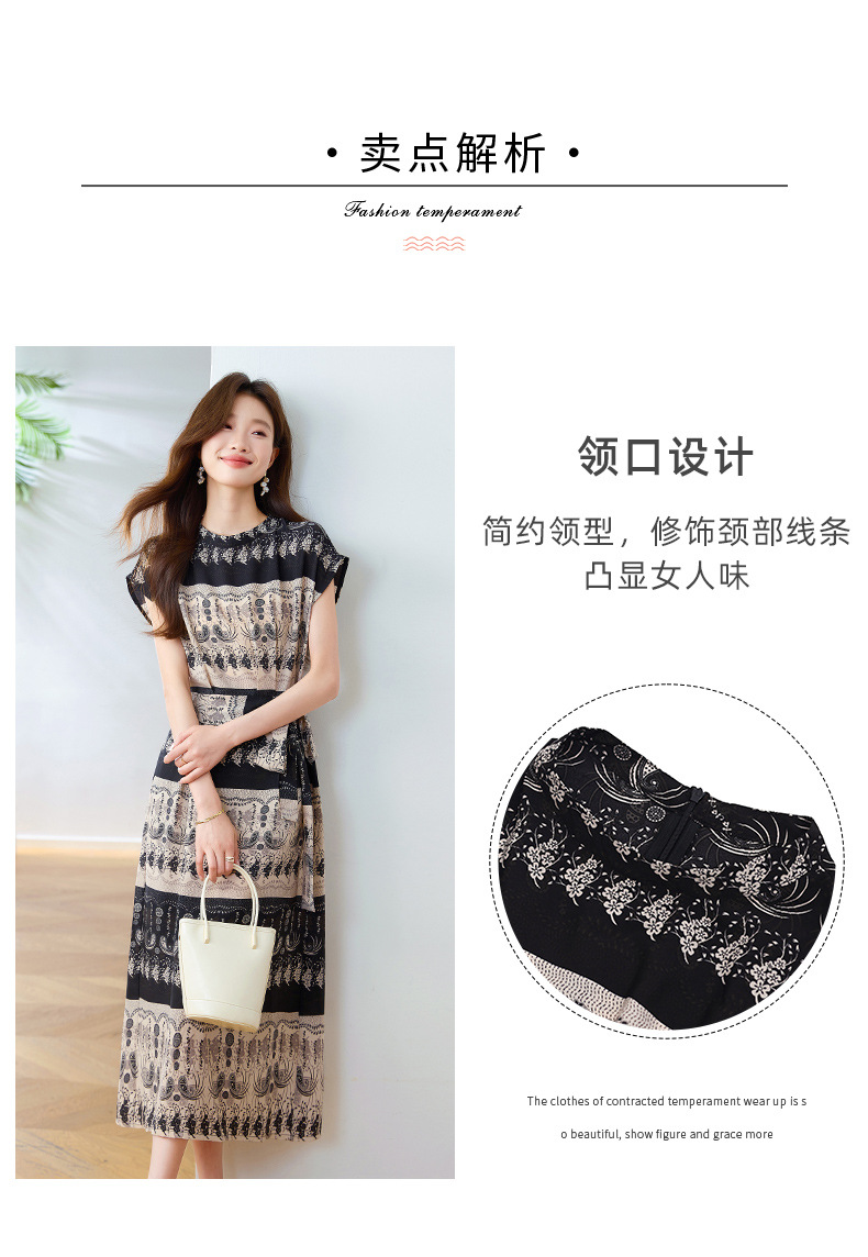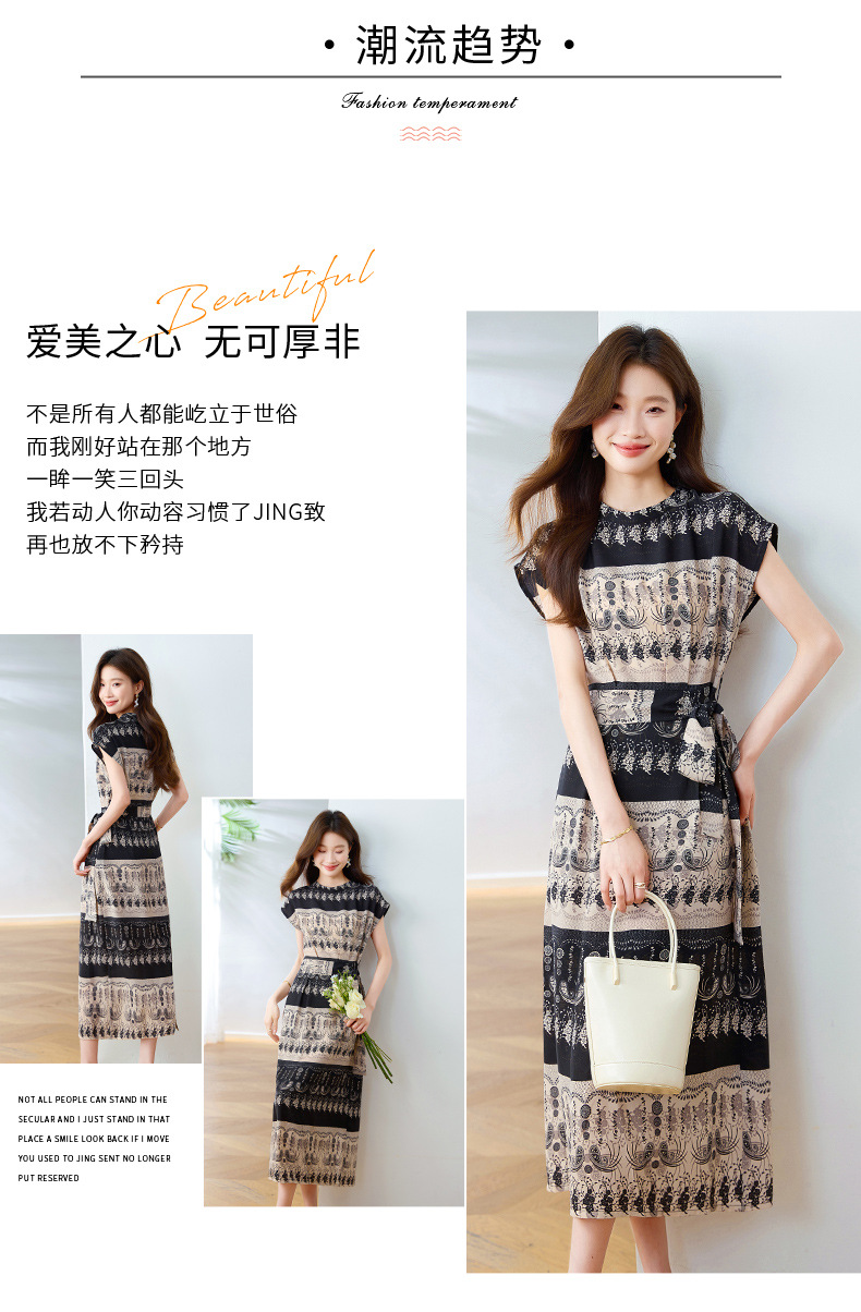 雀说新款女装显瘦气质圆领印花修身长款系带时尚连衣裙AL5013