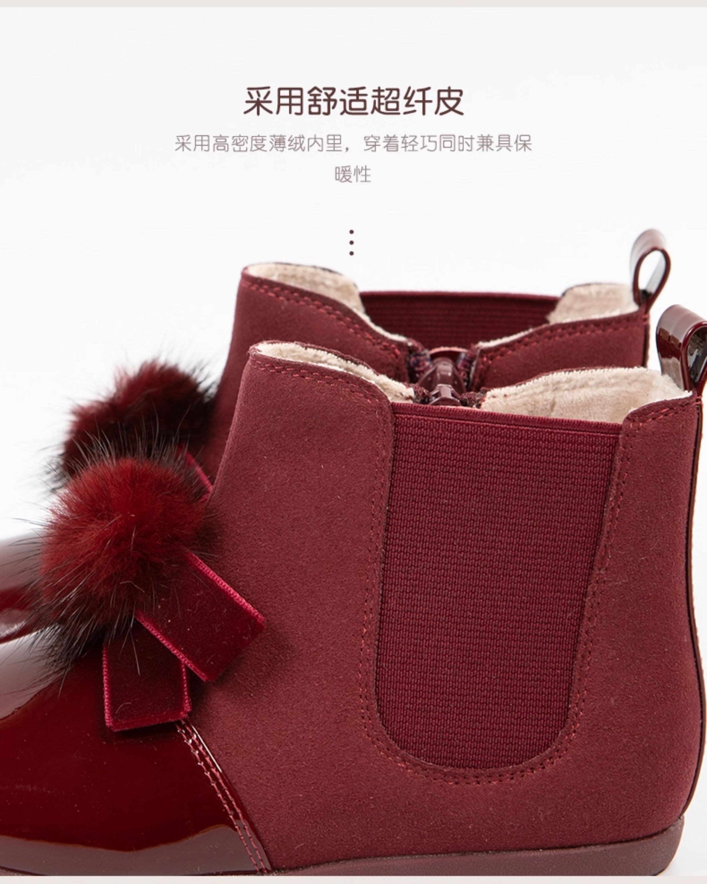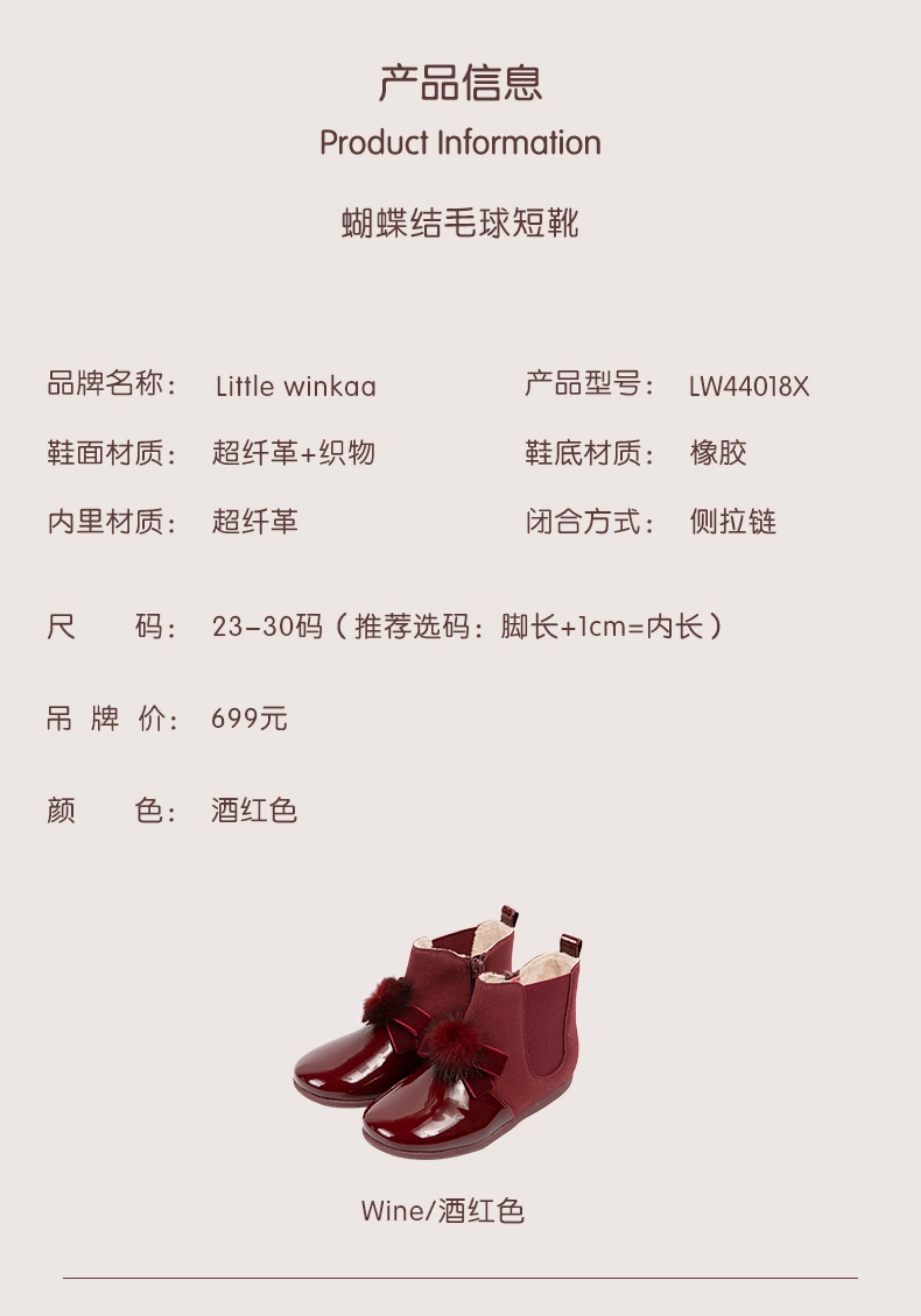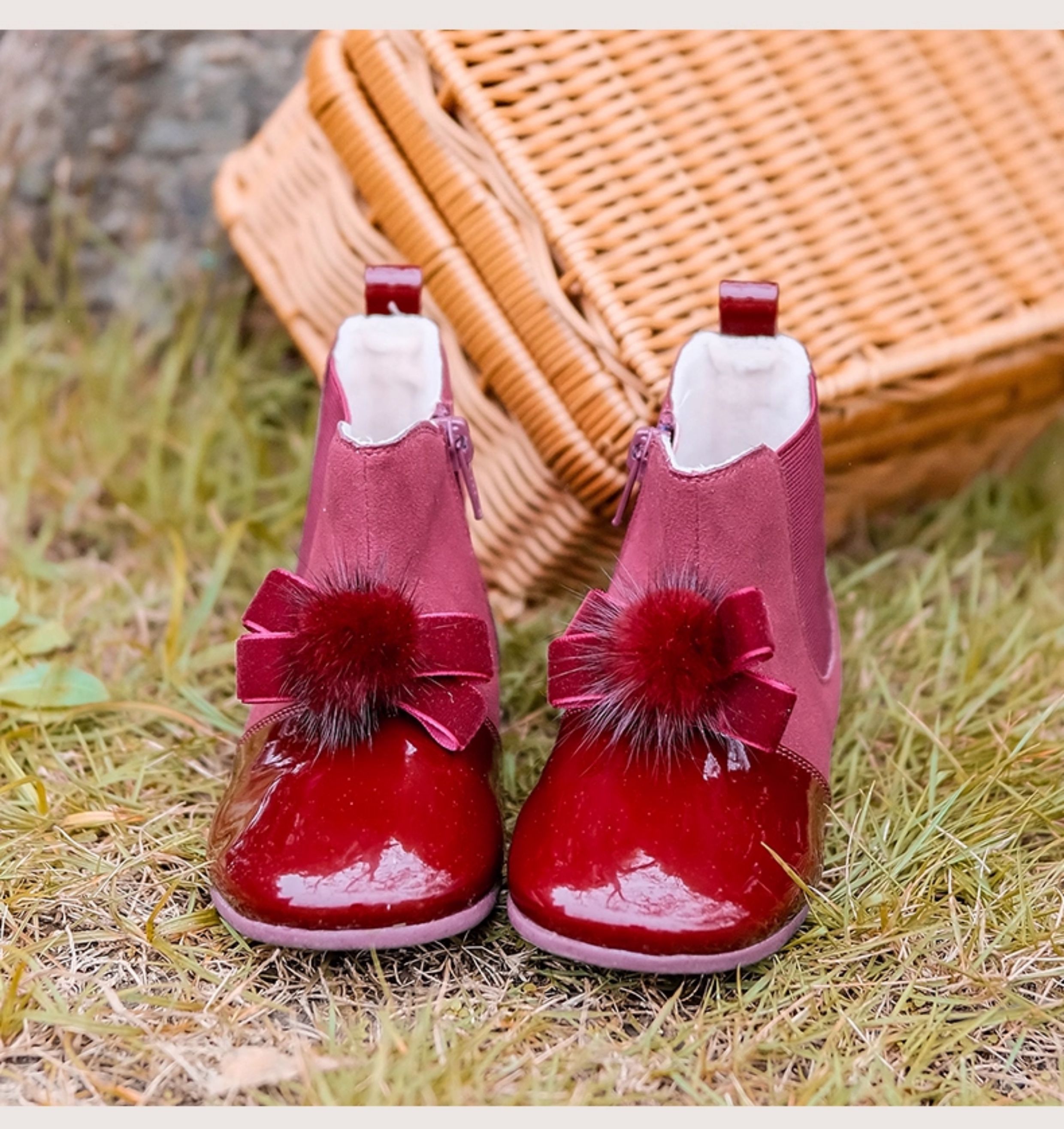 春节不打烊-西班牙little winkaa蝴蝶结毛球短靴女童公主皮靴2025新款冬季加绒