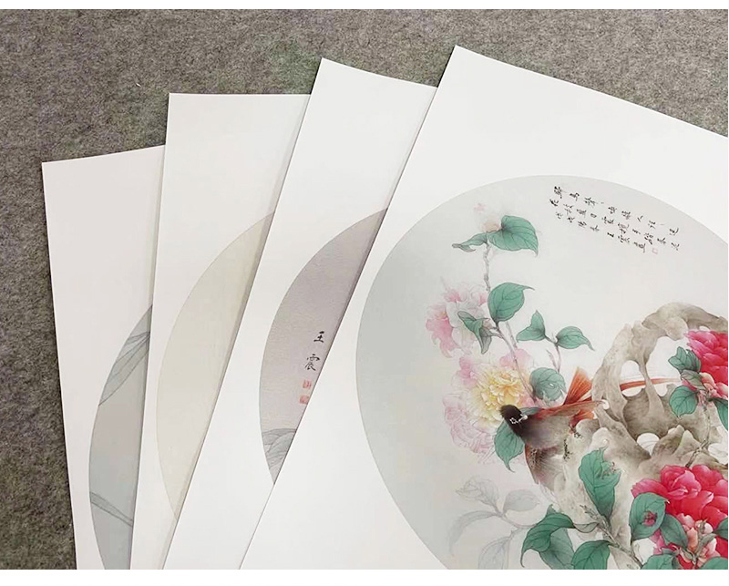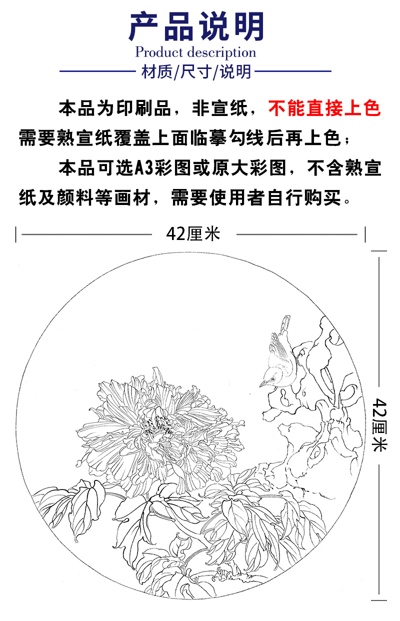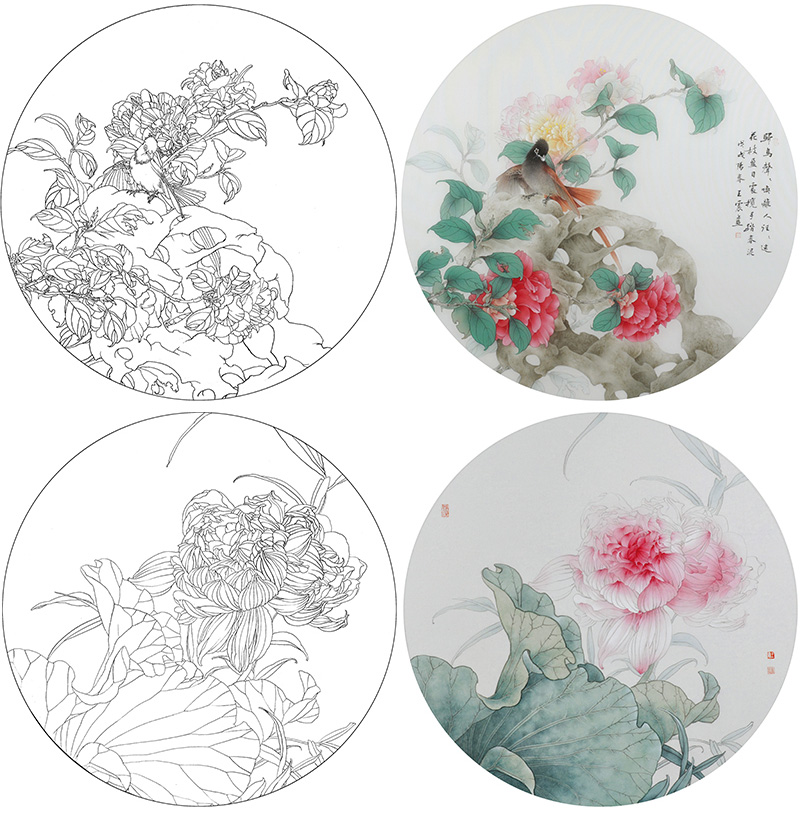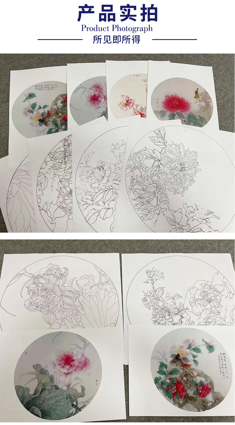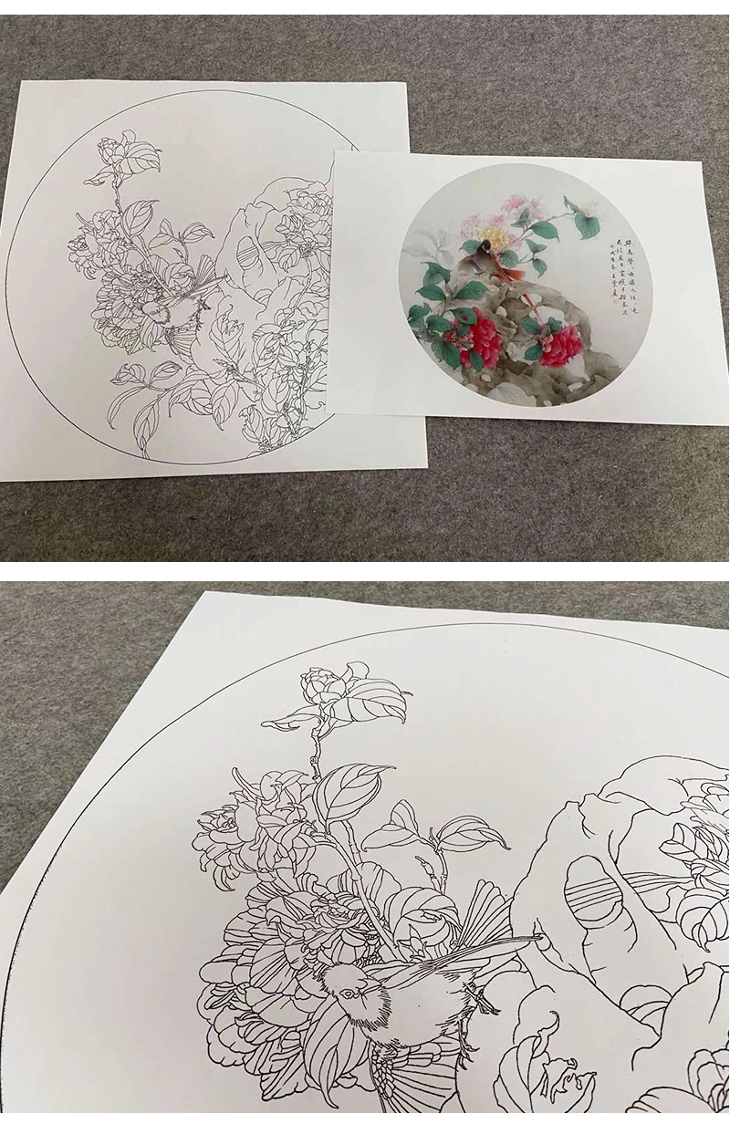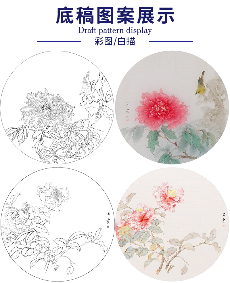 王震工笔花鸟画白描底稿牡丹翠鸟小品一套四幅册页初学者尺寸42×42厘米TA04