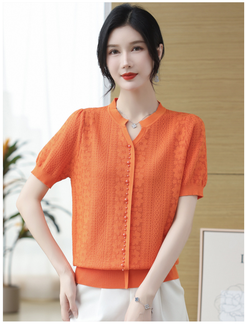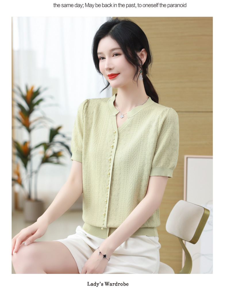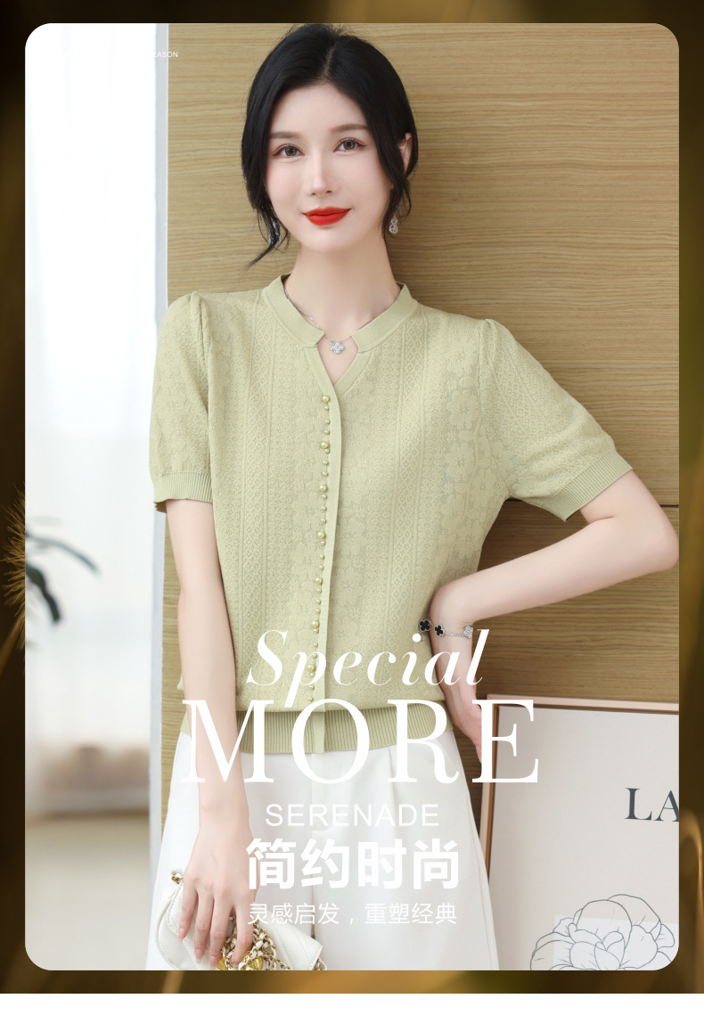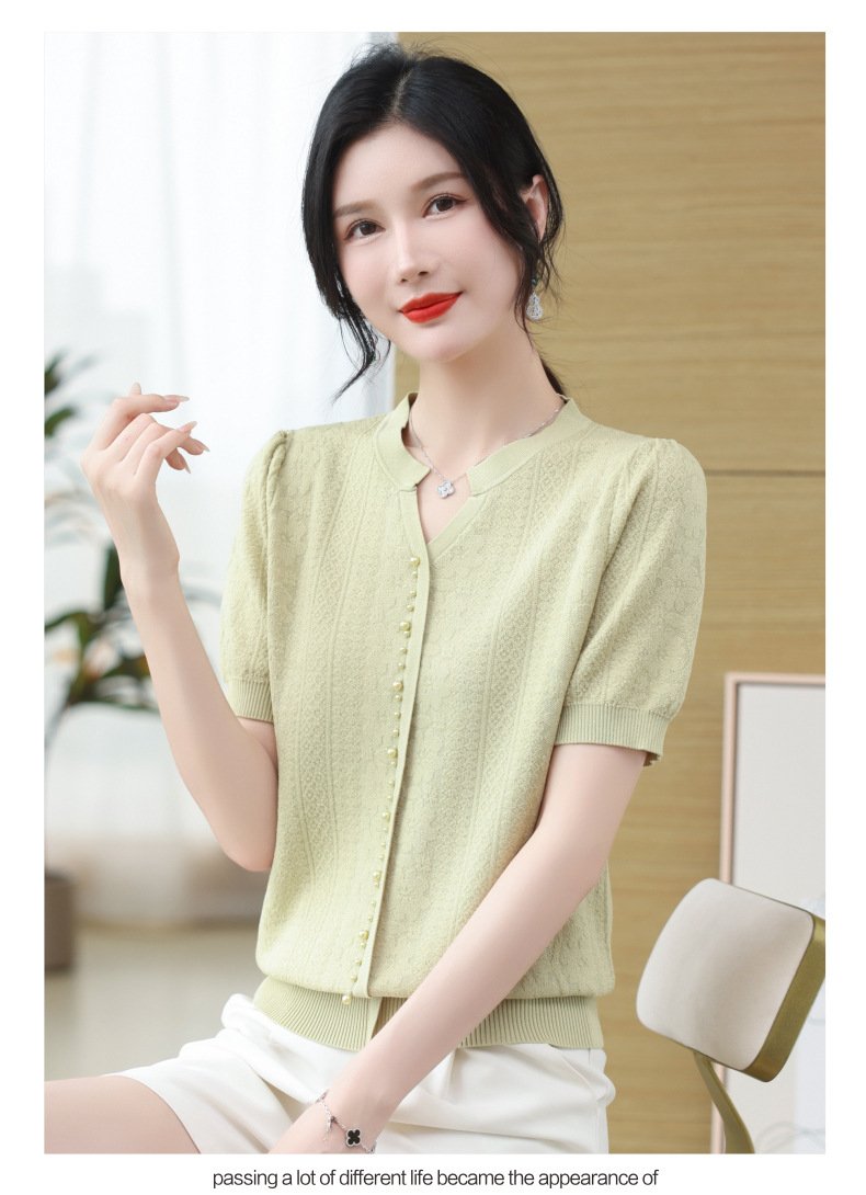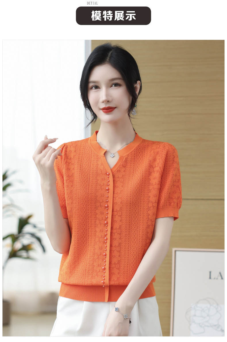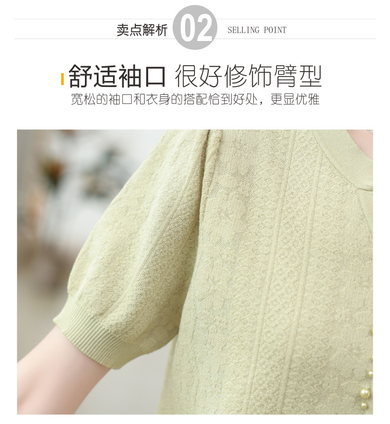 雀说冰丝短袖t恤新款洋钉珠气显瘦体恤衫针织衫宽松上衣AL