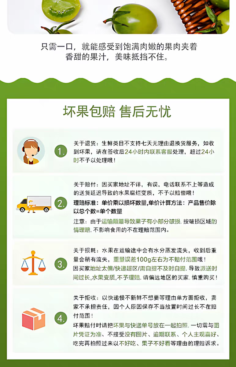 ③生鲜果蔬产品不支持退货退款,收到货后有任何质量问题,在24小时之内拍照联系客服进行售后理赔,售后方式按比例赔付(赔付金额=付款金额/产品总个数*坏果个数)。感谢您的信任,祝您购物愉快!