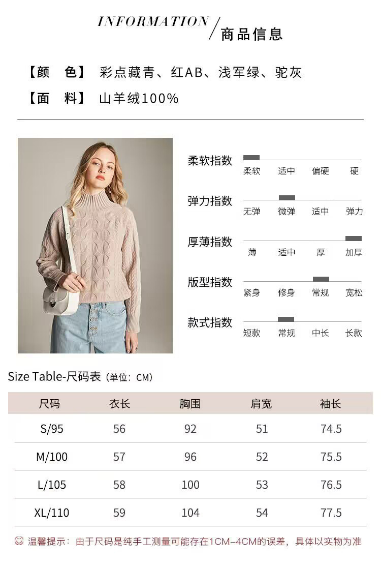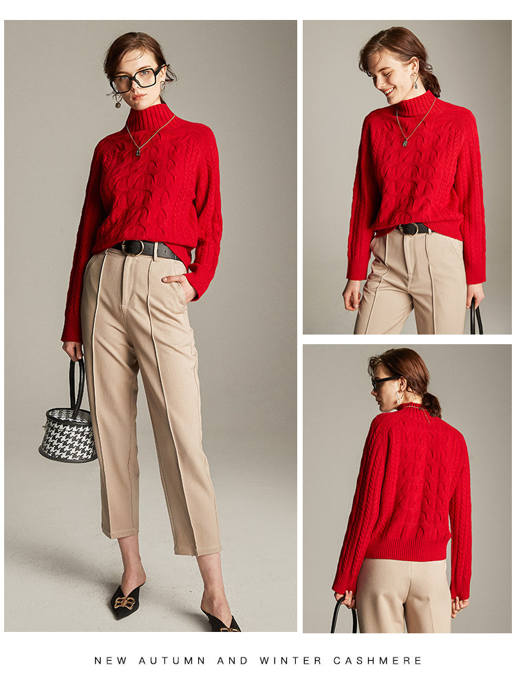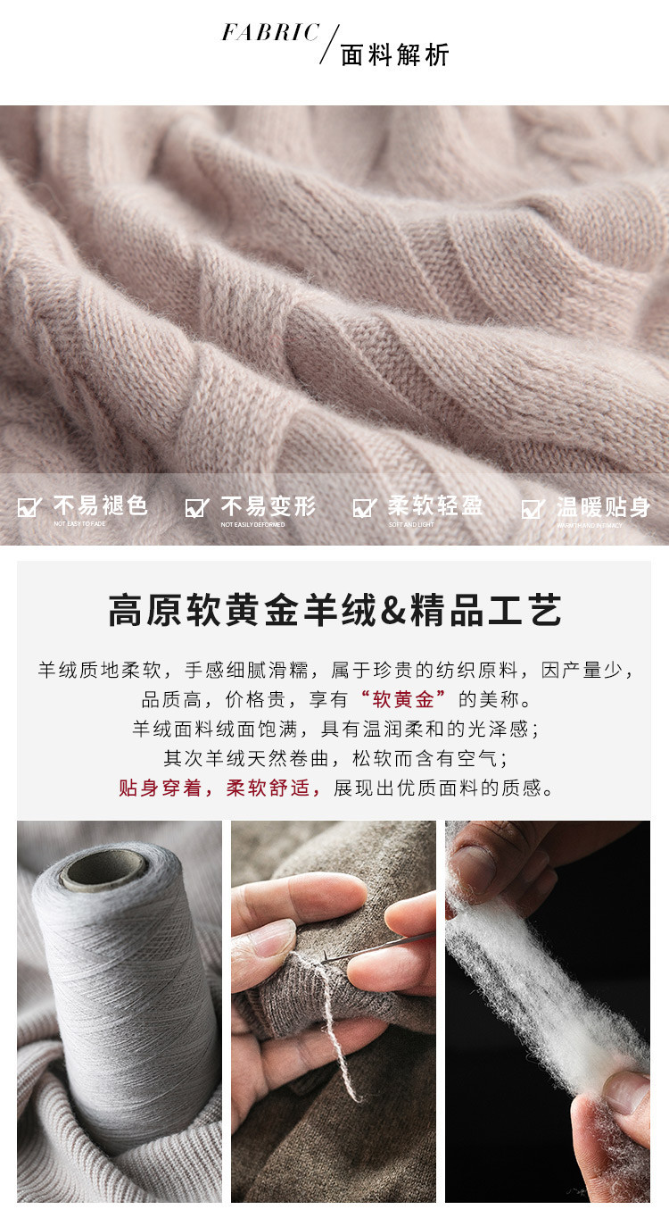 PALUOPO/PL帕罗7针加厚半高领立体绞花软糯亲肤羊绒衫女ET20016R-A