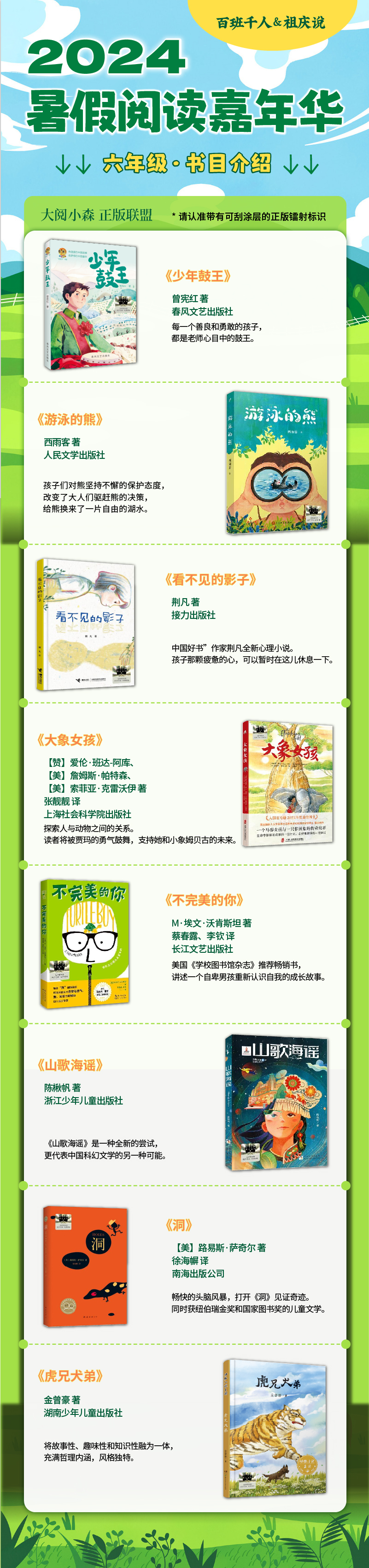 少年鼓王 游泳的熊 看不见的影子 大象女孩 不完美的你 山歌海瑶 洞 虎兄犬弟 2024年百班千人暑期书目6年级套装8本|祖庆说名师推荐正版现货速发小学生课外阅读