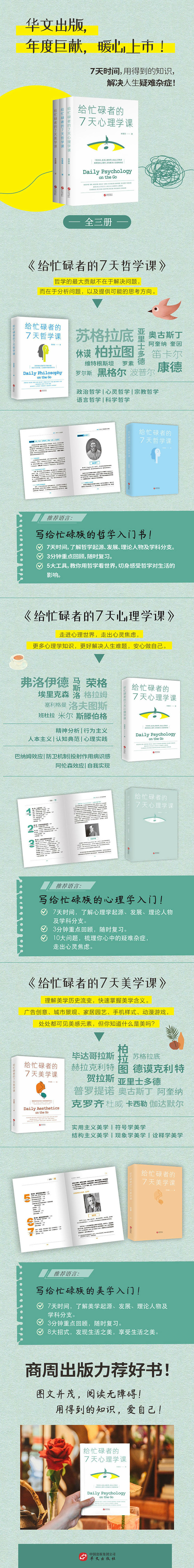 《给忙碌者的7天心理学课》看了很多成功学,发现自己仍然原地踏步;读了很多心灵励志,回到生活发现自己仍然没变。原来,那些书讲了很多似是而非的道理,对于认识自己,并没有真正的帮助,而认识自己,才是解决一切问题的开始。世界上却存在这样一个学科,能够帮助你认识自己。千百年来,这个学科里的许多智者贡献了大量知识、理念、方法和技巧,可以让我们用来认识自己,了解他人。没错,这个学科就是心理学。