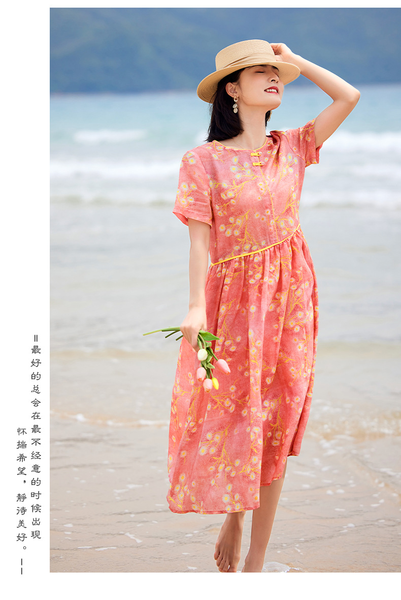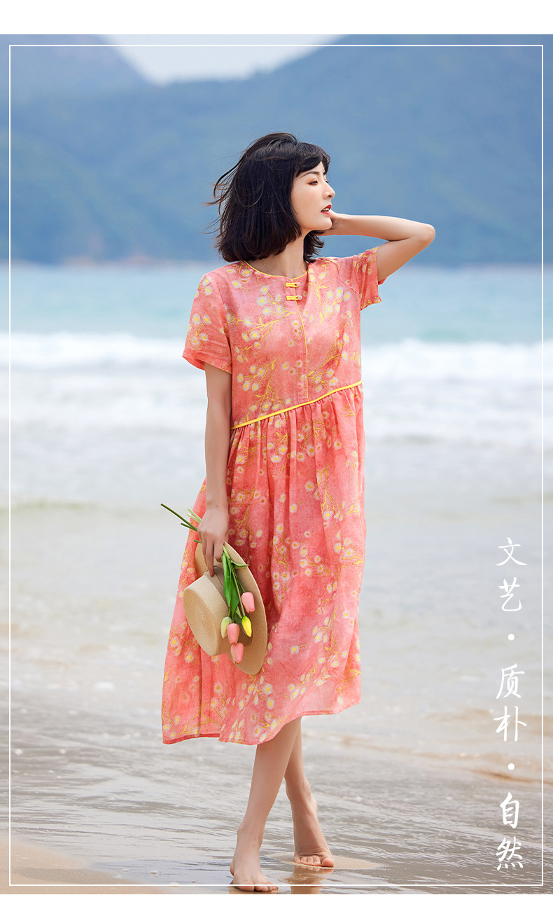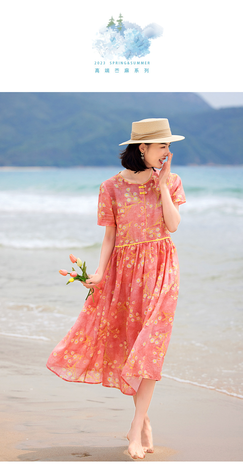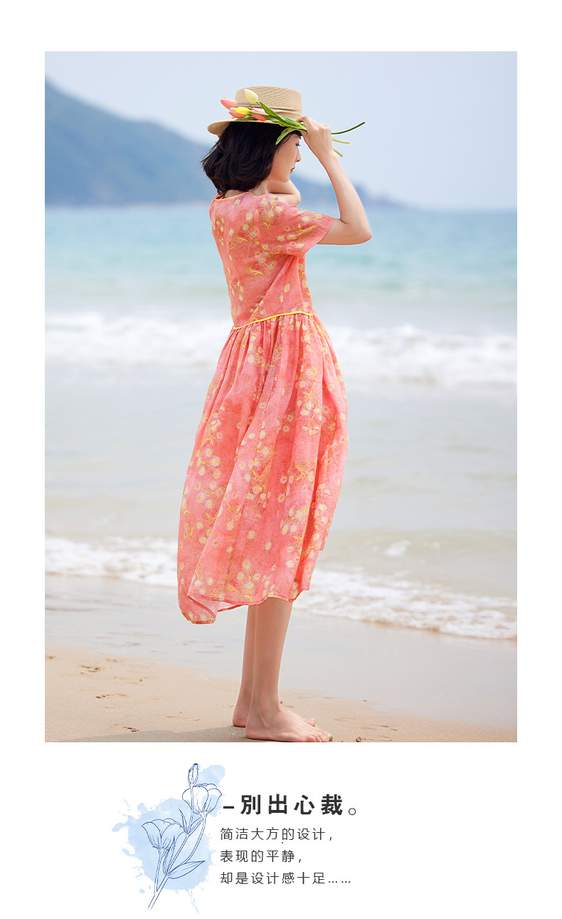HM-S376夏季新款苎麻印花连衣裙薄款文艺碎花短袖圆领温柔风大摆裙女