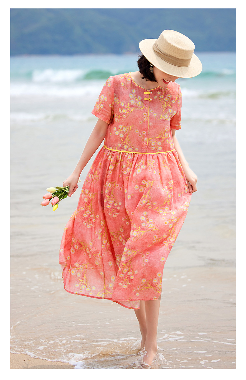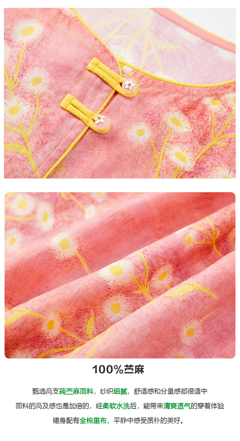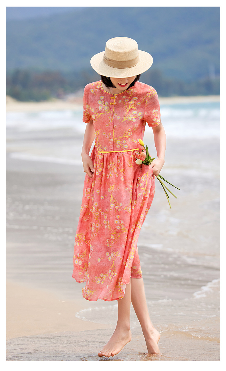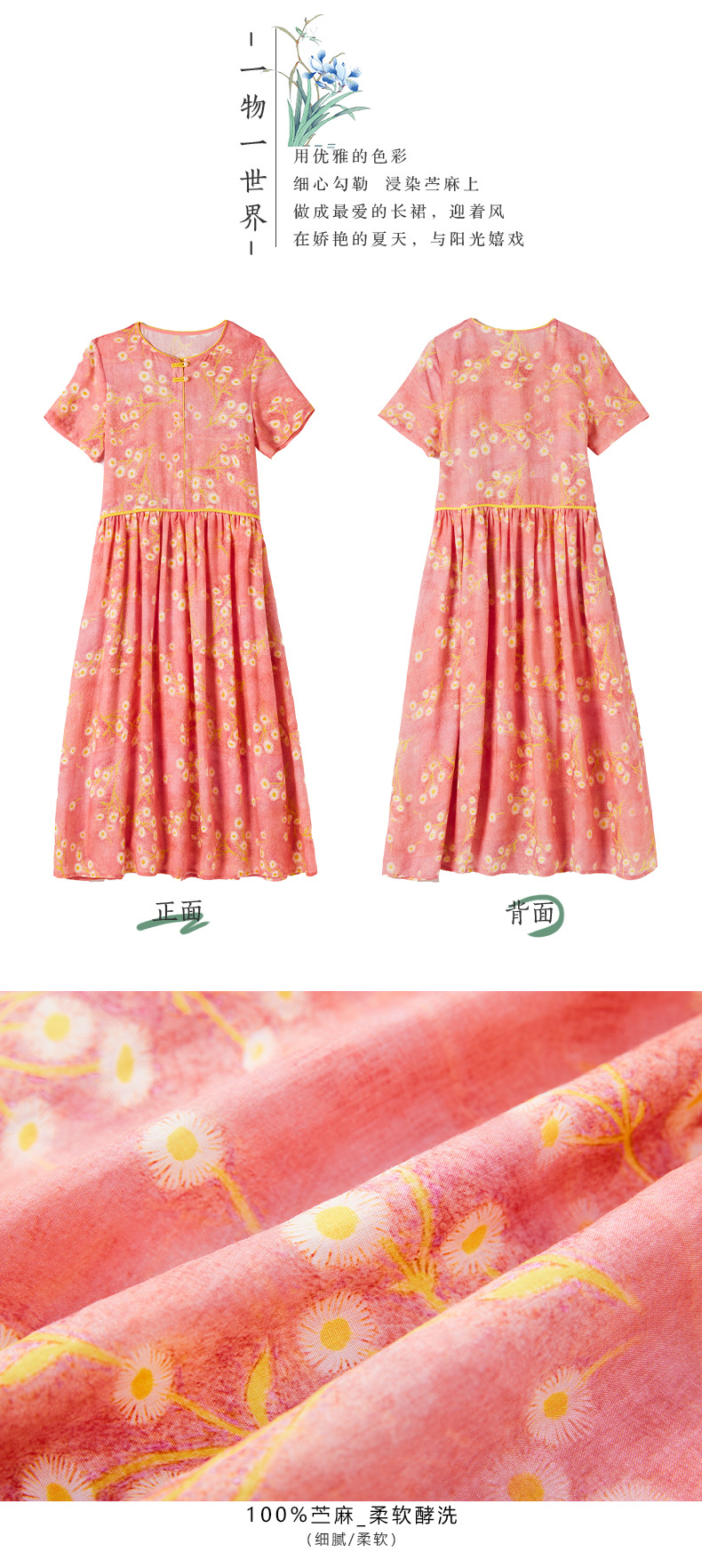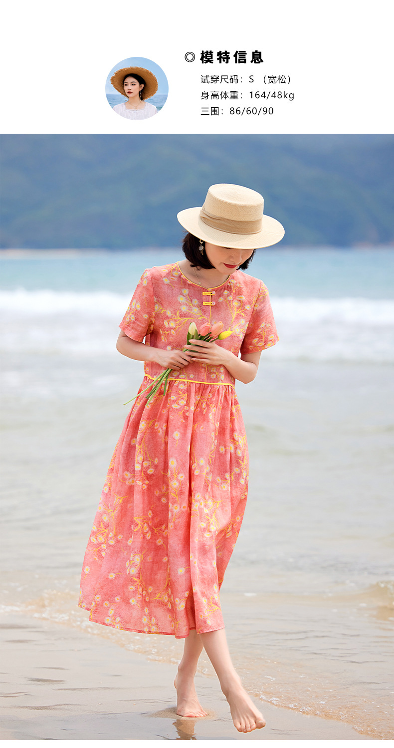 HM-S376夏季新款苎麻印花连衣裙薄款文艺碎花短袖圆领温柔风大摆裙女