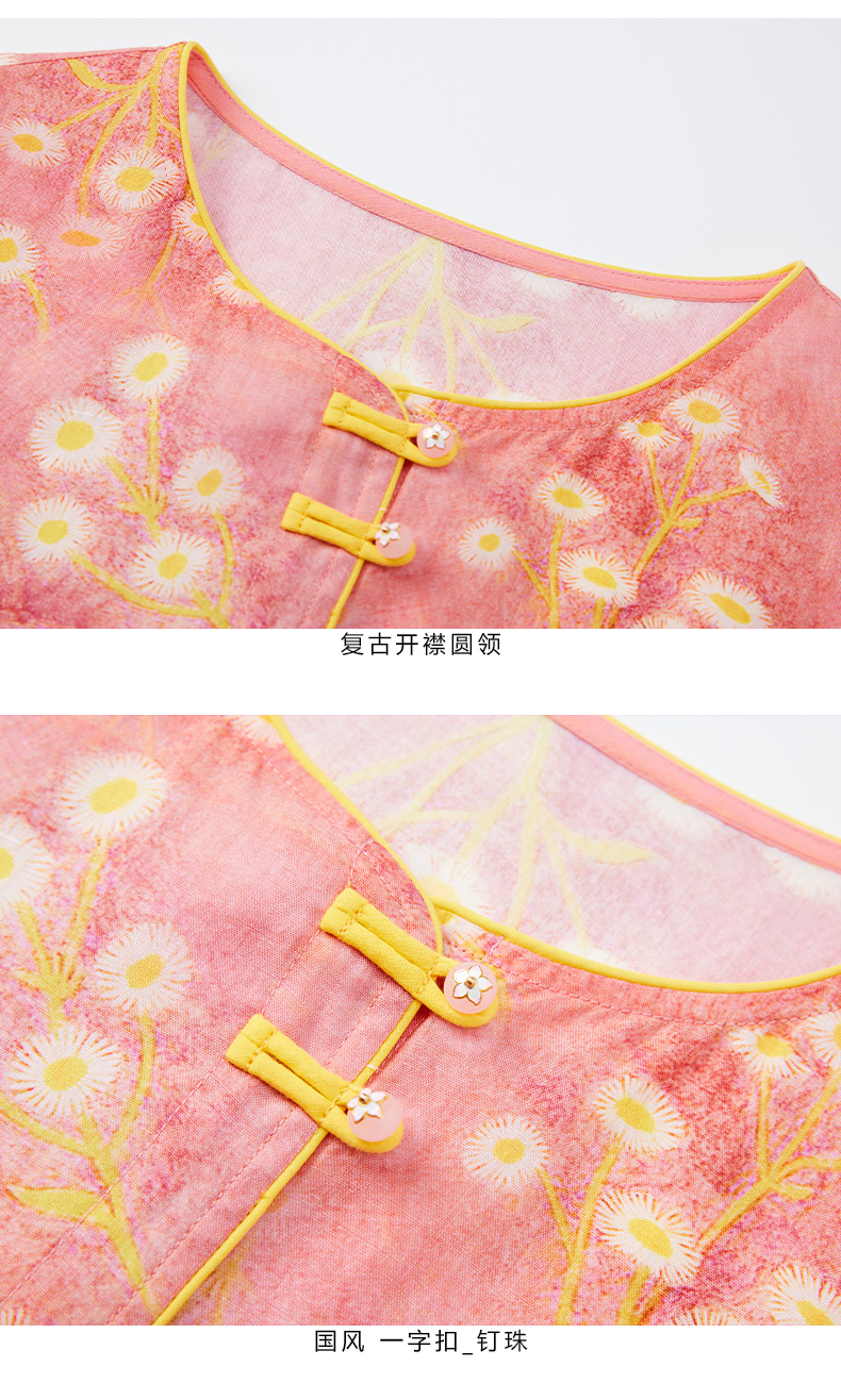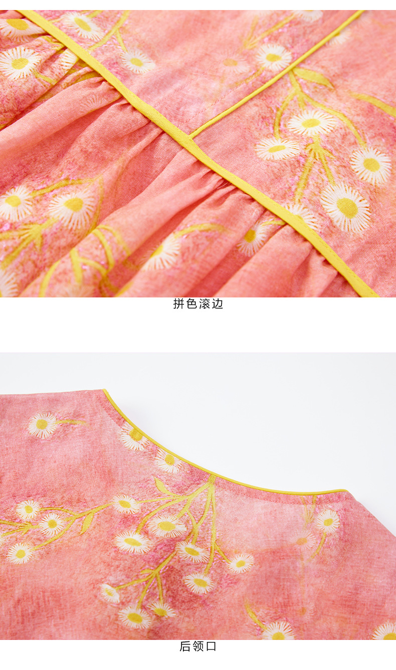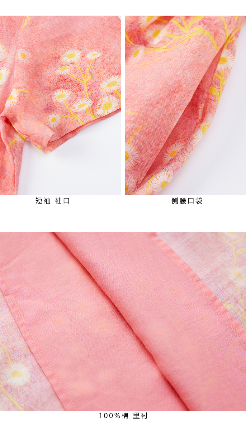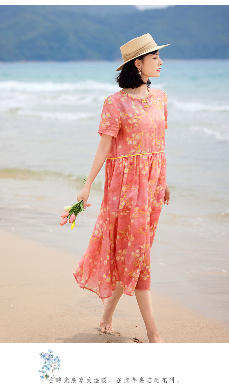HM-S376夏季新款苎麻印花连衣裙薄款文艺碎花短袖圆领温柔风大摆裙女