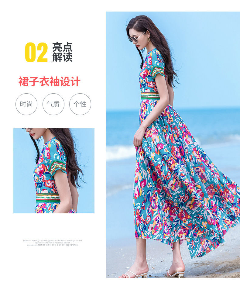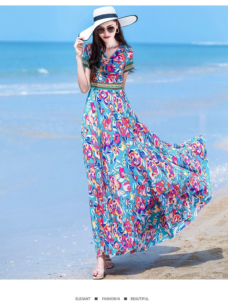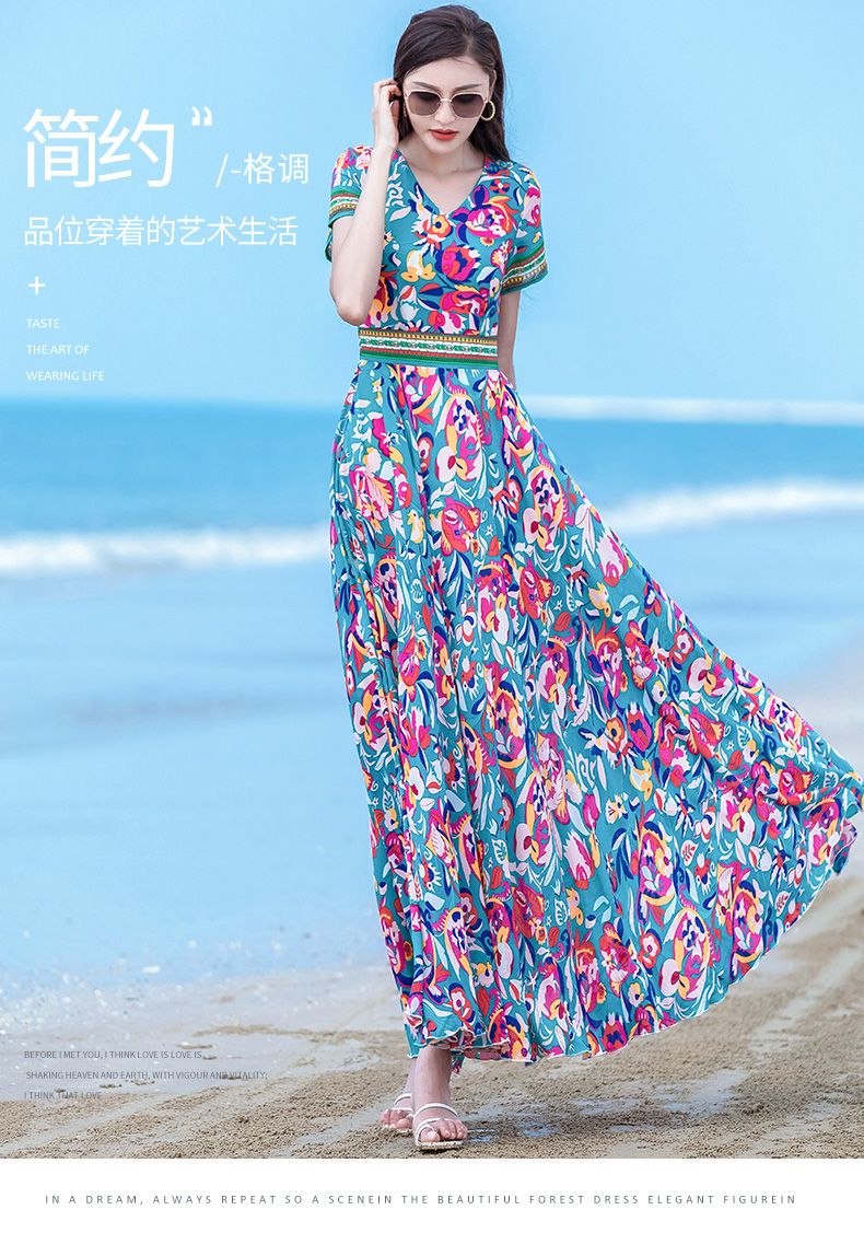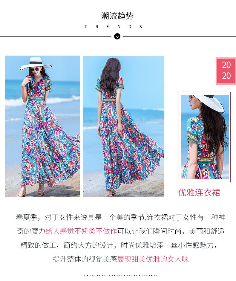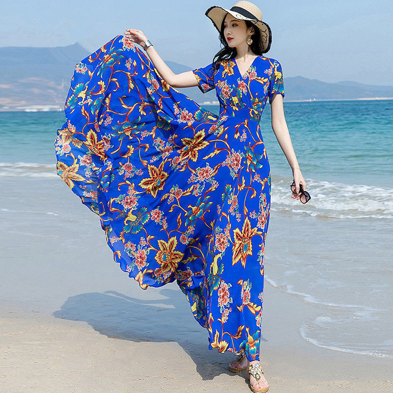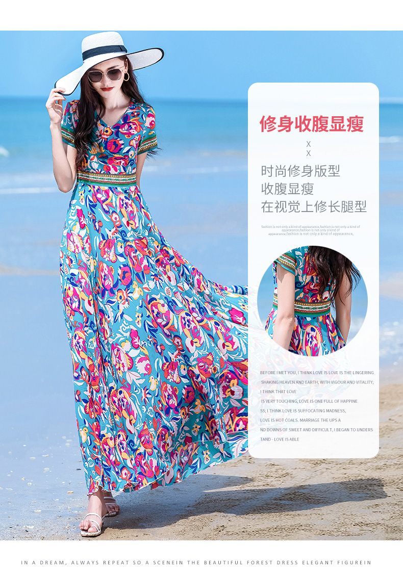 DD-印花雪纺连衣裙女2023新款夏季气质修身显瘦短袖到脚踝大摆长裙子