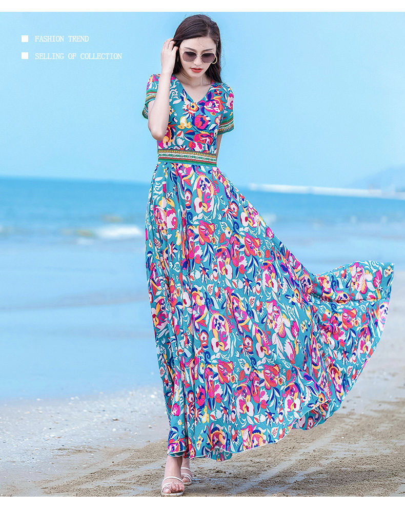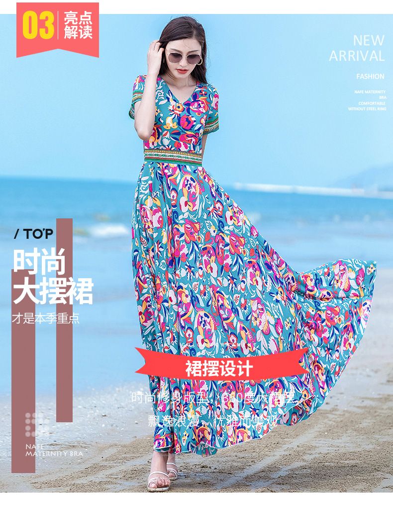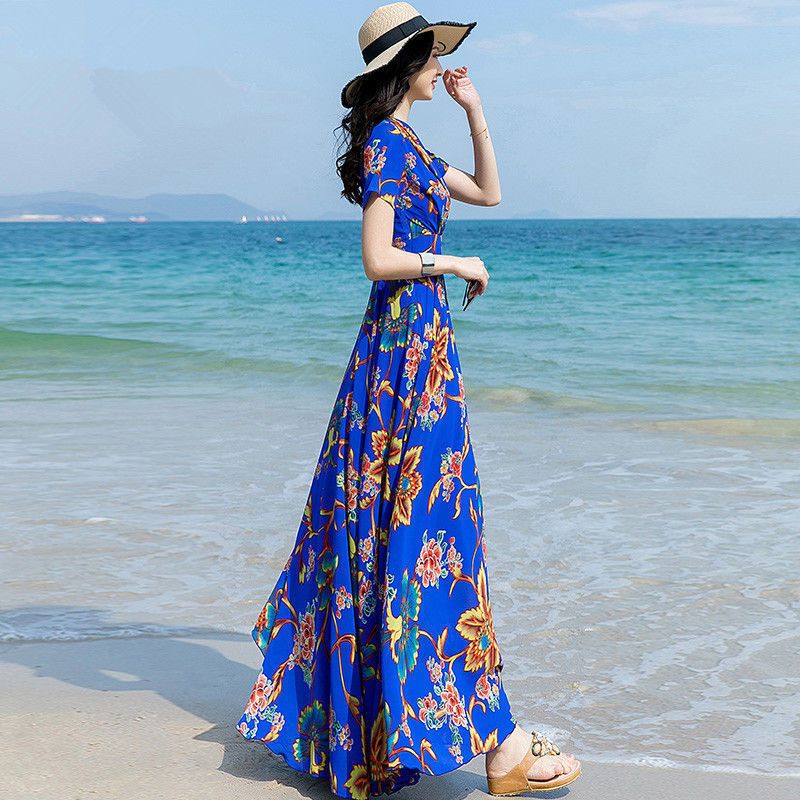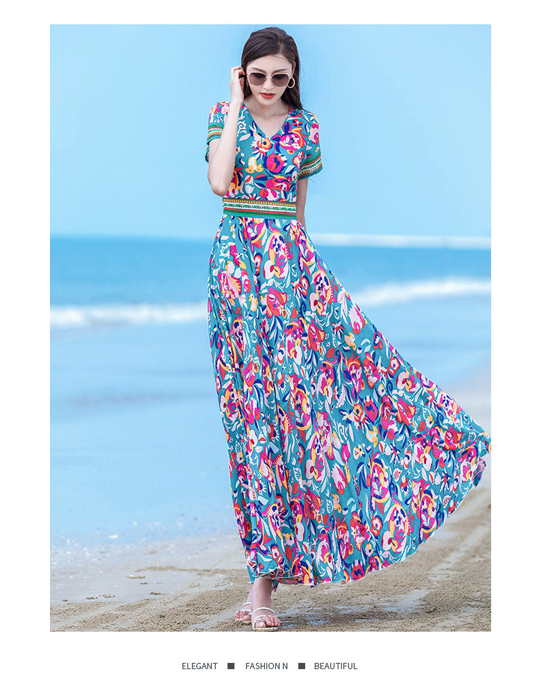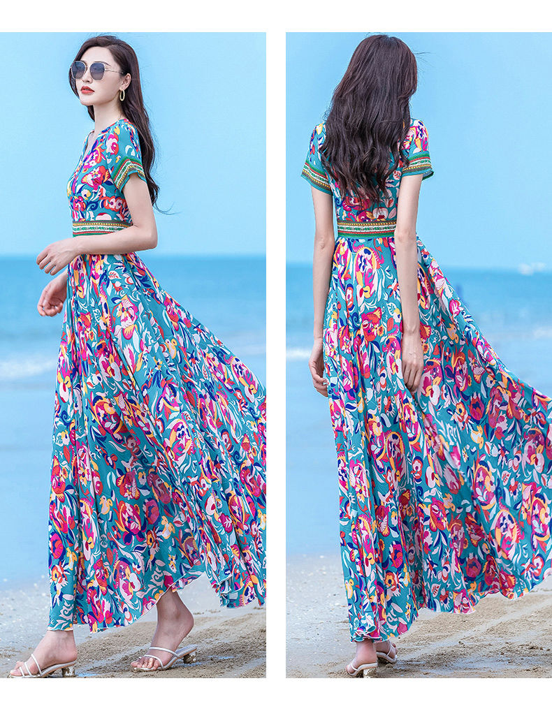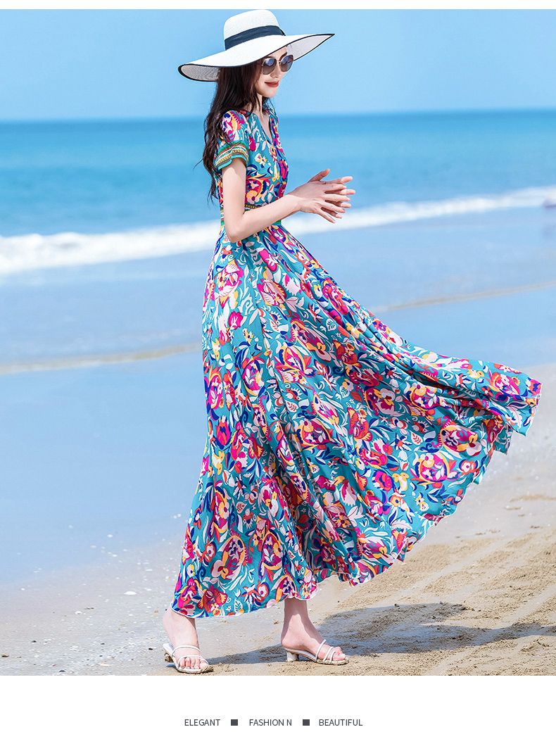 DD-印花雪纺连衣裙女2023新款夏季气质修身显瘦短袖到脚踝大摆长裙子