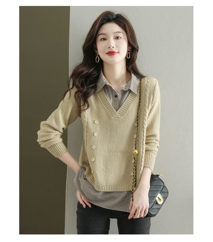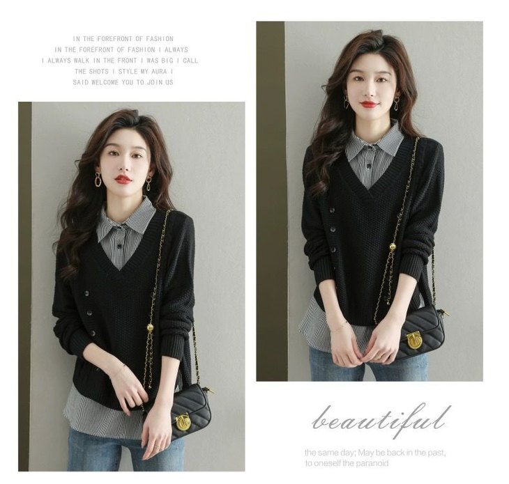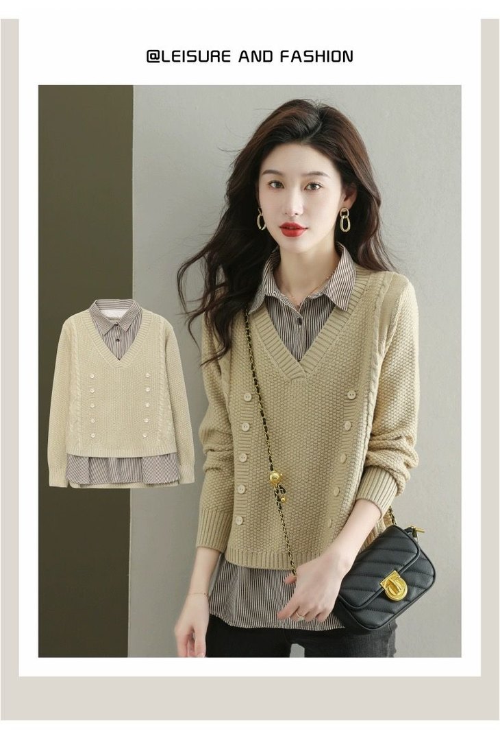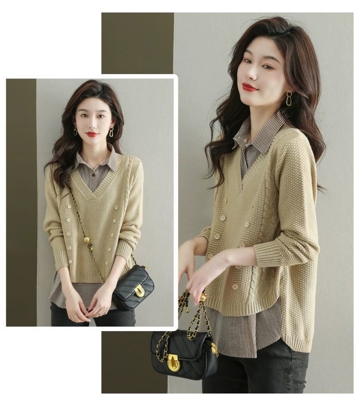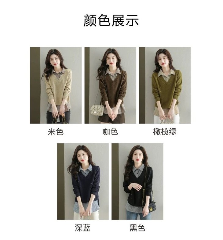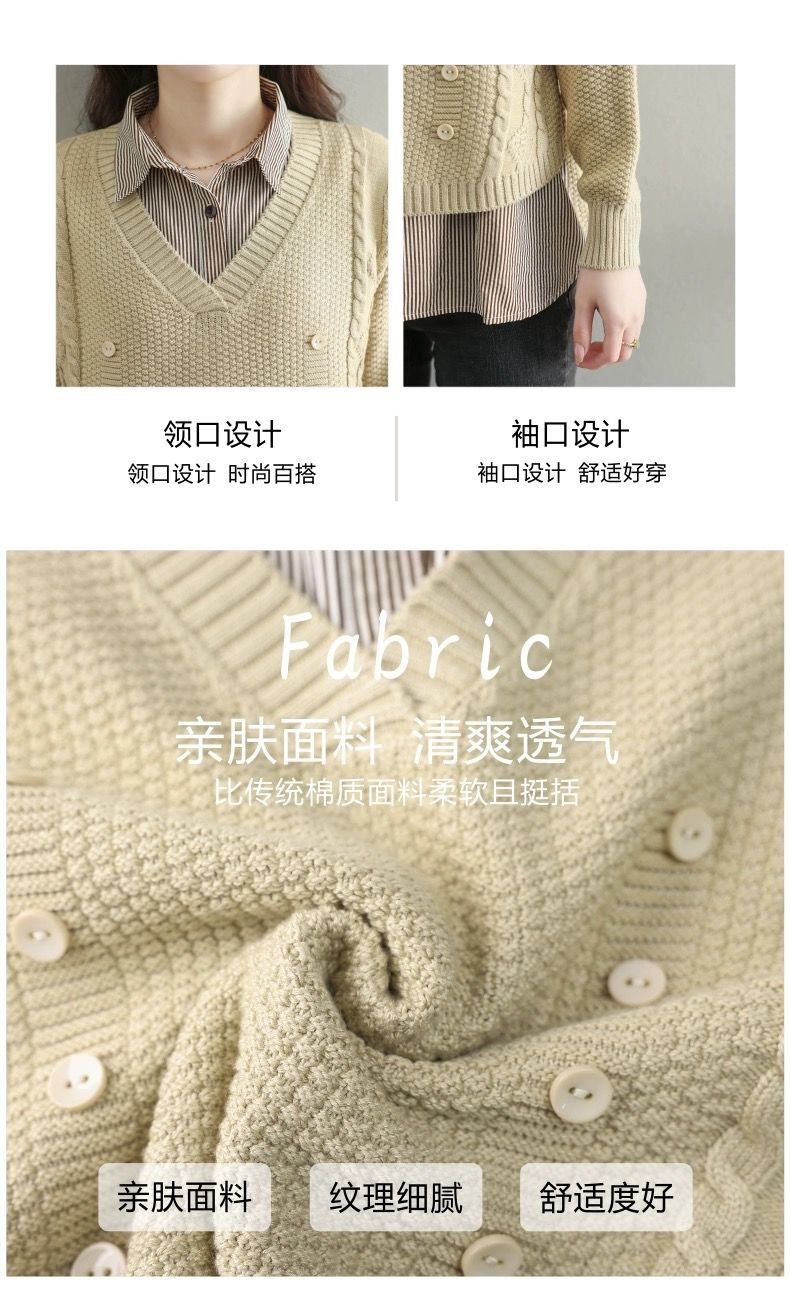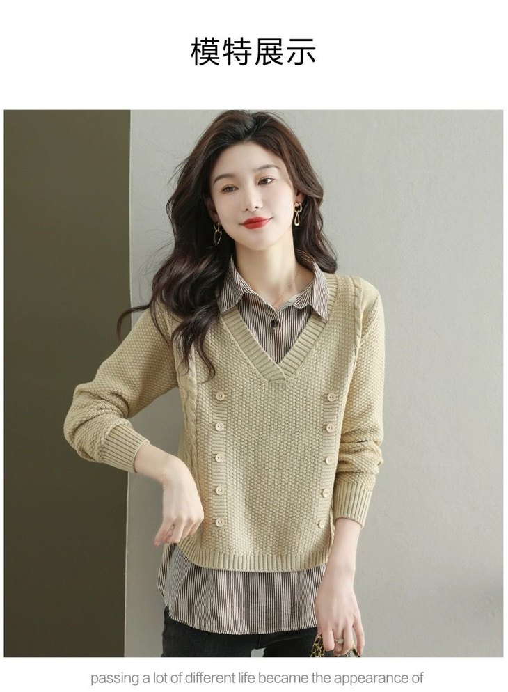 假两件上衣女士春秋常规款针织衫秋装2023新款宽松洋气衬衫领毛衣DD