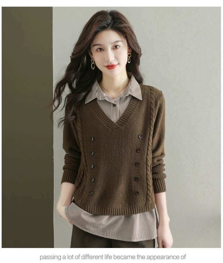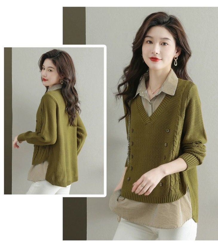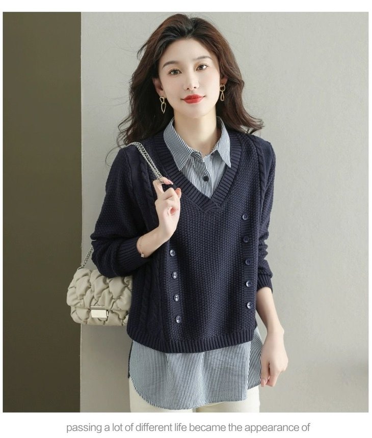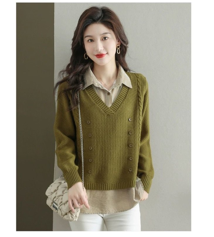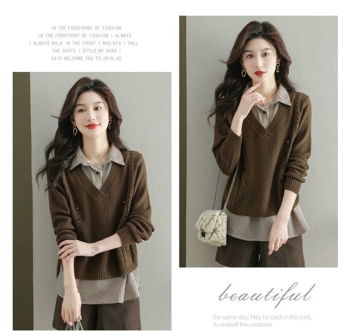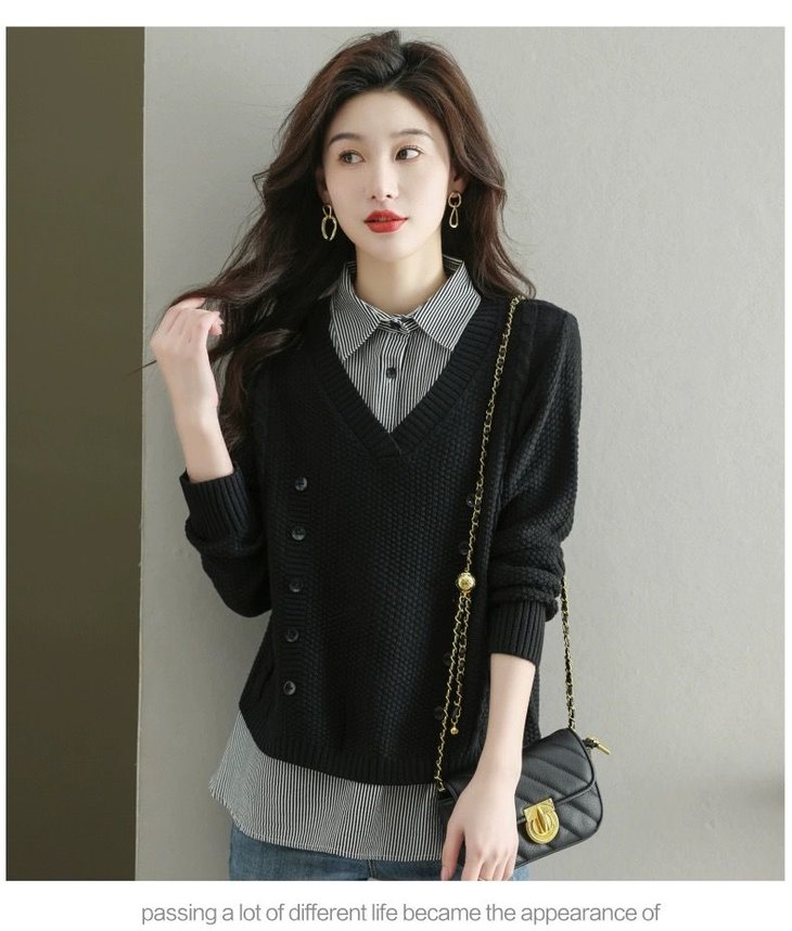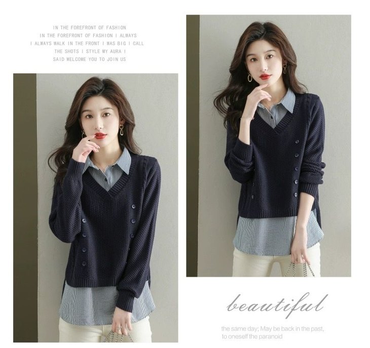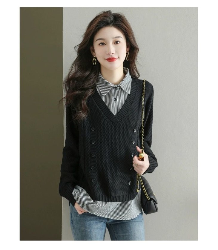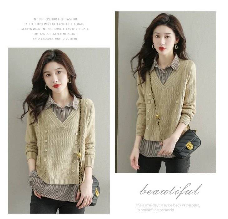 假两件上衣女士春秋常规款针织衫秋装2023新款宽松洋气衬衫领毛衣DD