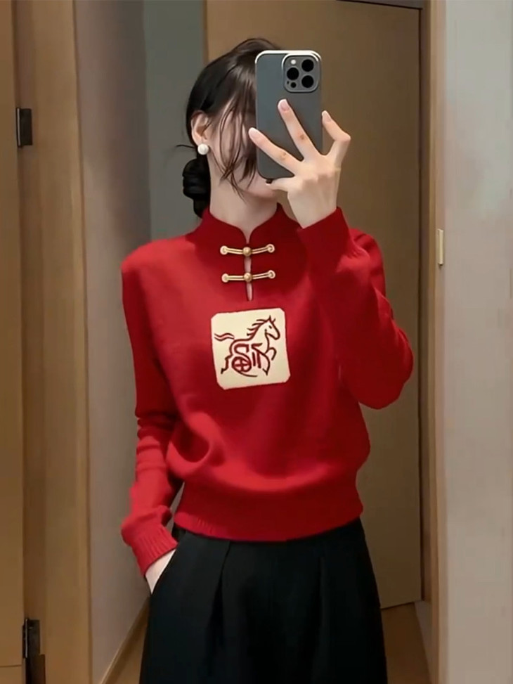 新中式国风盘扣红色新年毛衣,宽松百搭本命年马年针织衫