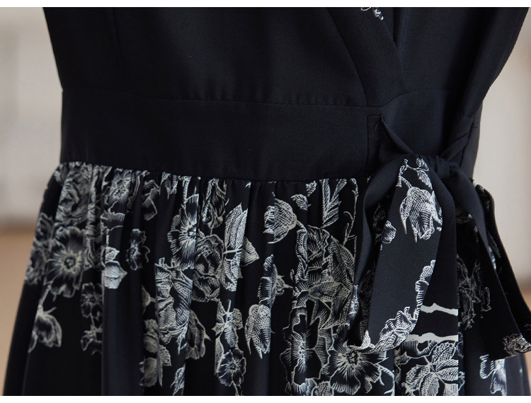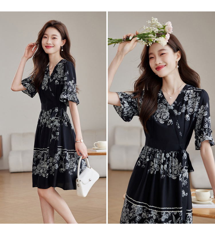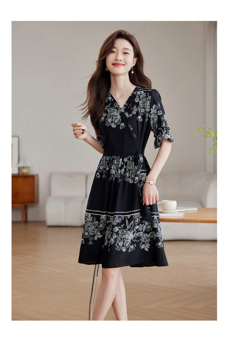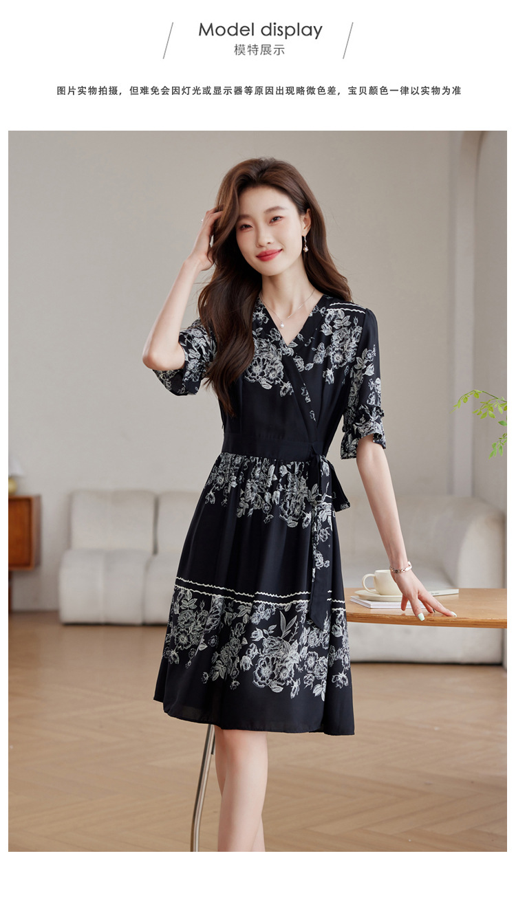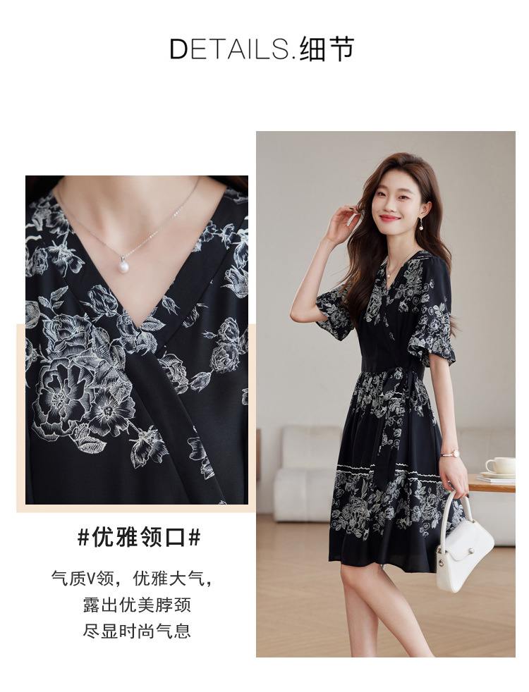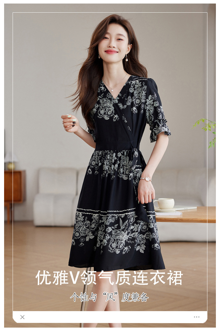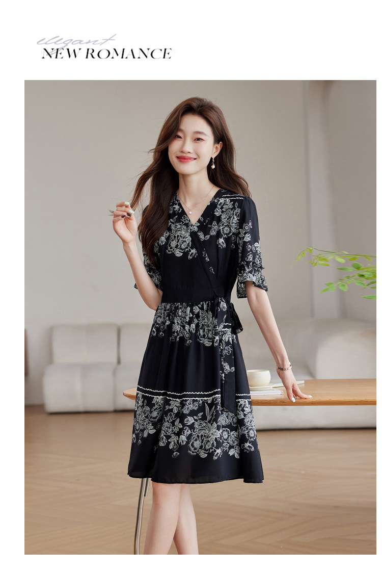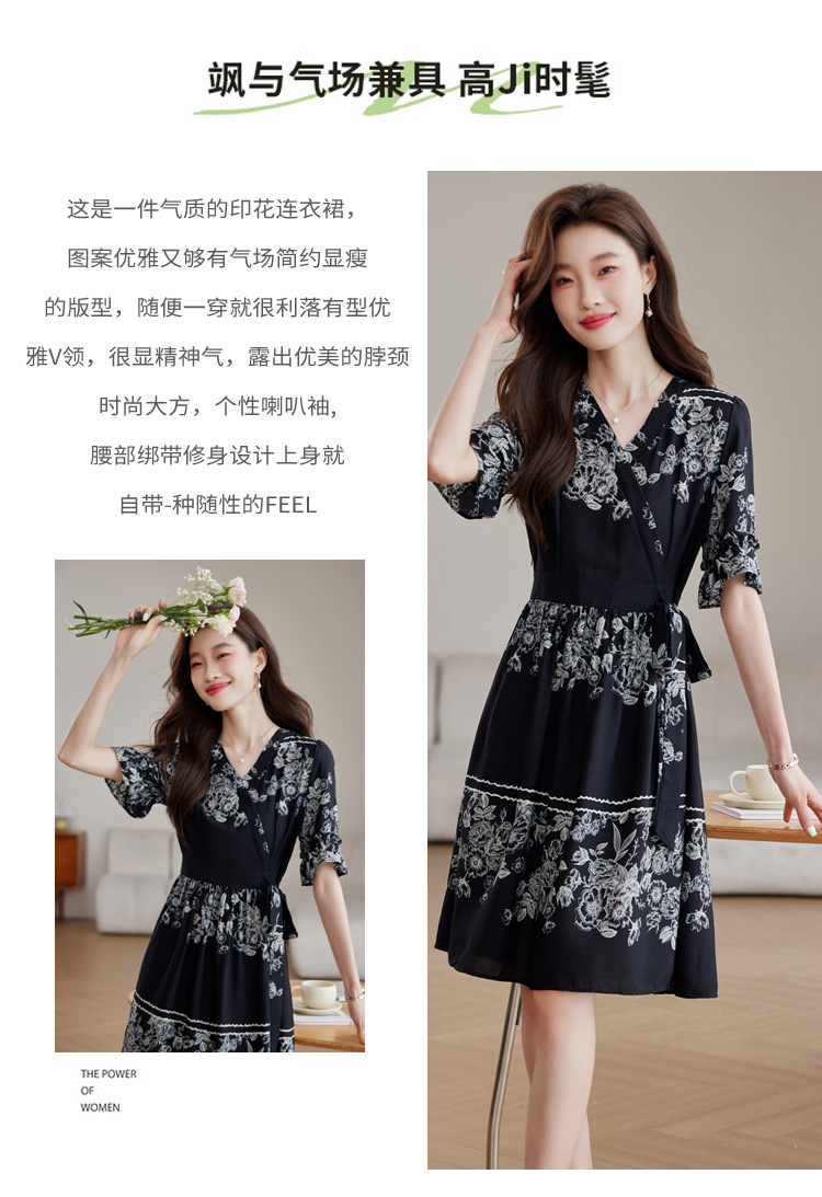 雀说新款时尚潮流短袖V领优雅气质系带裙子黑色印花连衣裙AL8619