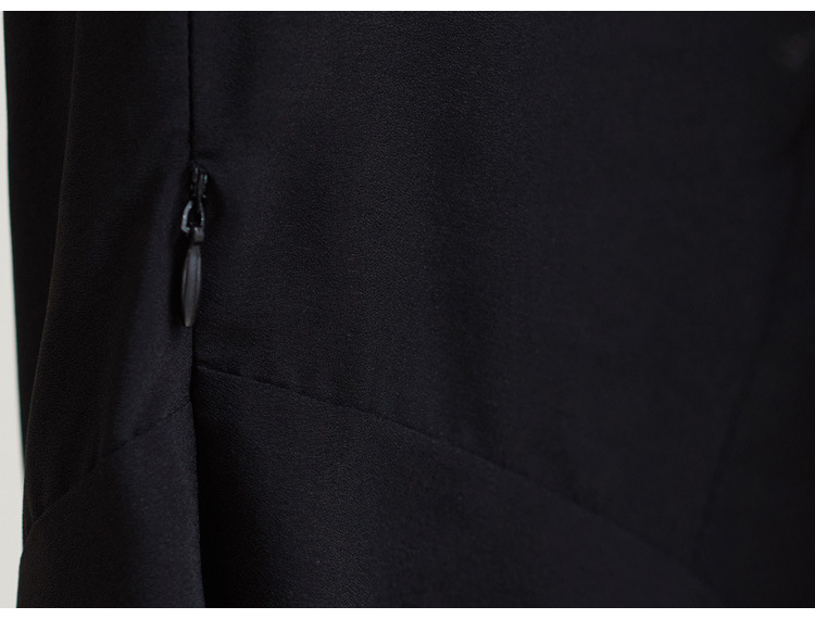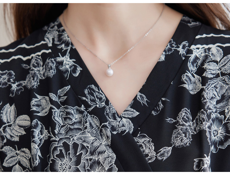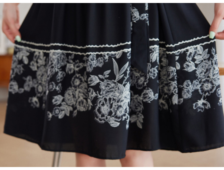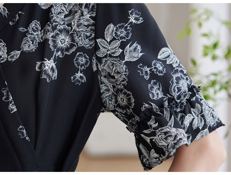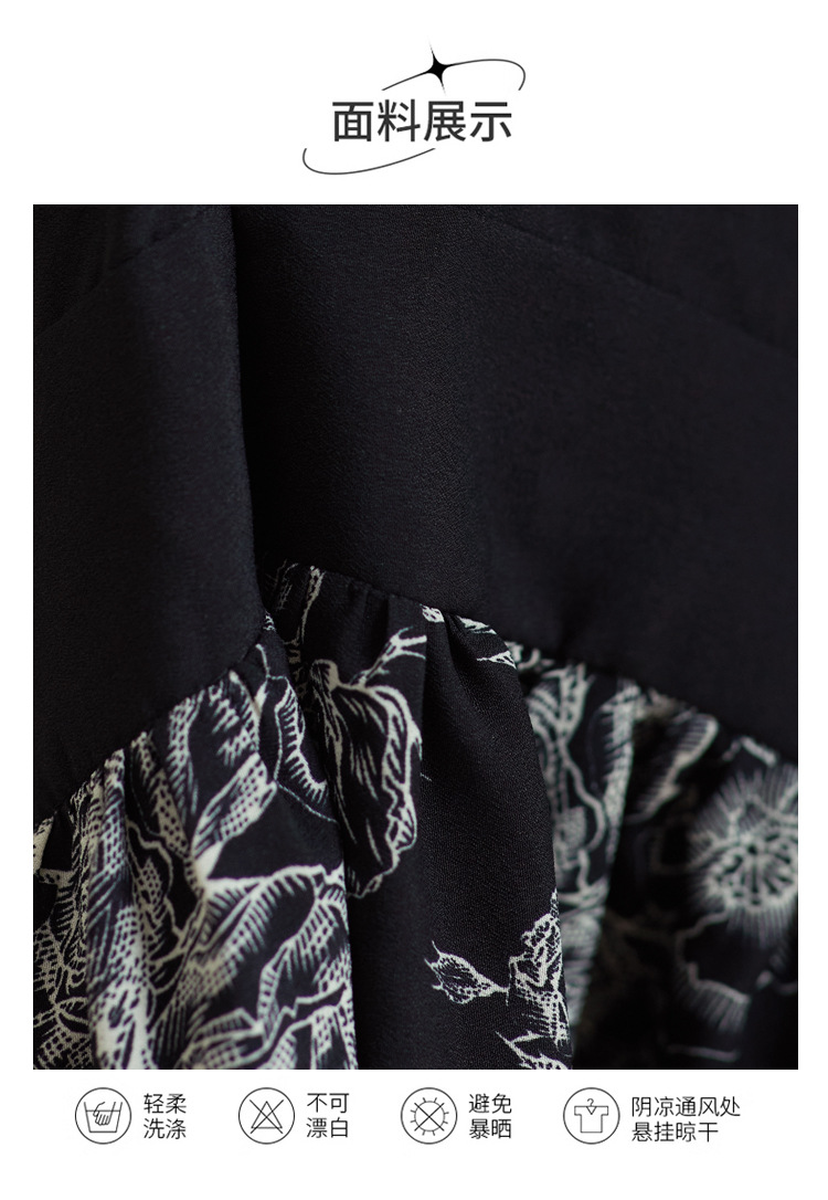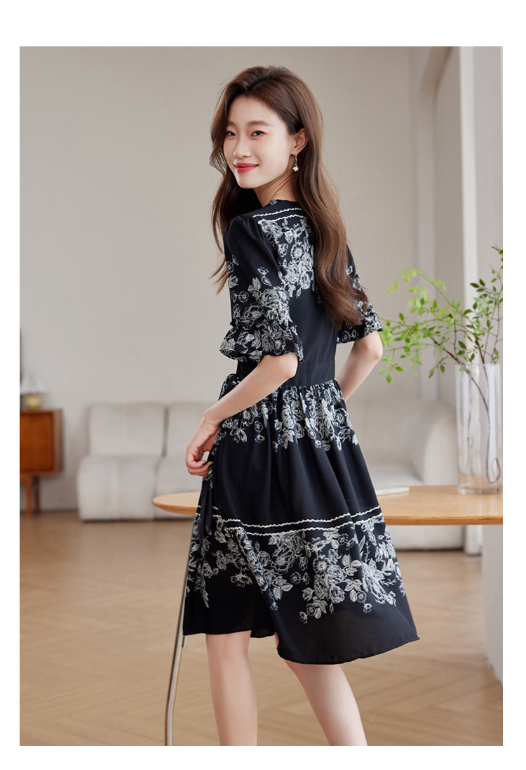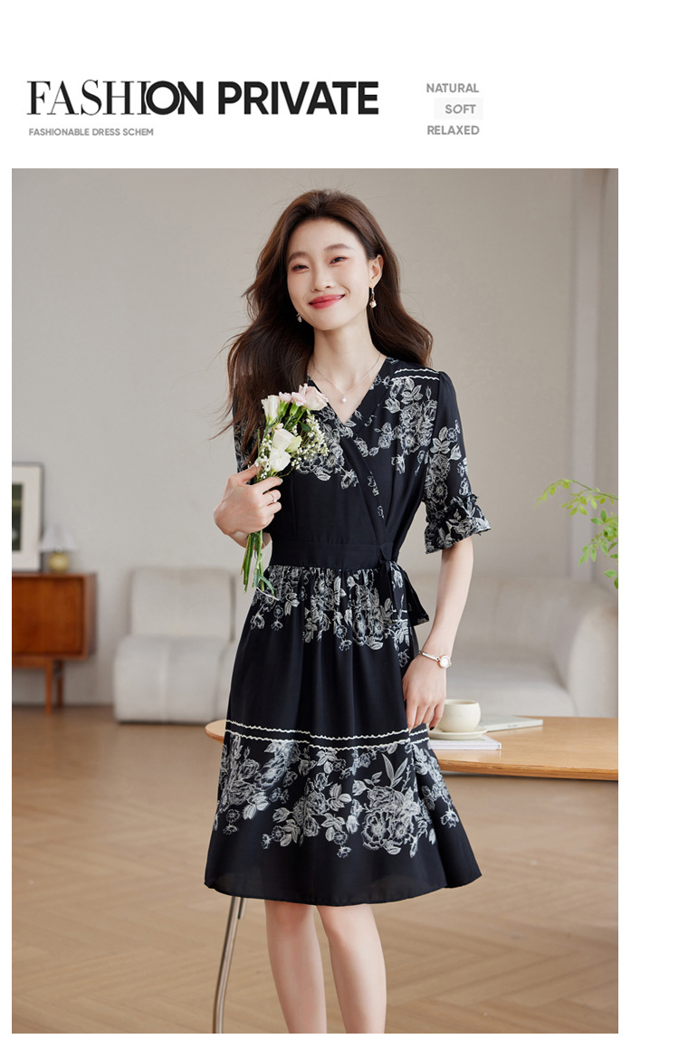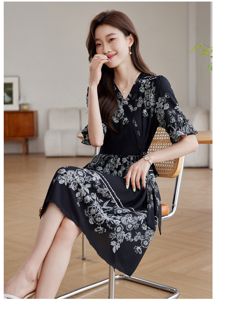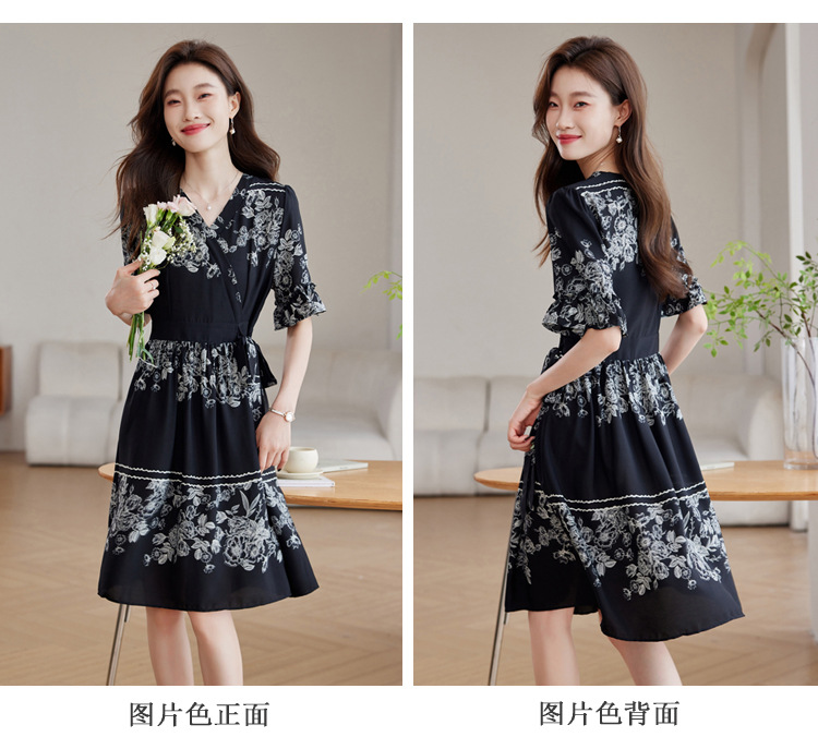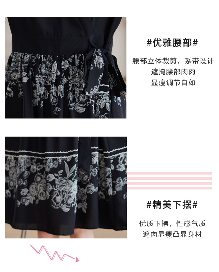 雀说新款时尚潮流短袖V领优雅气质系带裙子黑色印花连衣裙AL8619