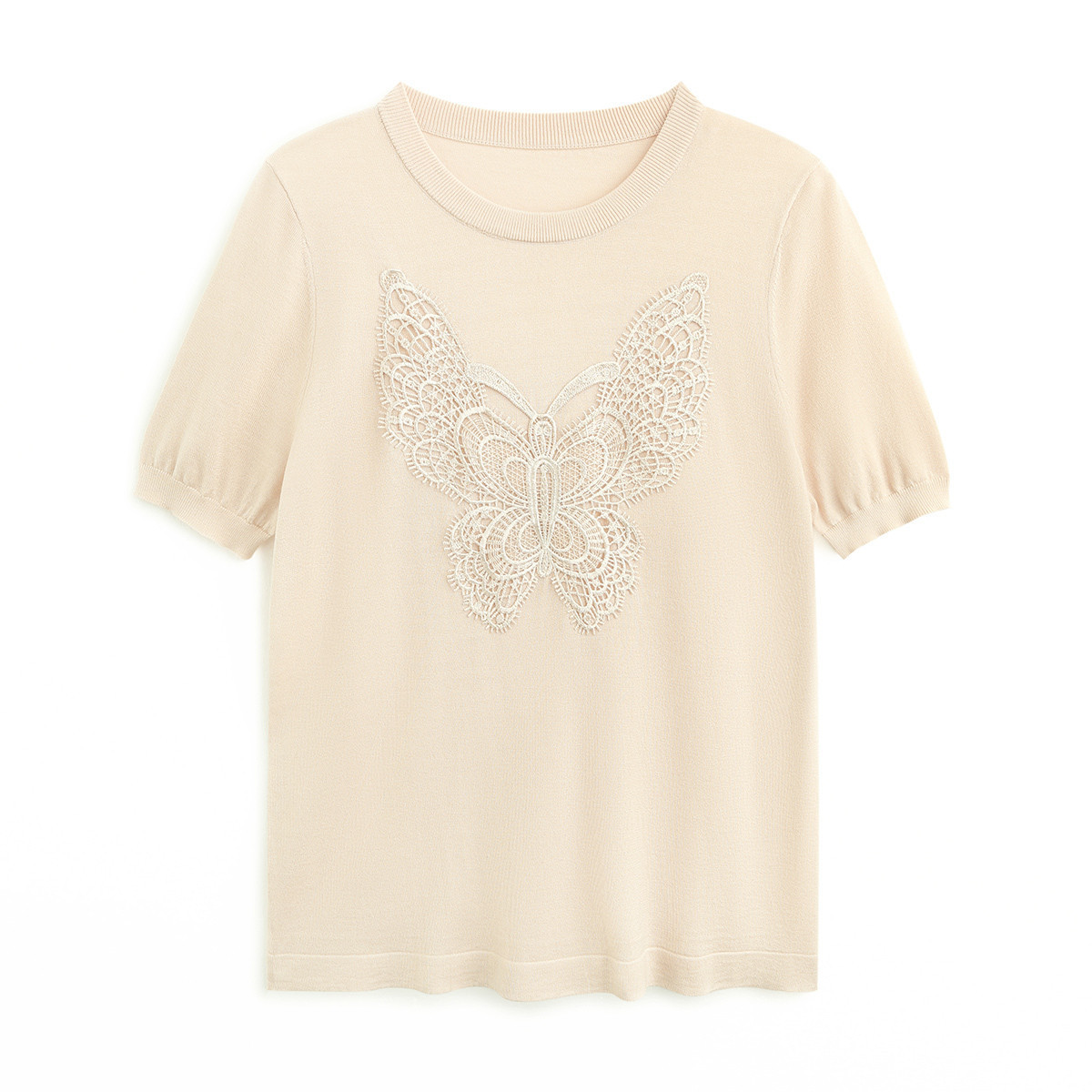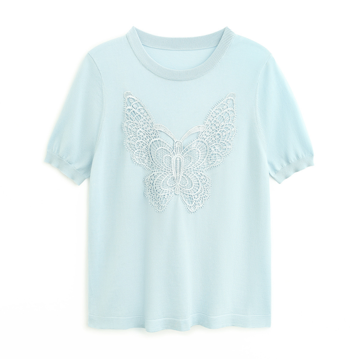 PALUOPO/PL重工刺绣圆领时尚蝴蝶短袖龄舒适含桑蚕丝针织T恤ES251150Z